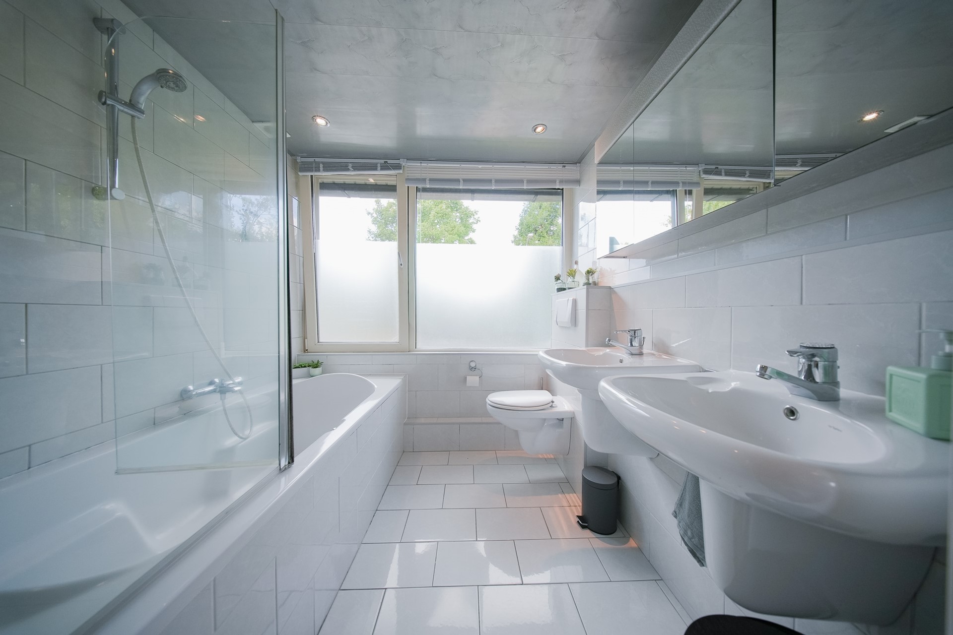 Volledig betegelde badkamer met bad, wastafel met meubel, wandmeubel, hang closet, inbouwspots, rolluik en afzuiging.
