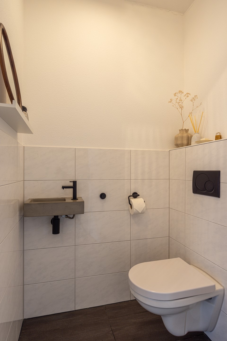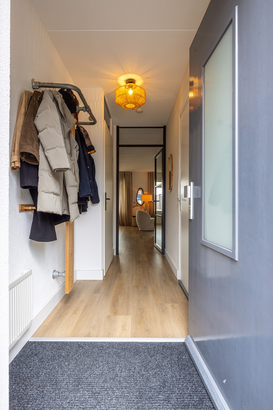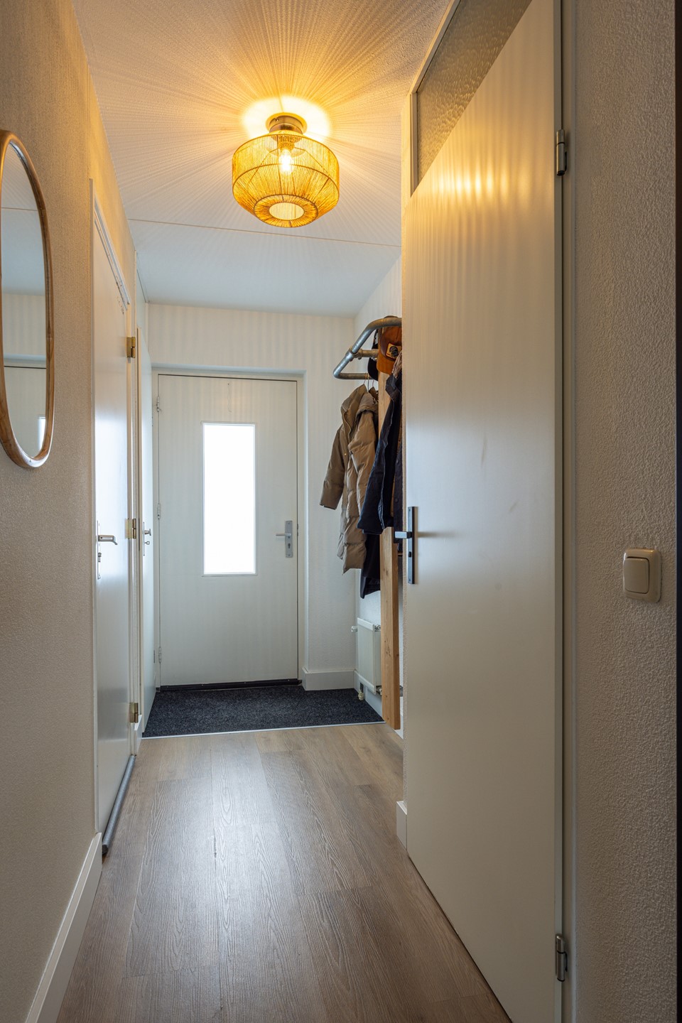Via de verzorgde voortuin en ruime oprit bereik je de entree van de woning. In de ontvangsthal ligt een pvc vloer in een warme kleur, die direct een prettige eerste indruk geeft. Hier bevinden zich de garderobe, de meterkast en het toilet, dat is uitgevoerd met een zwevend closet en een fonteintje.