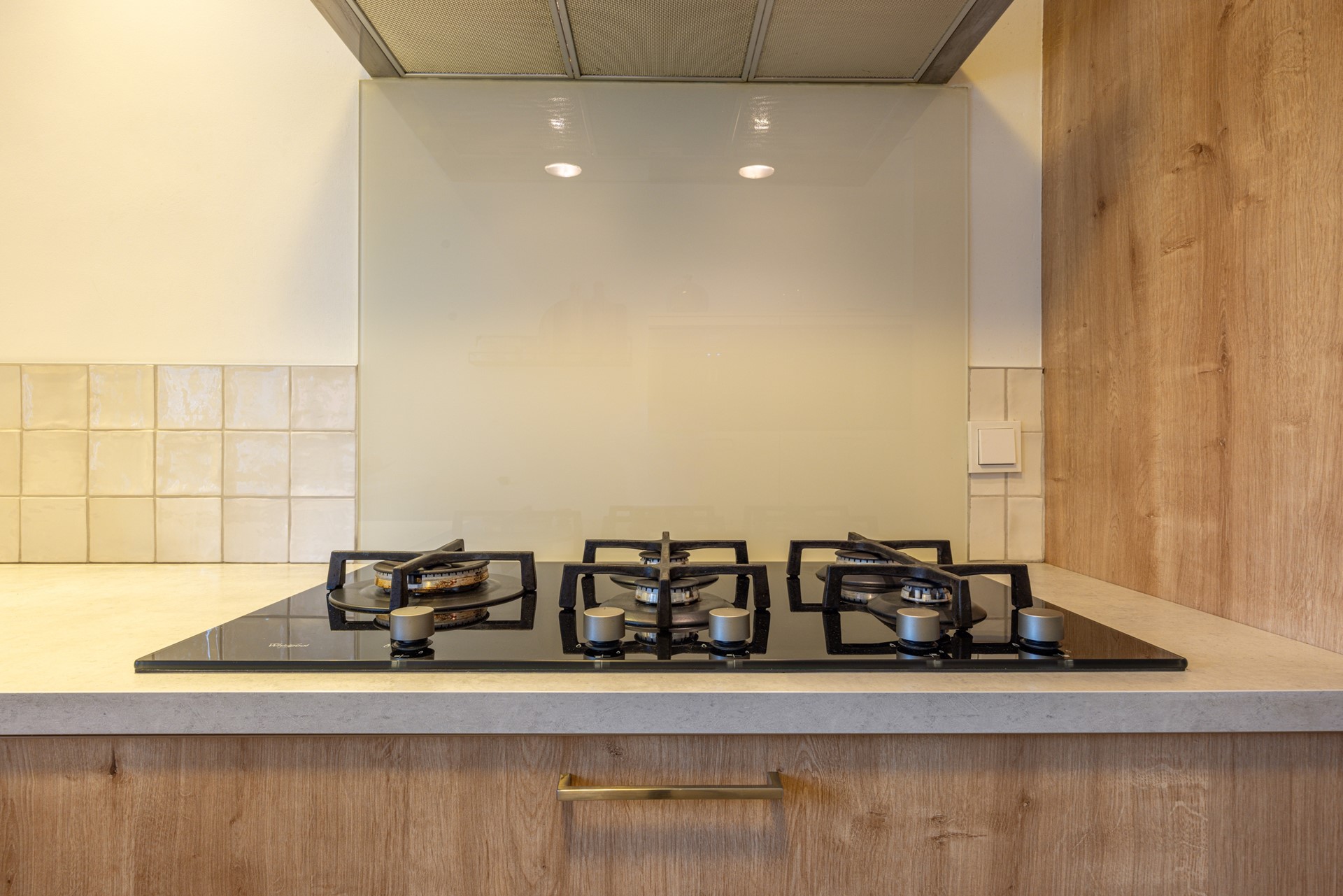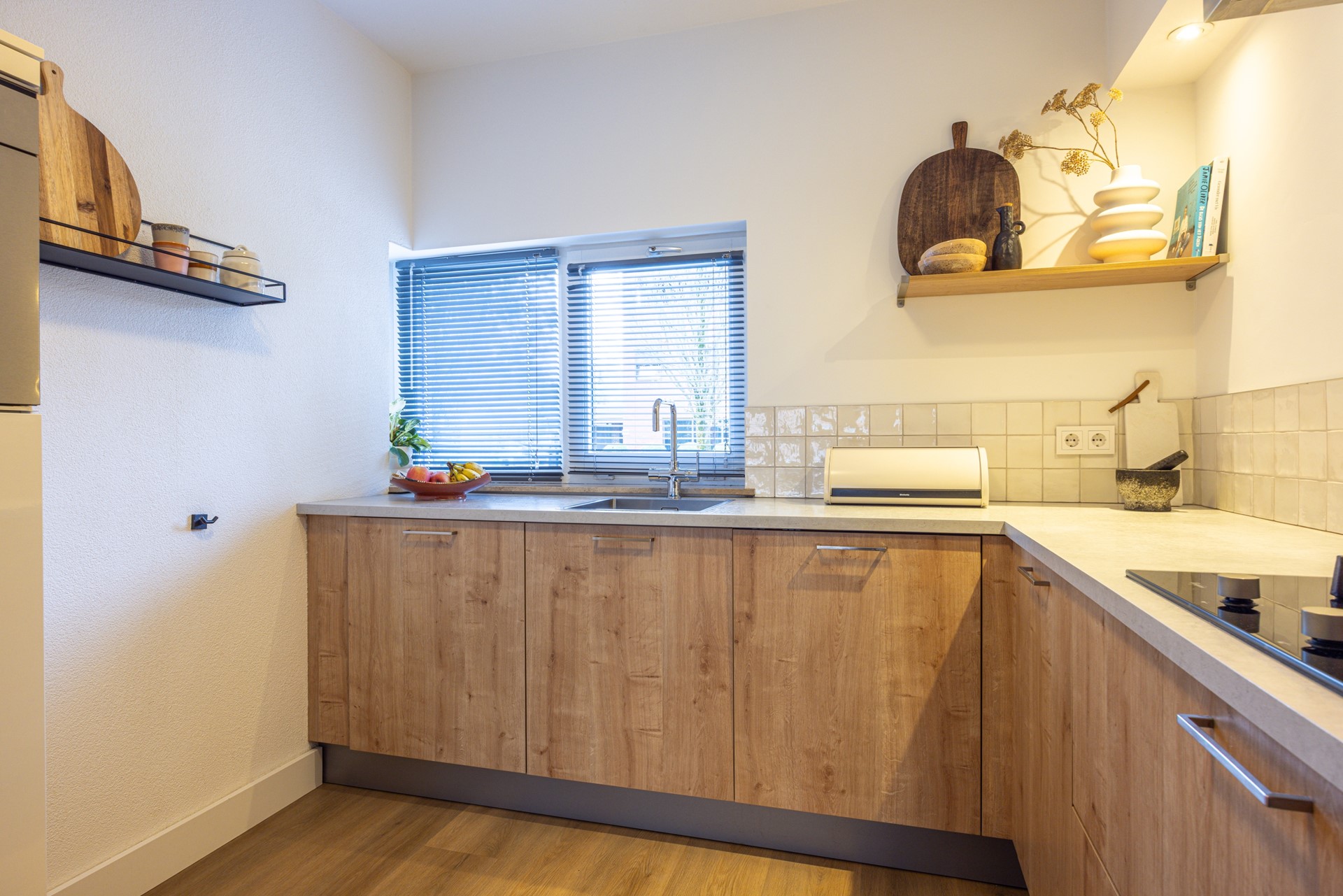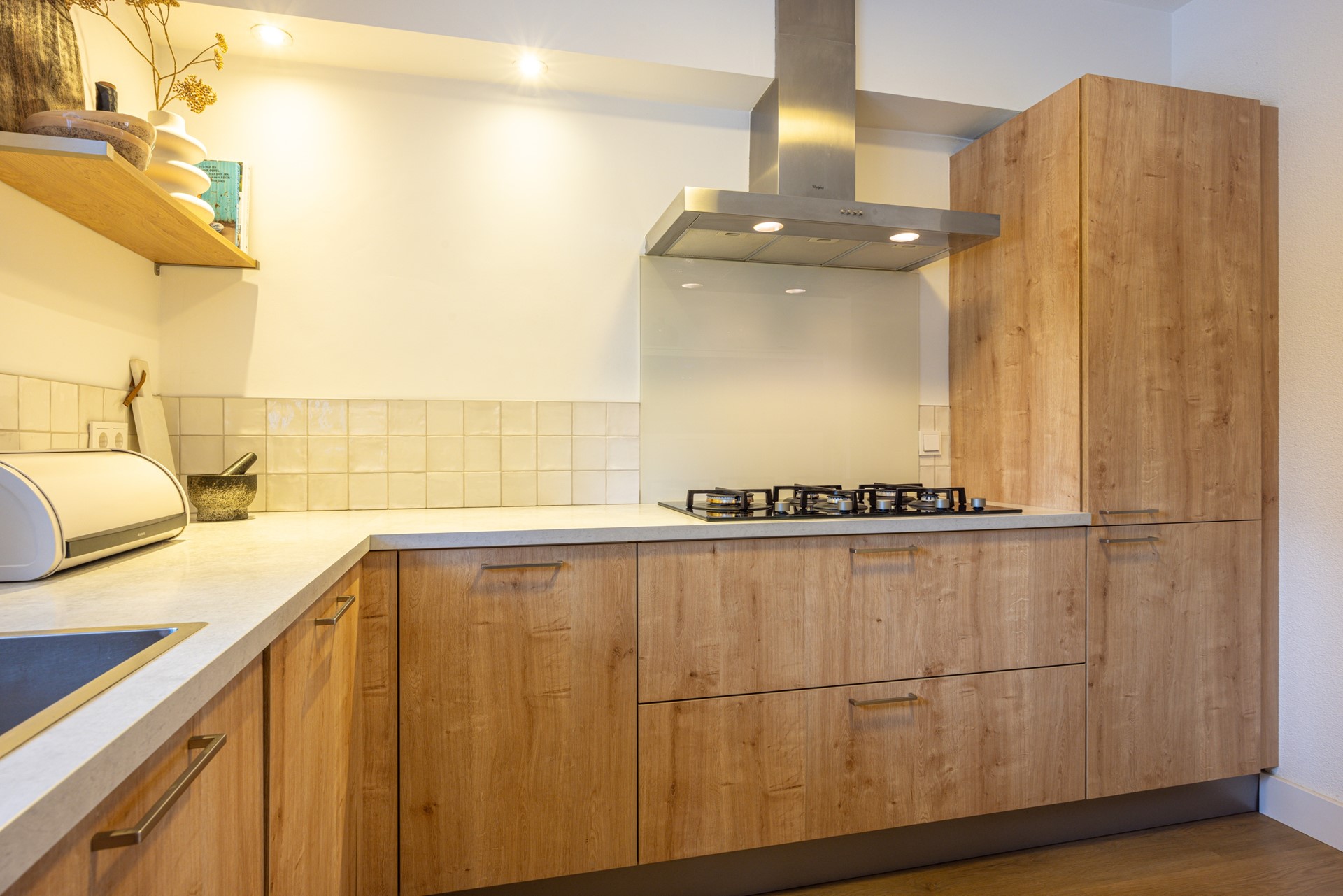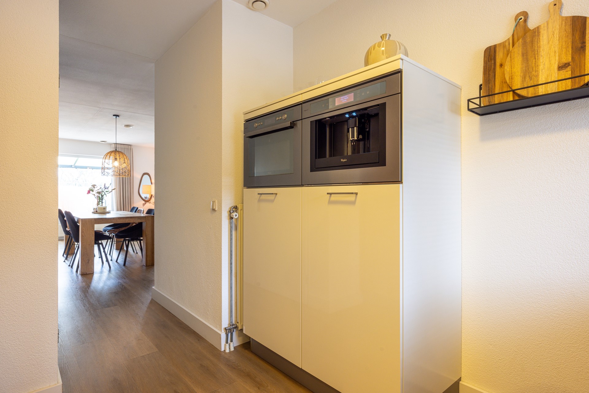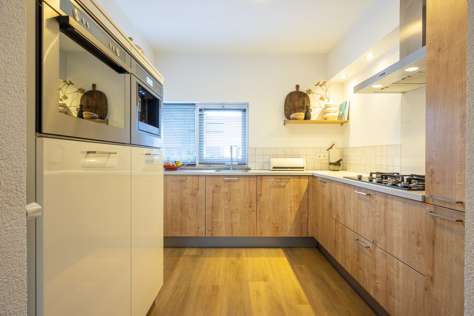 De open keuken bevindt zich aan de voorzijde van de woning en biedt uitzicht op de straat. De keuken is verzorgd en compleet uitgevoerd, met veel kast- en werkruimte. De aanwezige inbouwapparatuur bestaat uit een 5-pits gasfornuis, afzuigkap, combi heteluchtoven, koelkast, vaatwasser en een inbouw koffiemachine. Ook hier loopt de pvc vloer door, wat zorgt voor een rustige en uniforme uitstraling.