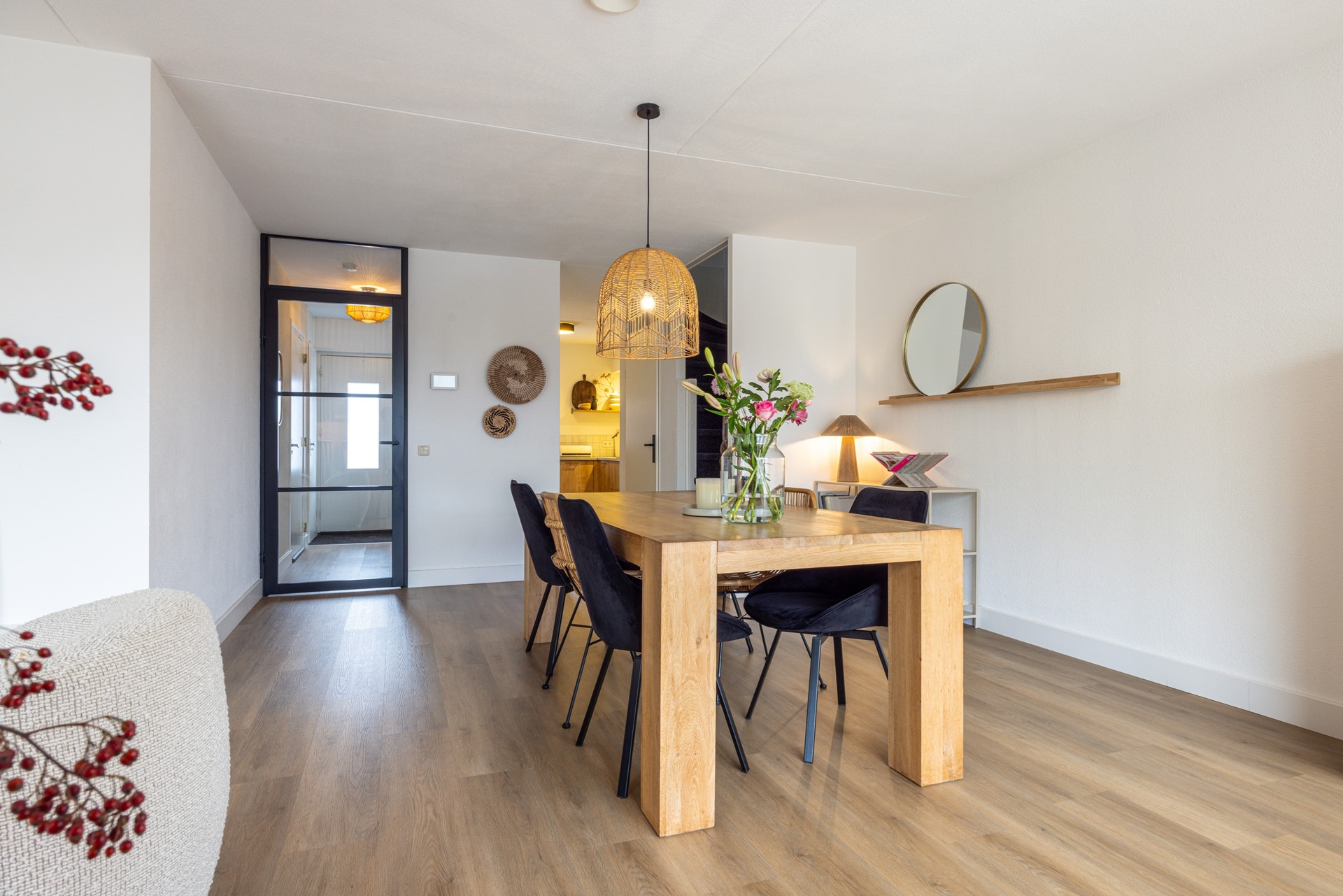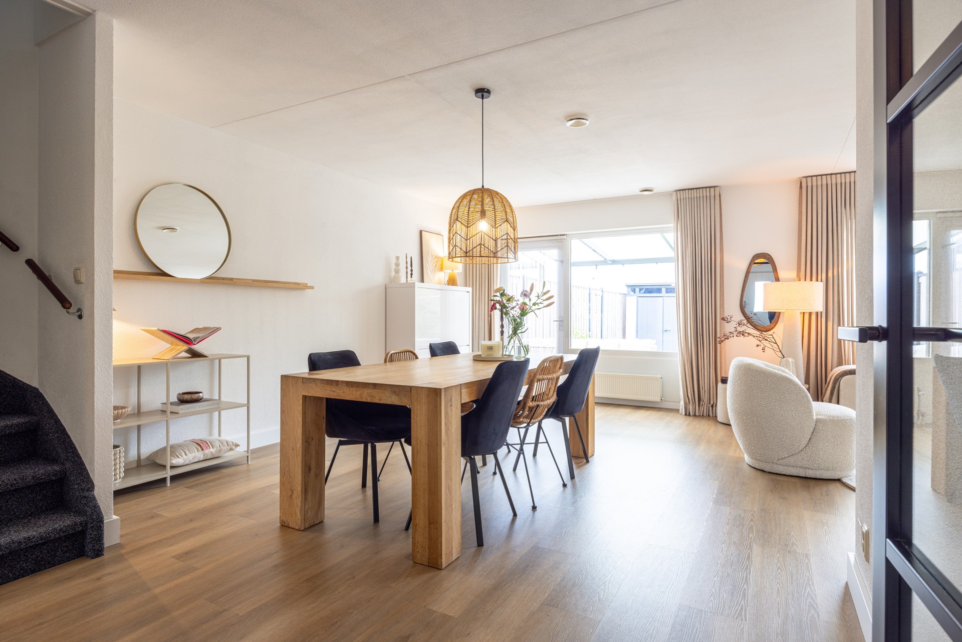 De woonkamer is bereikbaar via een stijlvolle deur en vormt het hart van de woning. De ruimte is royaal opgezet en afgewerkt met dezelfde pvc vloer, wat zorgt voor een mooi geheel. Dankzij de grote raampartijen aan de achterzijde komt er veel daglicht binnen, wat de ruimte een open en lichte uitstraling geeft. Aan de achterzijde zijn elektrische rolluiken aanwezig. Daarnaast is er een praktische berging onder de trap.