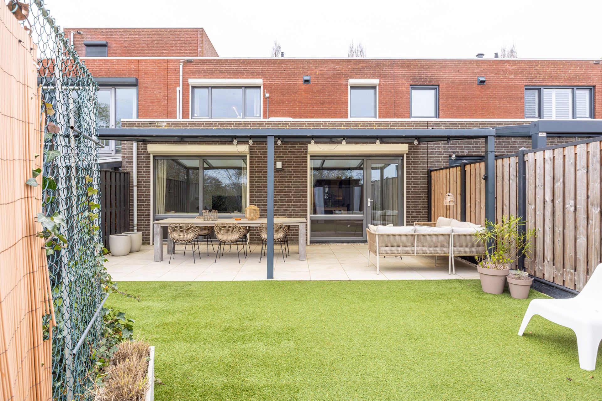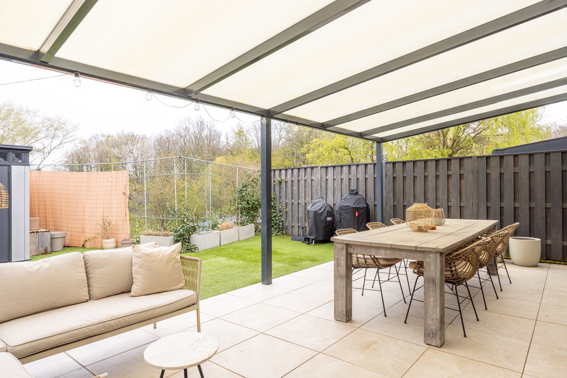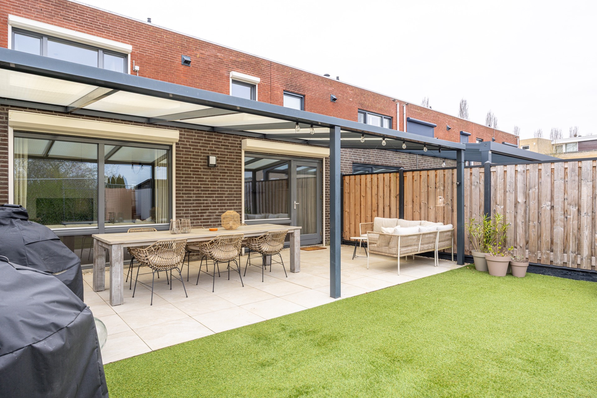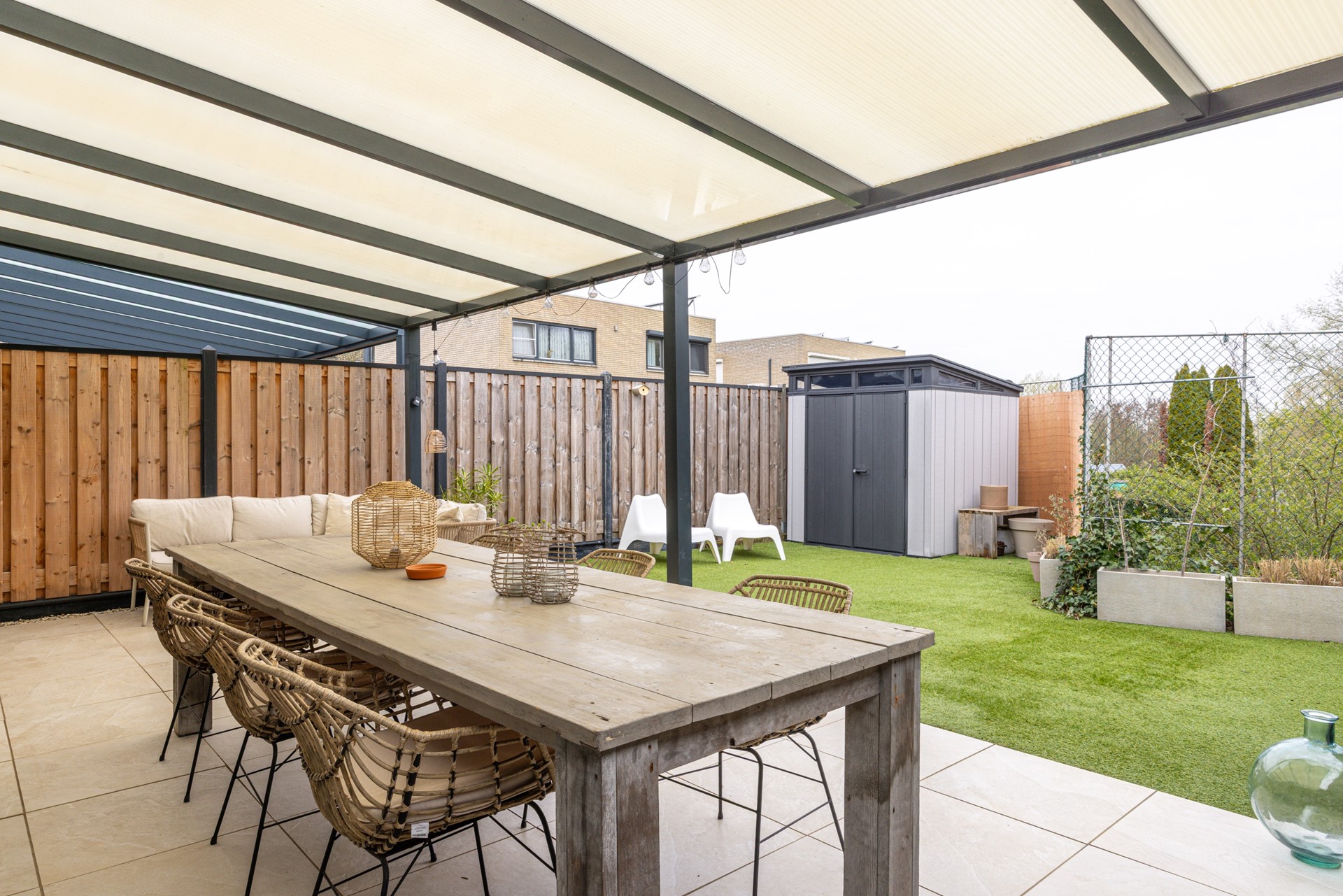 De achtertuin is netjes aangelegd en biedt een fijne combinatie van comfort en gebruiksgemak. Direct achter de woning bevindt zich een ruim overdekt terras, waar je al vroeg in het seizoen beschut kunt zitten en tot in de avond kunt genieten van het buitenleven.