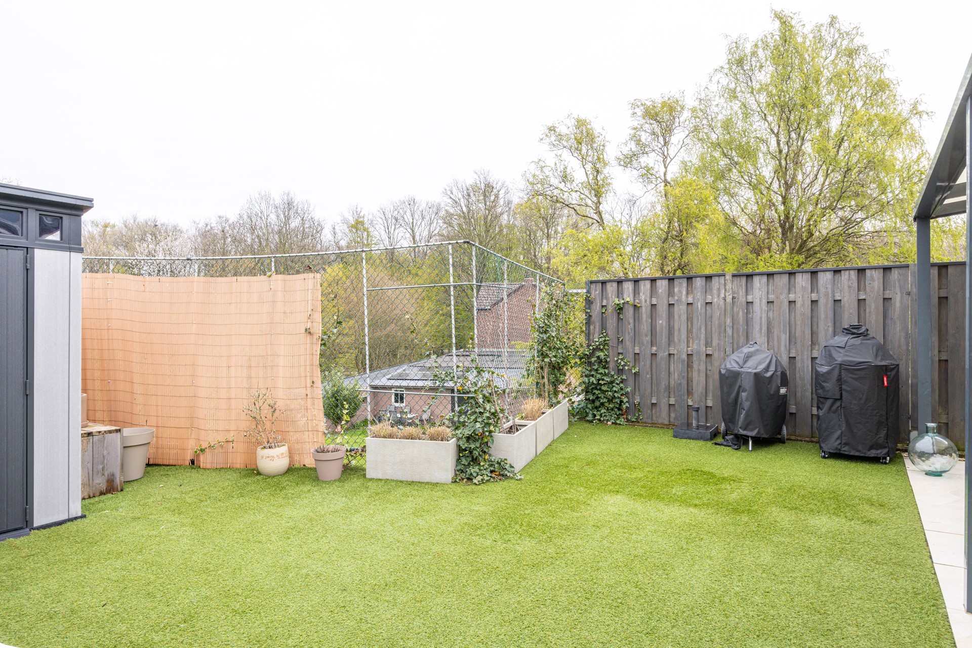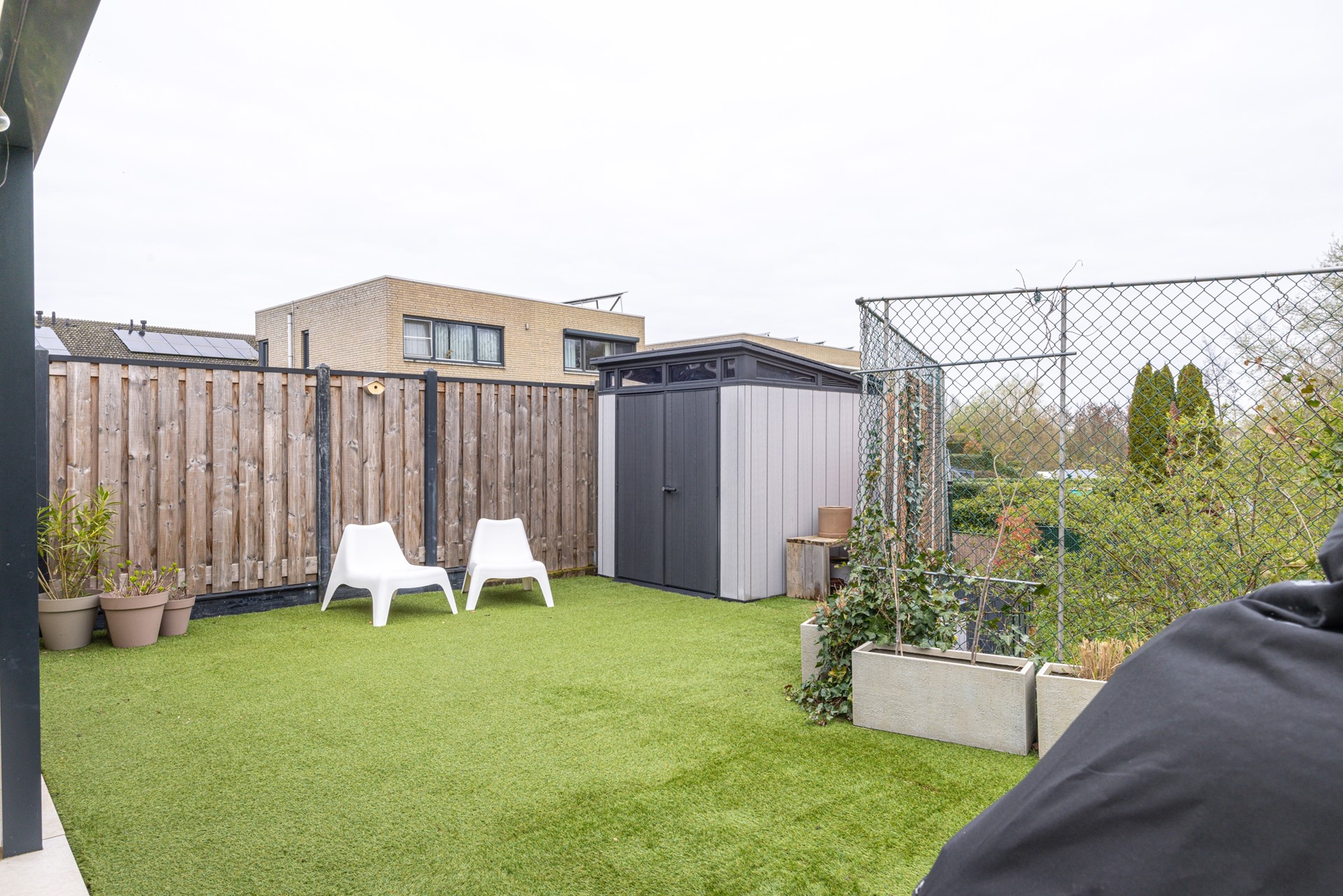 De tuin is grotendeels voorzien van kunstgras, wat zorgt voor een onderhoudsvriendelijk geheel met een verzorgde uitstraling. Achterin de tuin staat een tuinhuis dat ideaal is voor het opbergen van tuingereedschap of andere spullen.