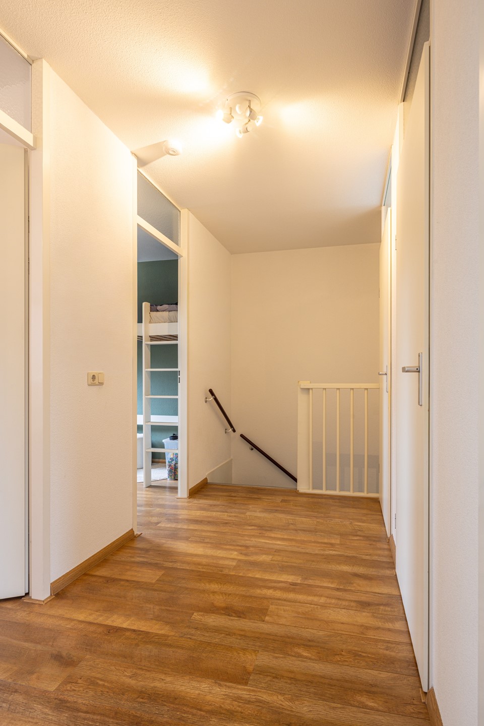 Via de trap in de woonkamer bereik je de eerste verdieping. De overloop is breed opgezet en afgewerkt met een laminaatvloer. Vanuit hier zijn drie slaapkamers, de badkamer en een technische ruimte/bergruimte bereikbaar.