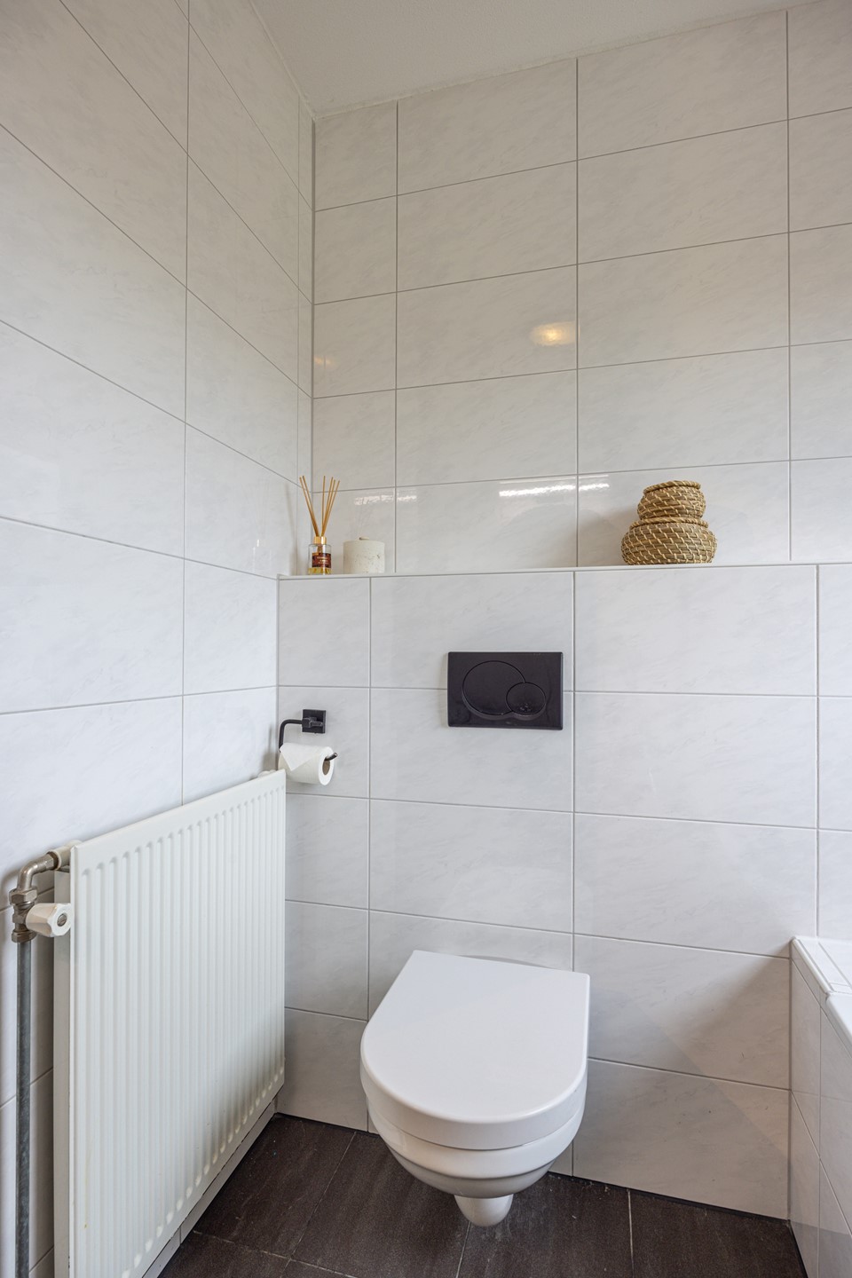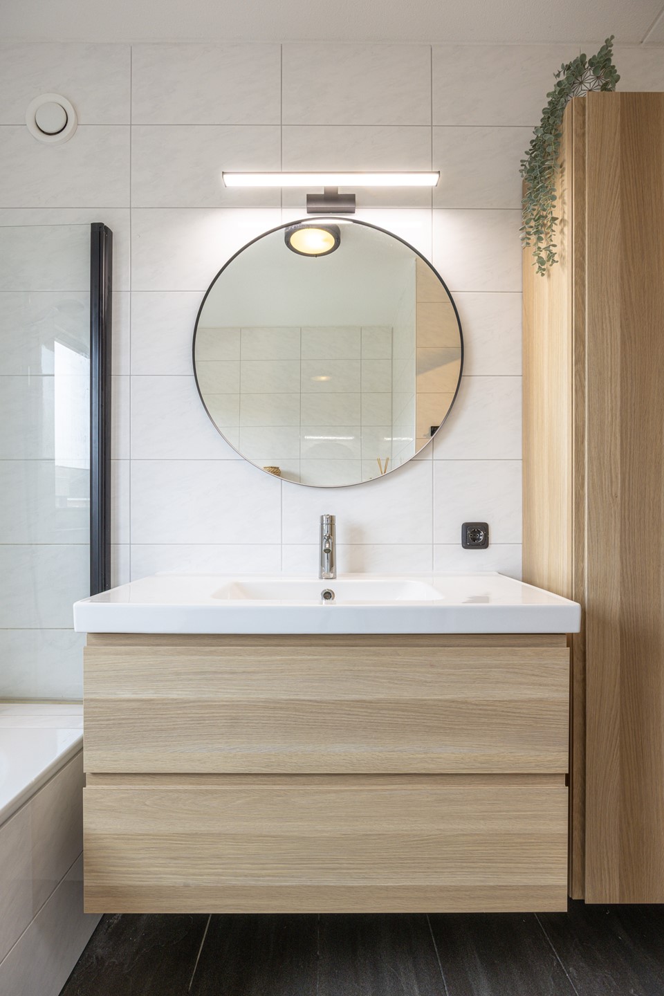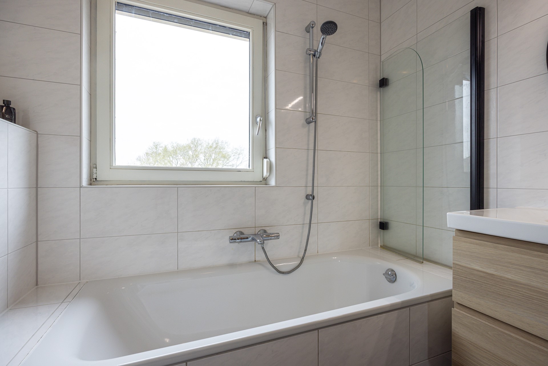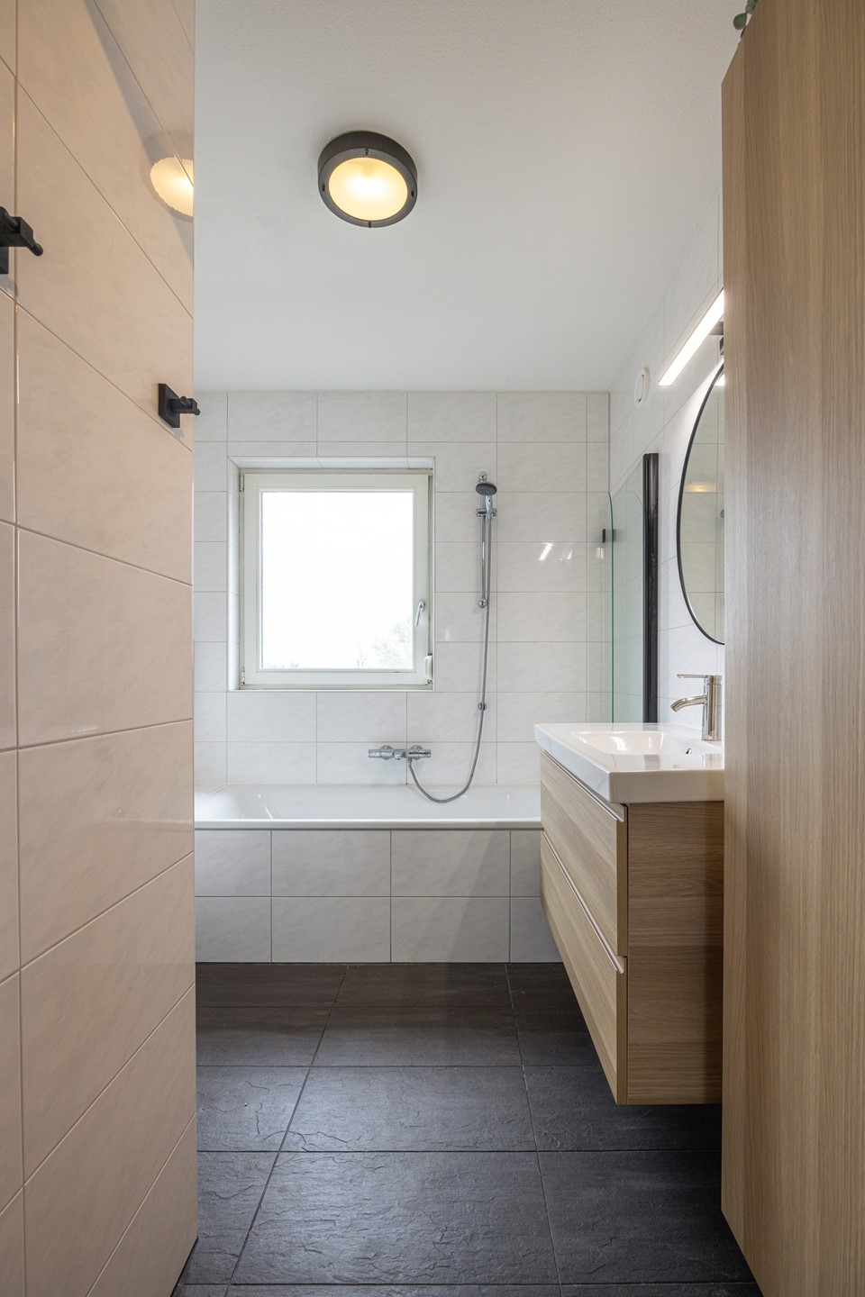 De badkamer is volledig betegeld en verzorgd uitgevoerd. Deze beschikt over een ligbad met douche en glazen douchewand, een badkamermeubel met wastafel en spiegel en een tweede toilet. Dankzij het aanwezige raam is er daglicht en natuurlijke ventilatie. Daarnaast is de badkamer voorzien van een rolluik, wat zorgt voor extra comfort en privacy.