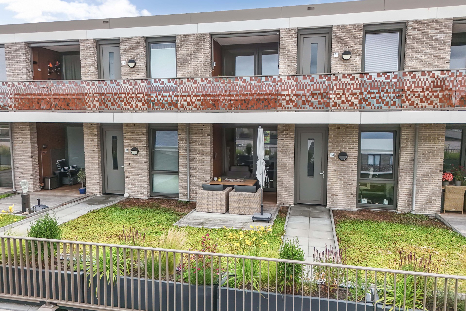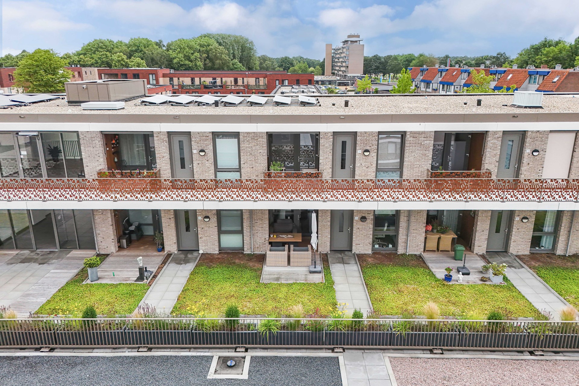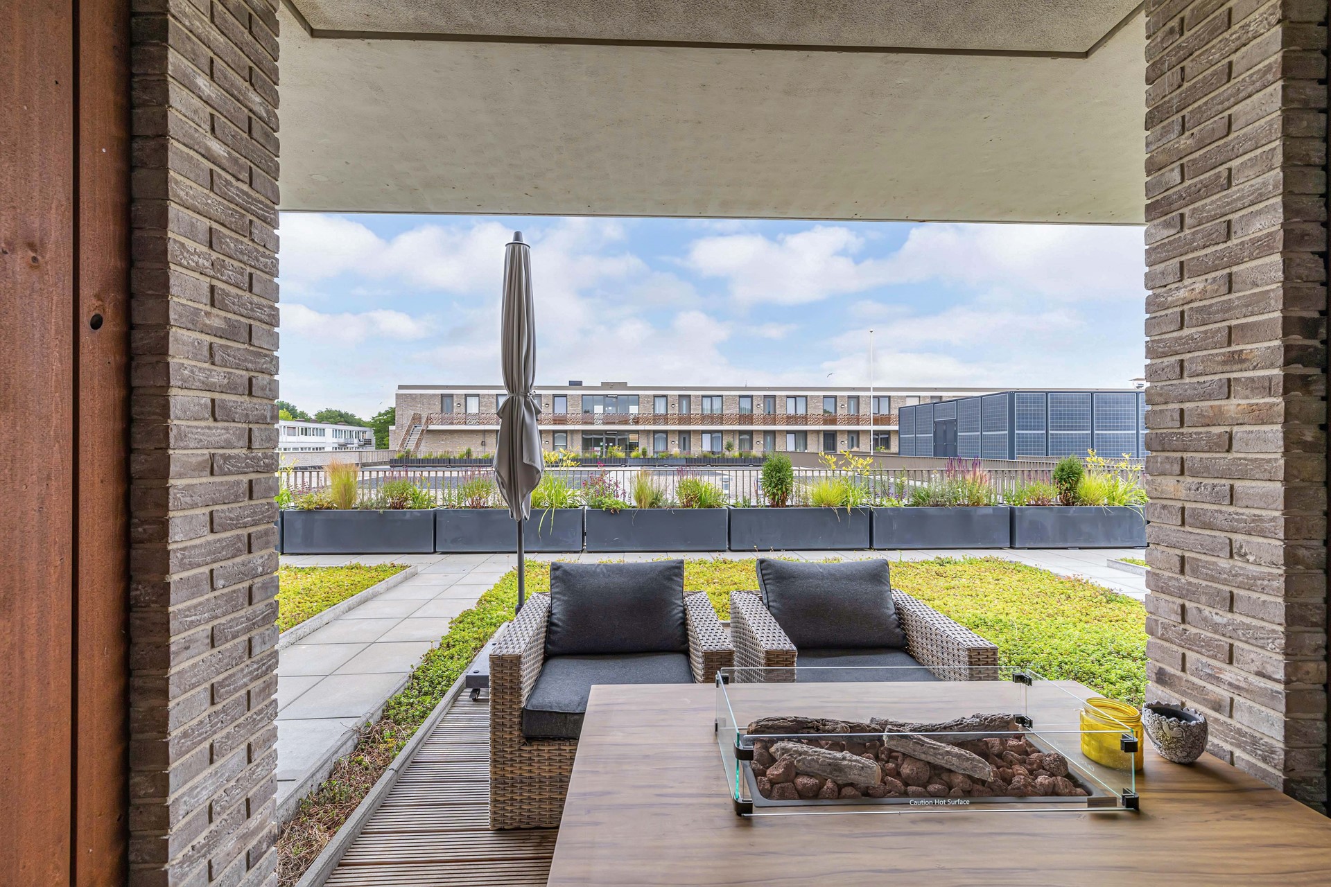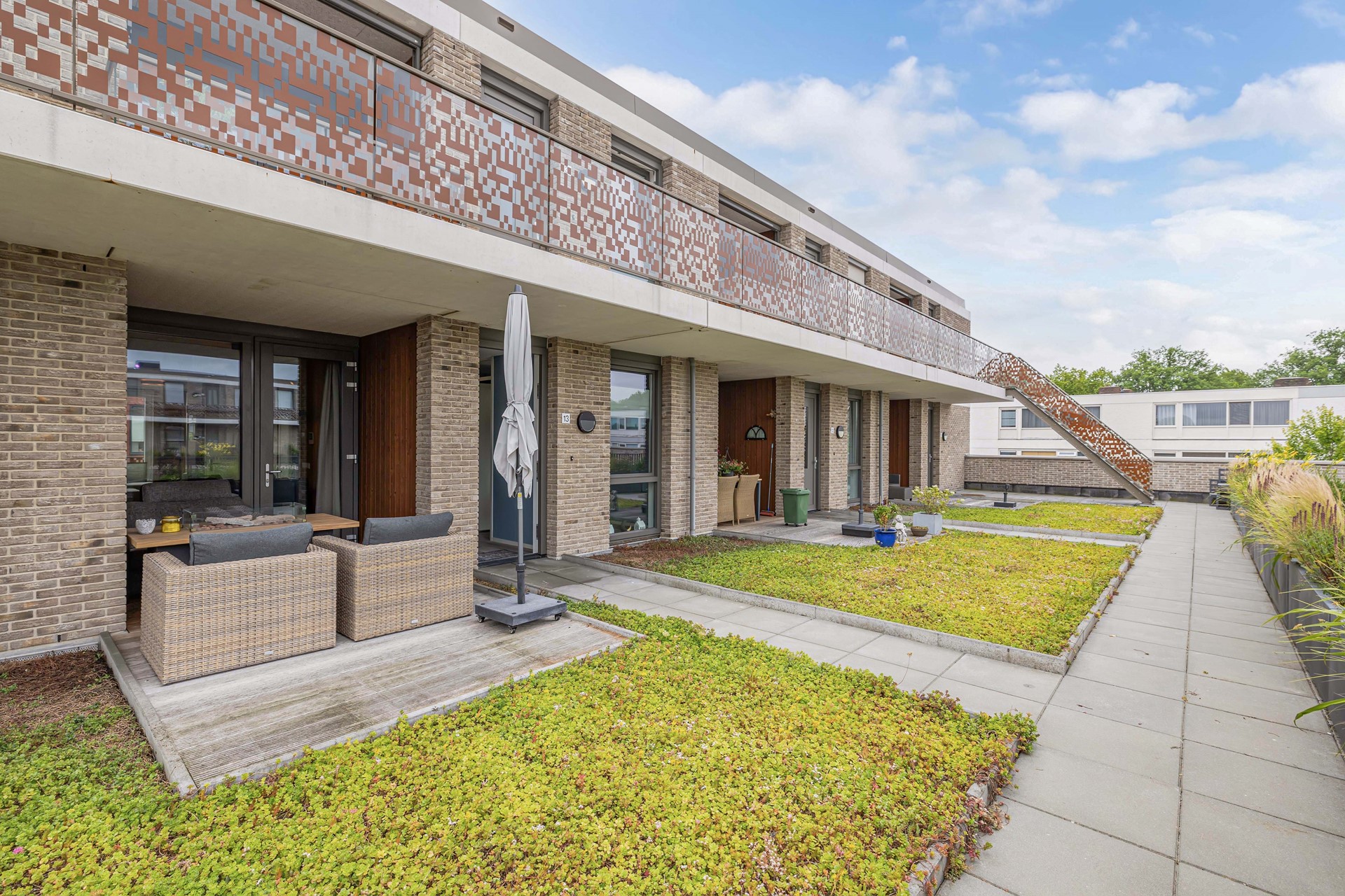 Aan de voorzijde van de woning bevindt zich een deels overdekt dakterras/-tuin op het westen, deze voelt door de groene omgeving meer aan als tuin dan als balkon.