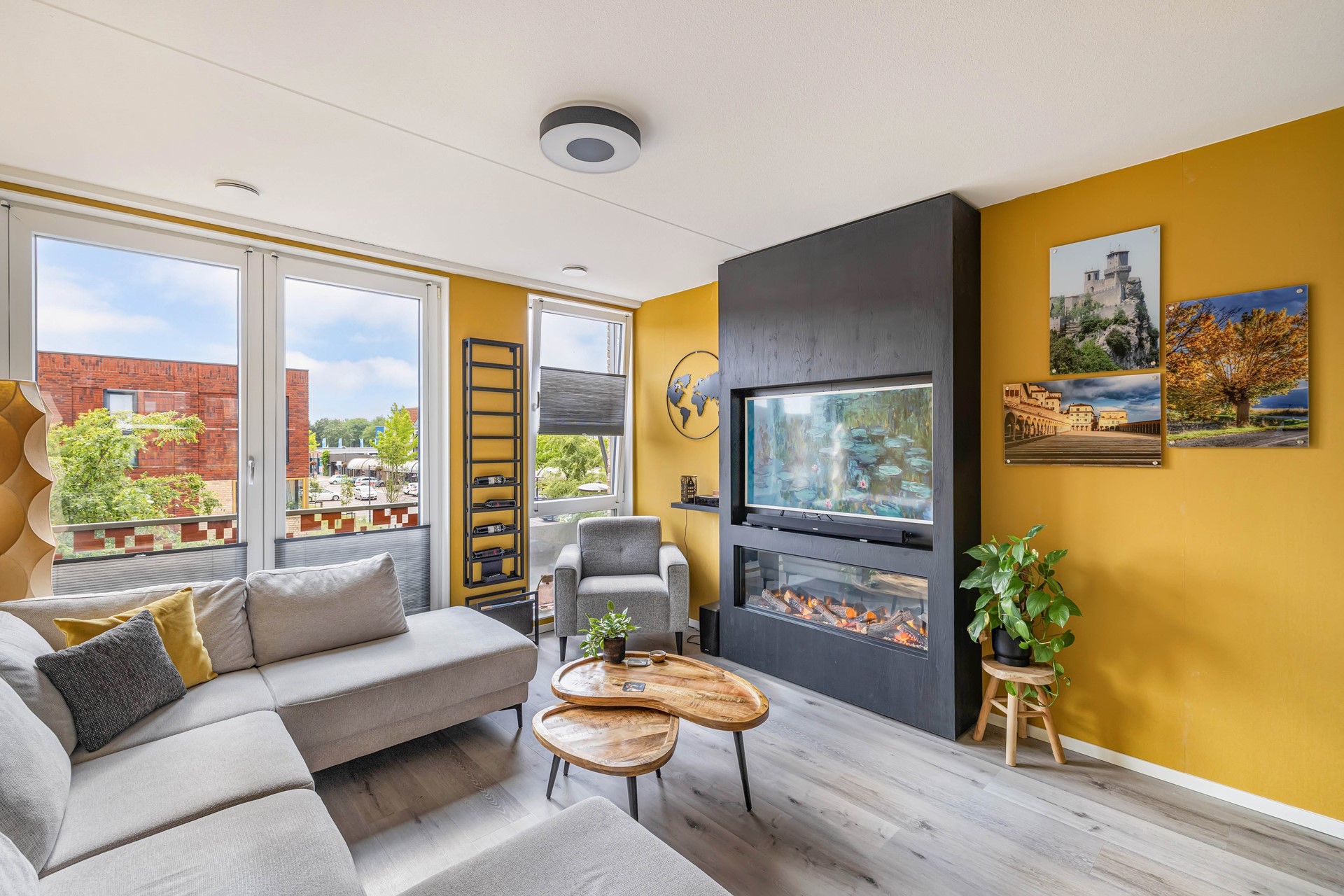 • Woonkamer (zitgedeelte) met elektrische haard en Frans balkon.