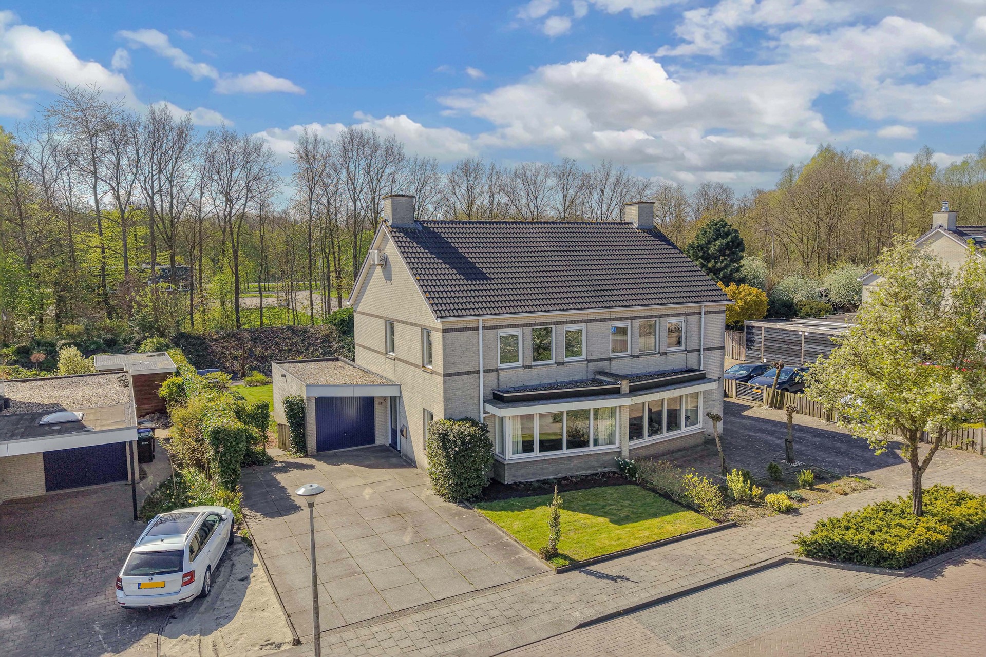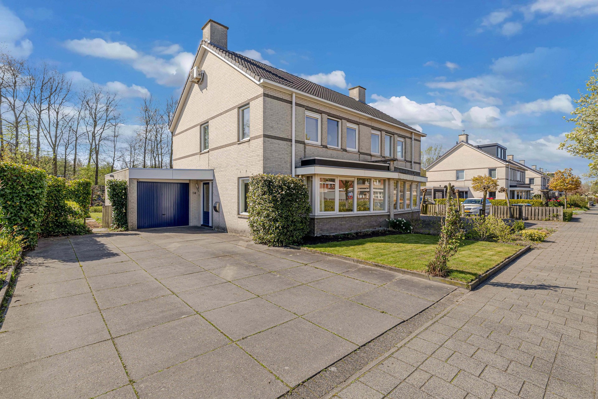 De voortuin van ca. 78 m² en de oprit zorgen voor een prettige afstand tot de straat en extra privacy. Daarnaast beschikt de woning over een aangebouwde stenen garage van ca. 18 m² en parkeergelegenheid op eigen terrein.