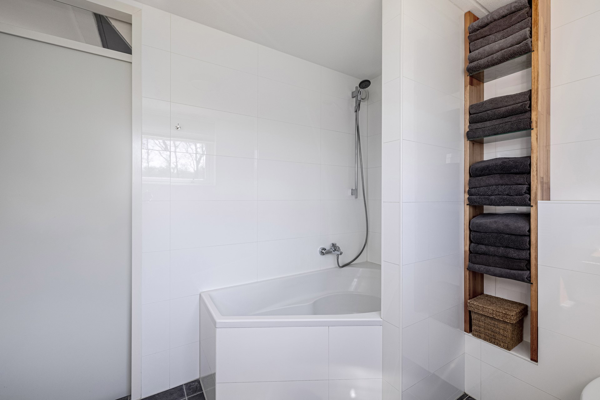 - Badkamer met ligbad/douche, toilet, dubbele wastafel en designradiator