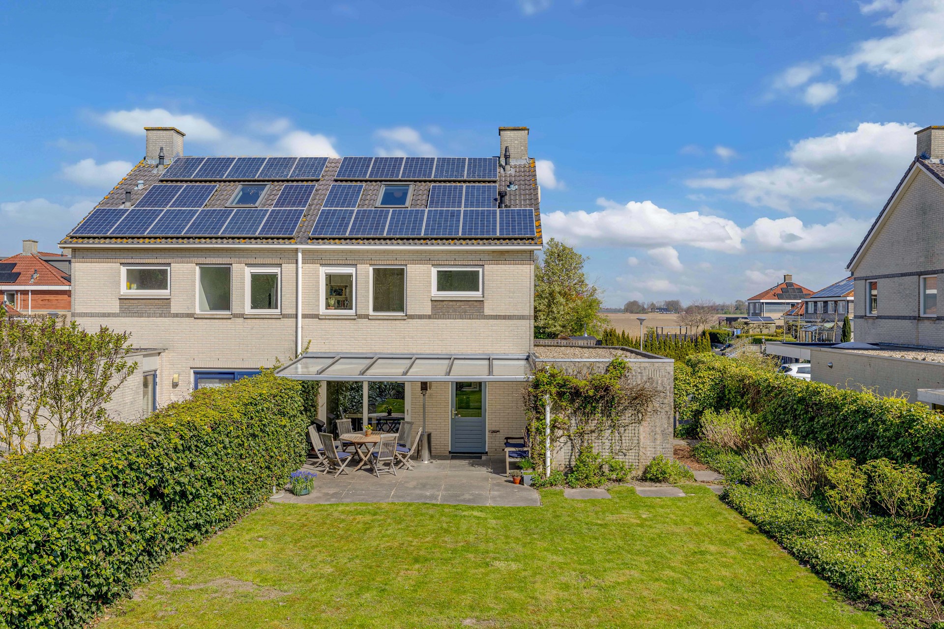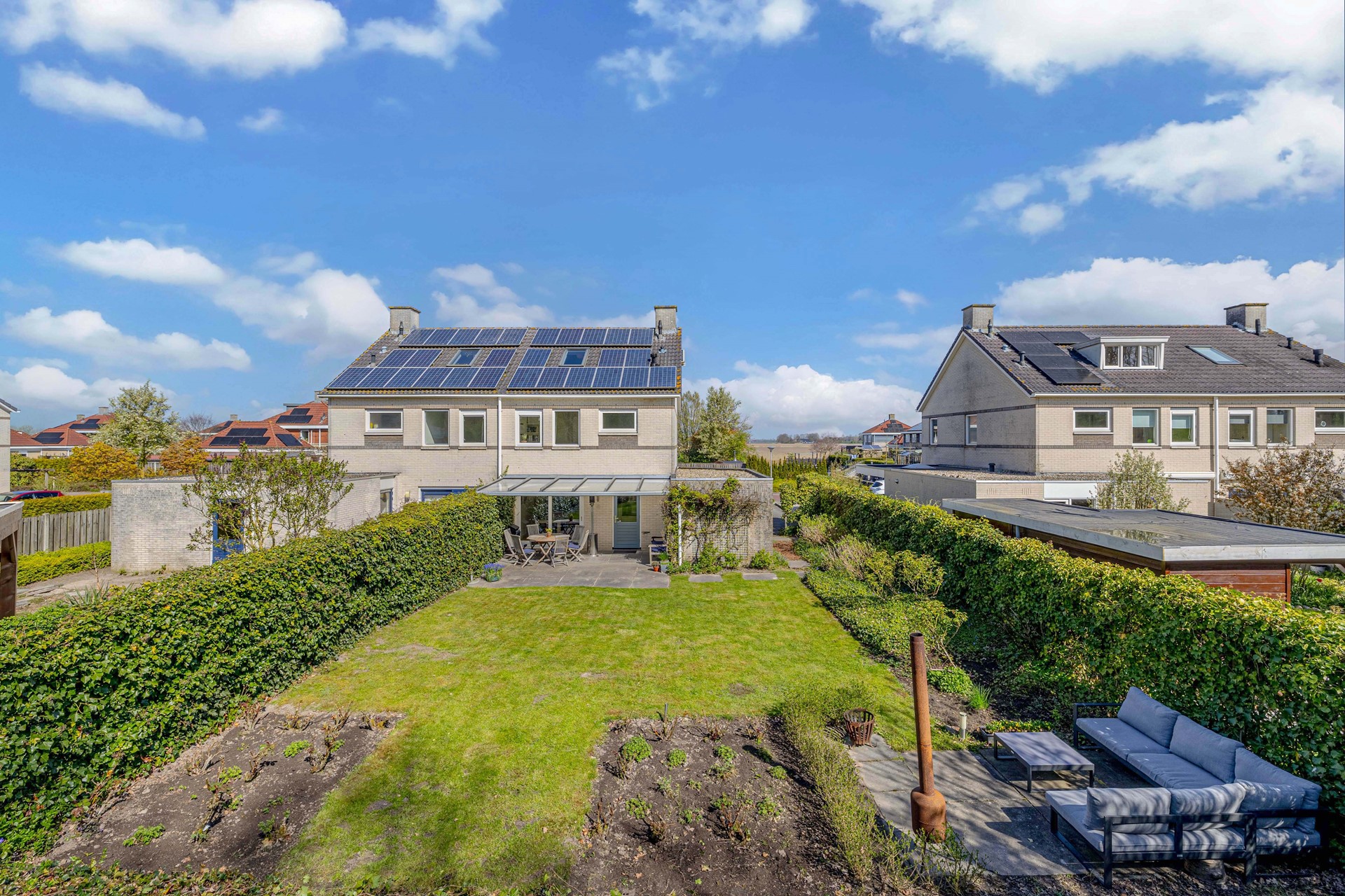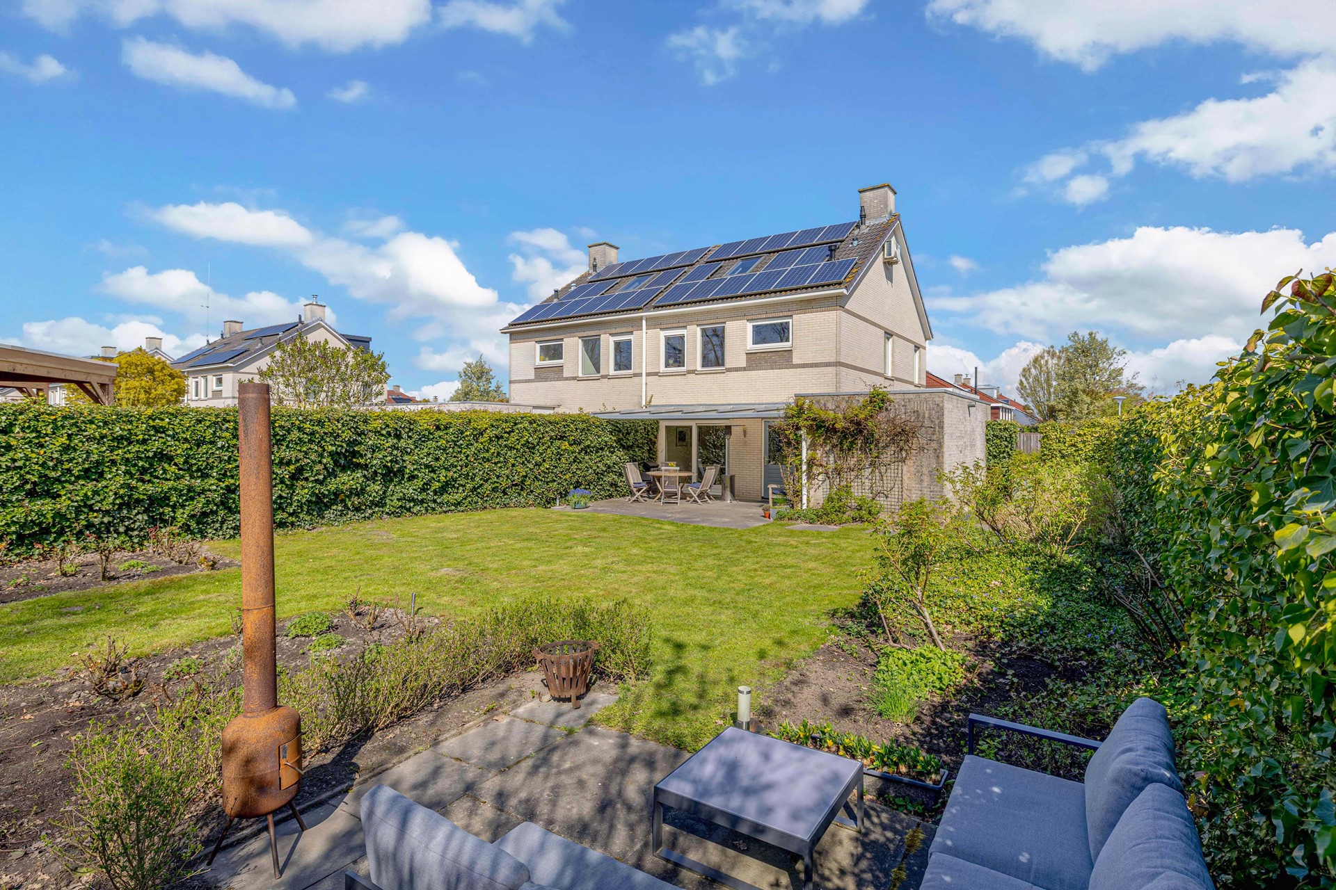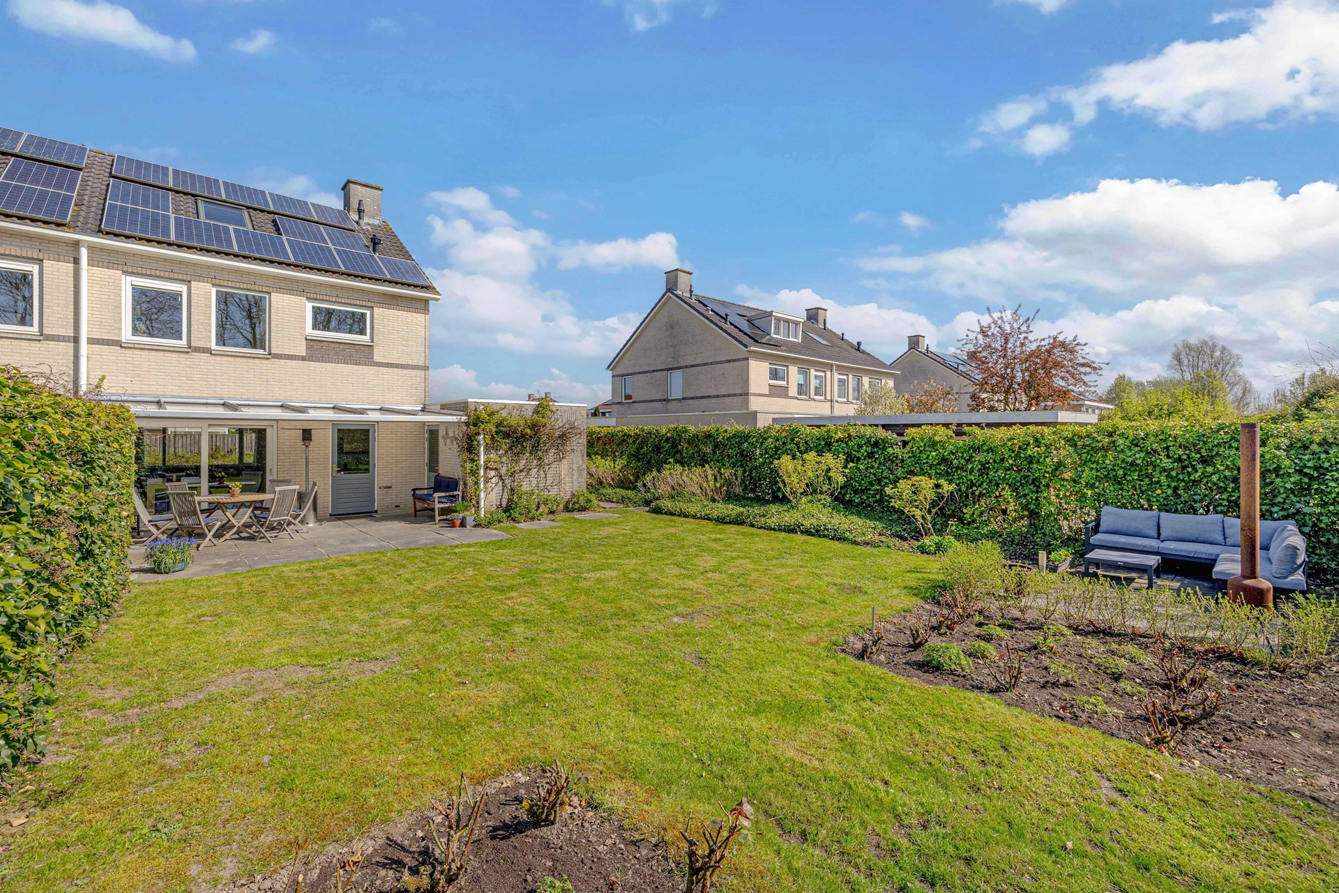 De woning staat op een royaal perceel van 532 m² en biedt volop ruimte rondom. De achtertuin van ca. 270 m² ligt op het zuiden en is daarmee een ideale plek voor zonliefhebbers. Hier kunnen kinderen vrij spelen, terwijl je zelf onder de aangebouwde overkapping geniet van lange zomeravonden.