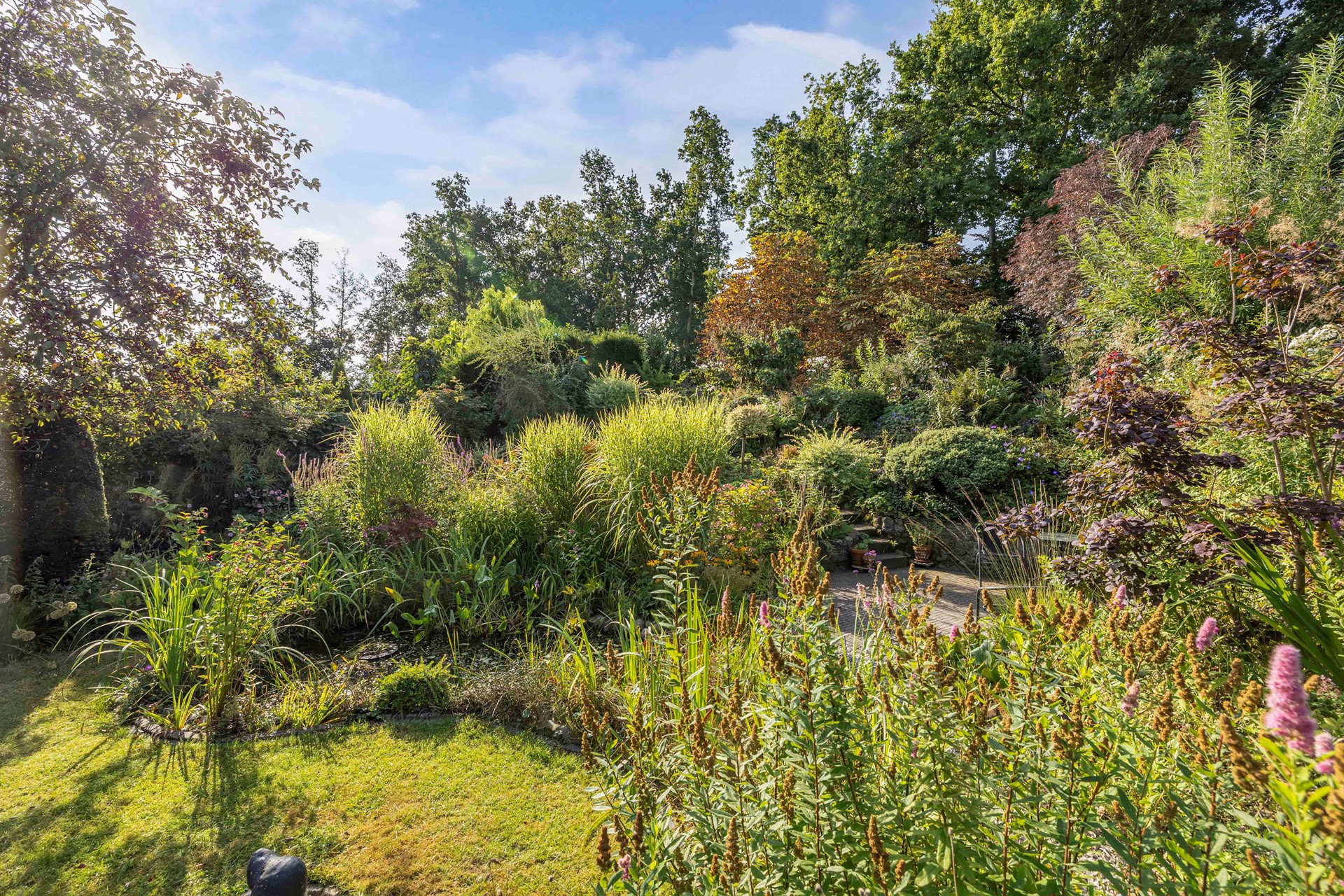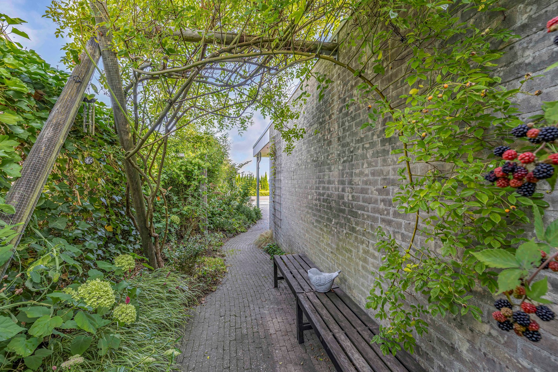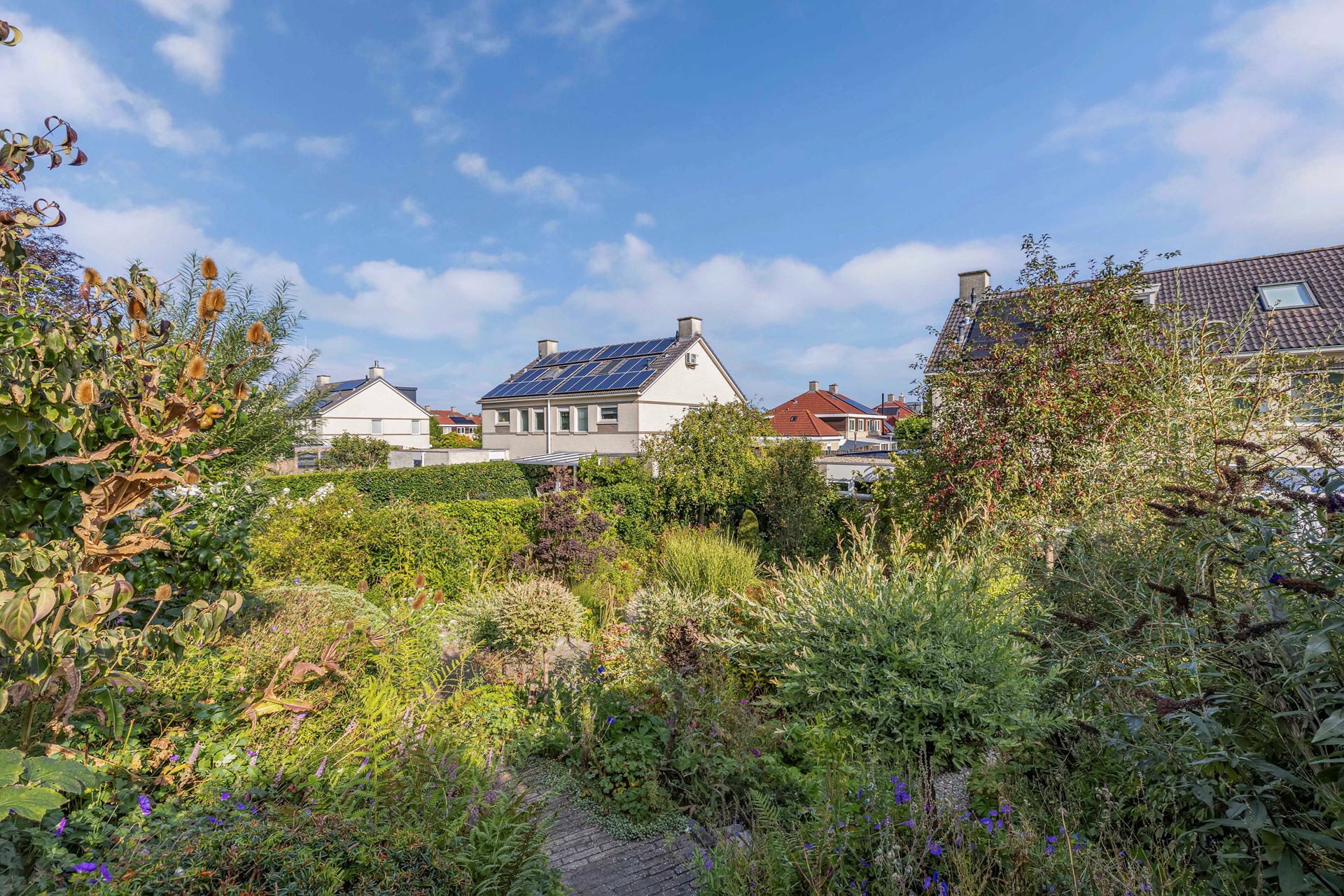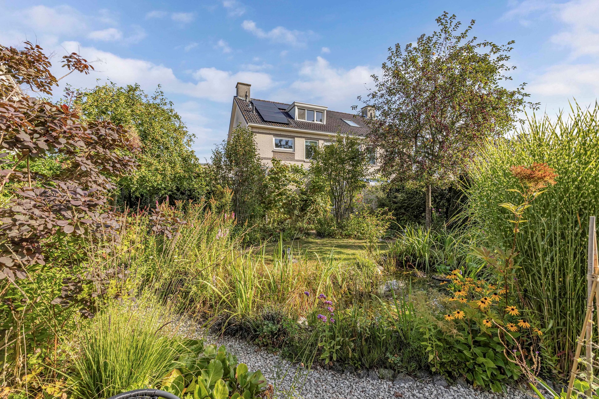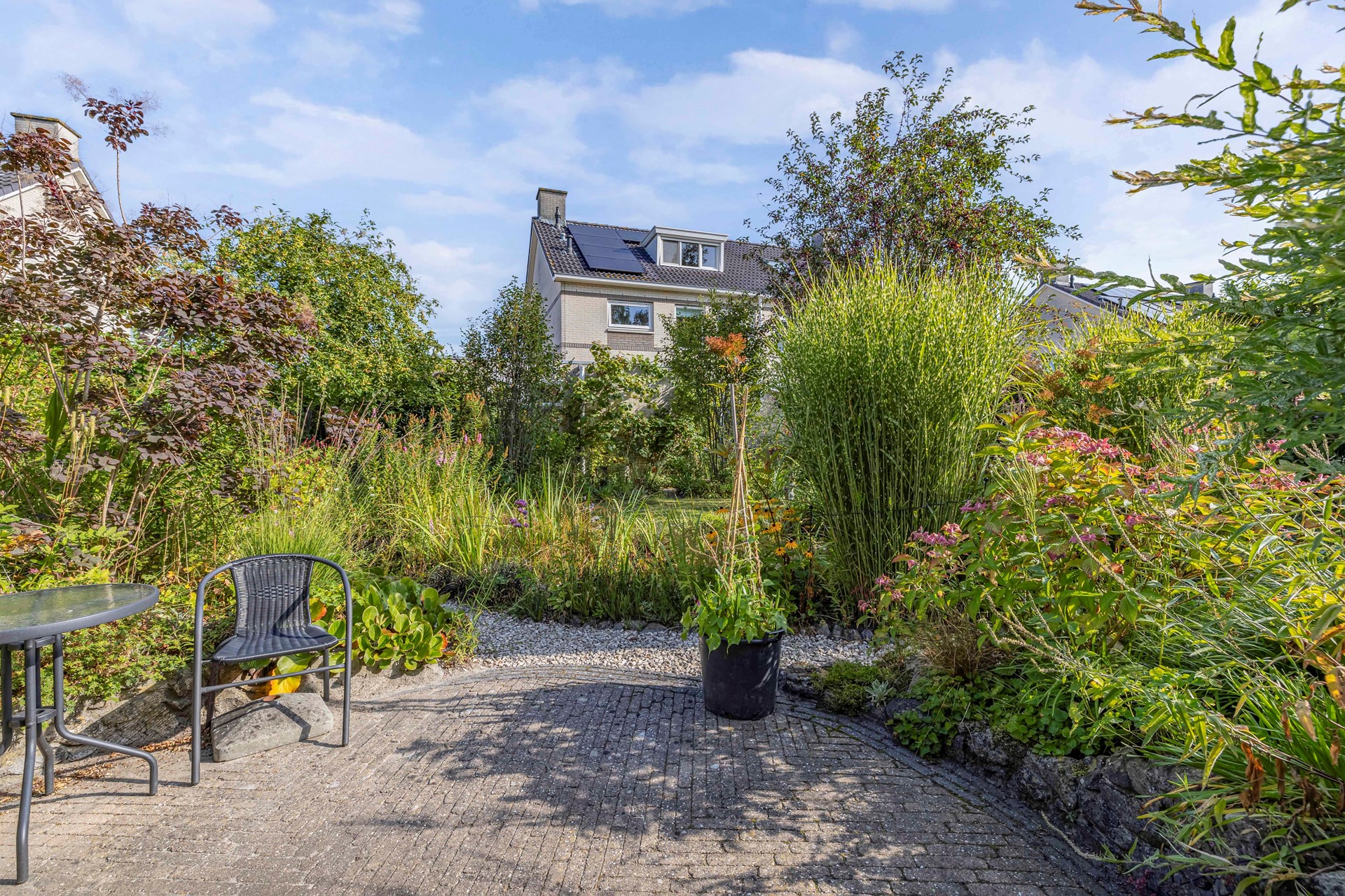 Achter de woning ligt een diepe tuin op het zuiden. Dit groene geheel is rijk aan bloemen en planten en voorzien van meerdere zitjes, zodat er altijd een plek in zon of schaduw te vinden is. Direct achter het huis bevindt zich een terras met zonnescherm. Parkeren kan op de oprit of langs de straat.