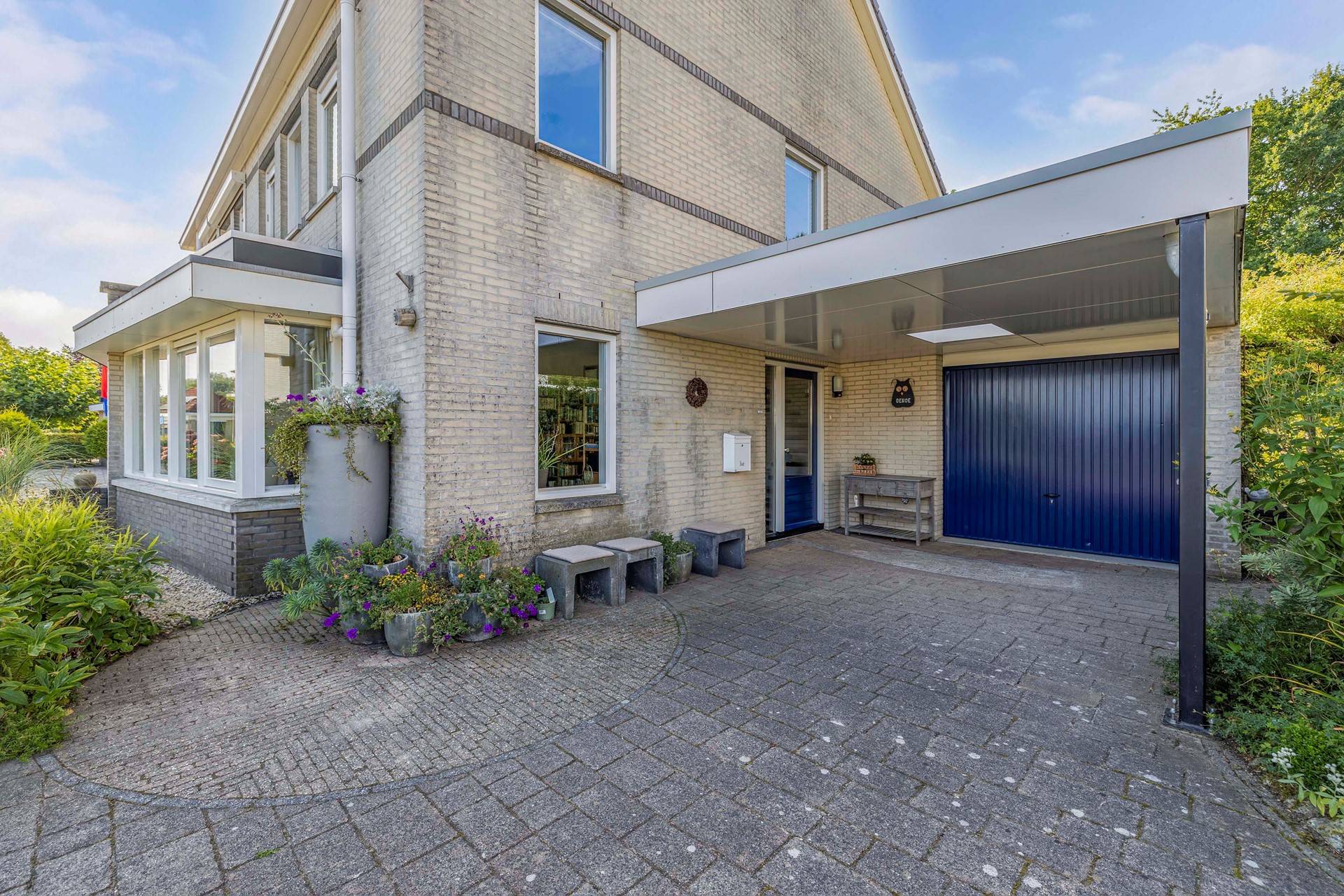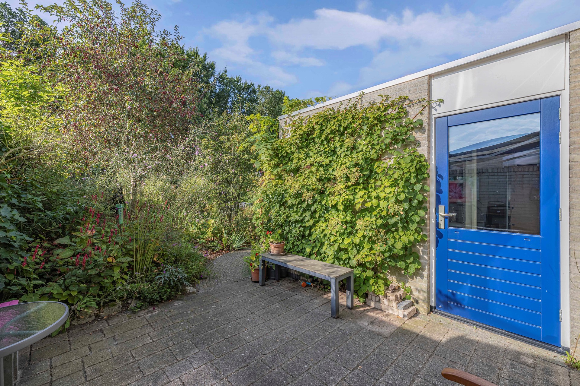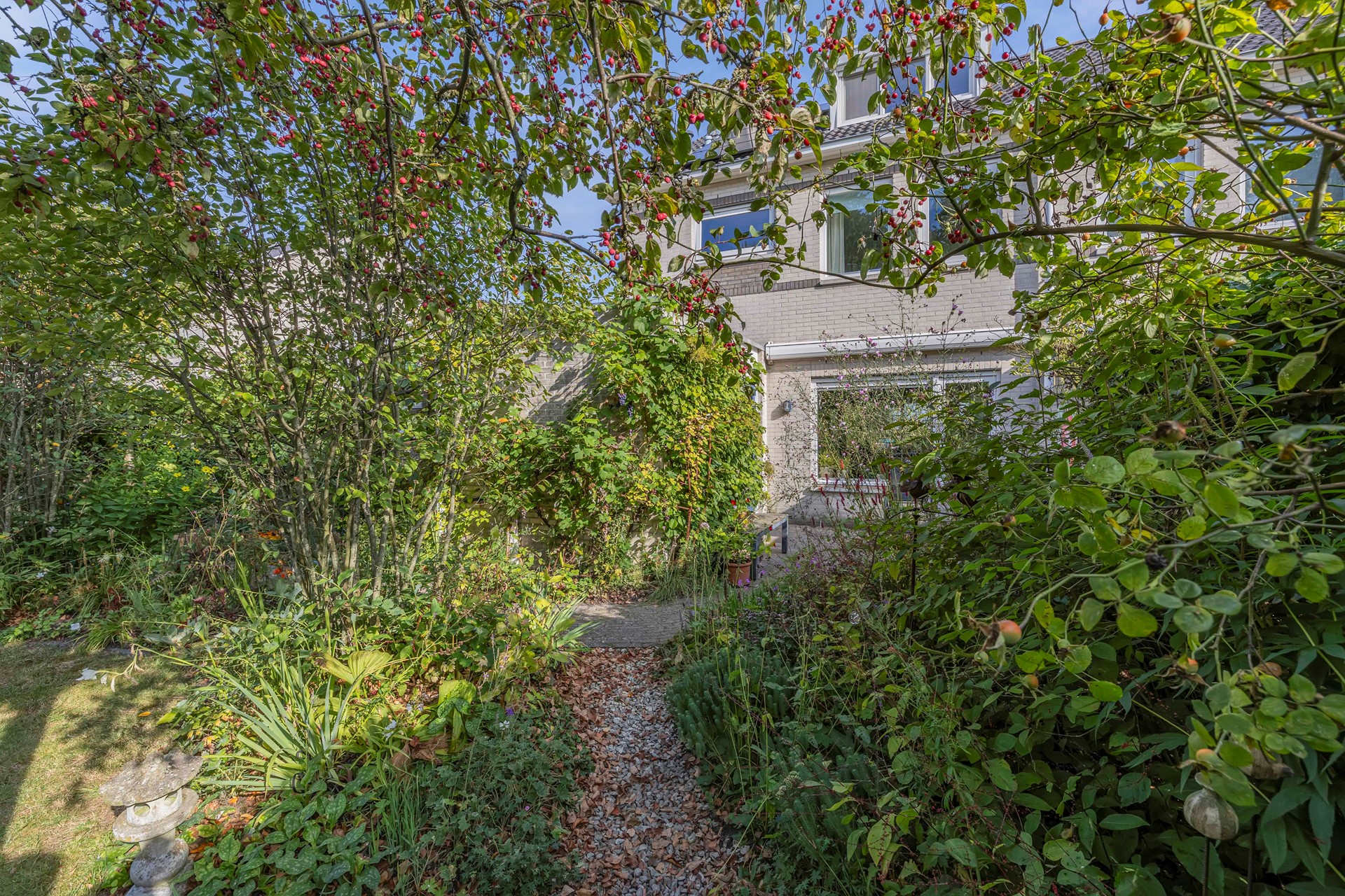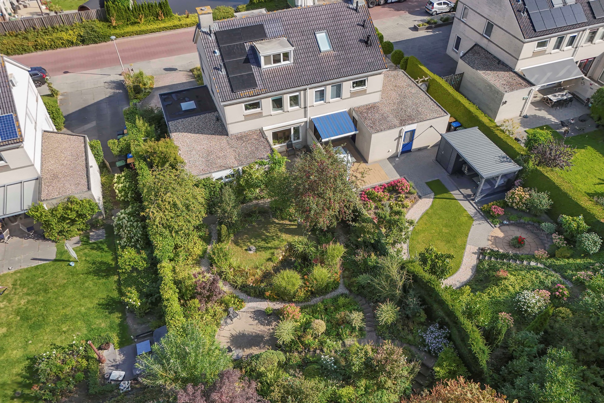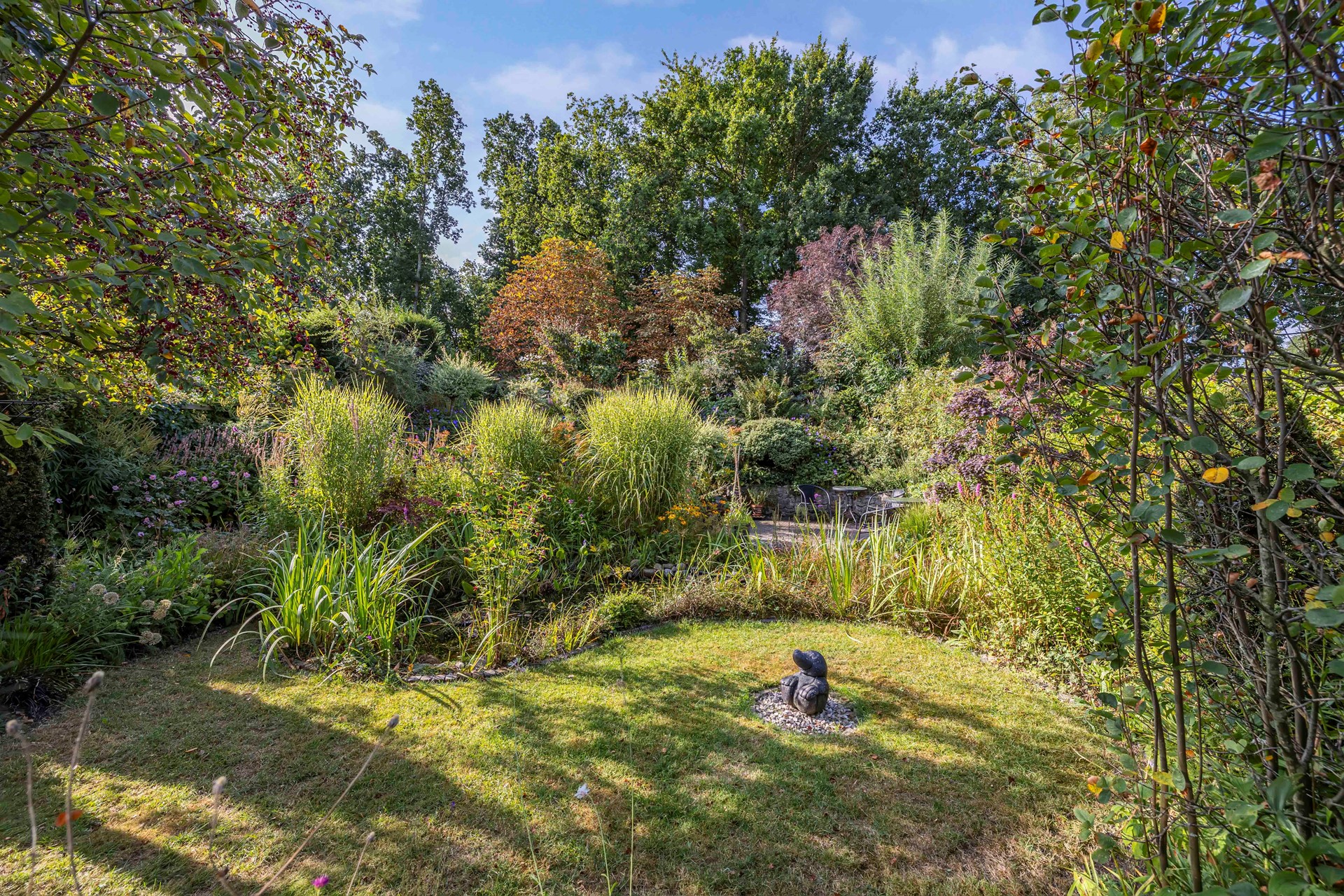 Achter de woning ligt een diepe tuin op het zuiden. Dit groene geheel is rijk aan bloemen en planten en voorzien van meerdere zitjes, zodat er altijd een plek in zon of schaduw te vinden is. Direct achter het huis bevindt zich een terras met zonnescherm. Parkeren kan op de oprit of langs de straat.