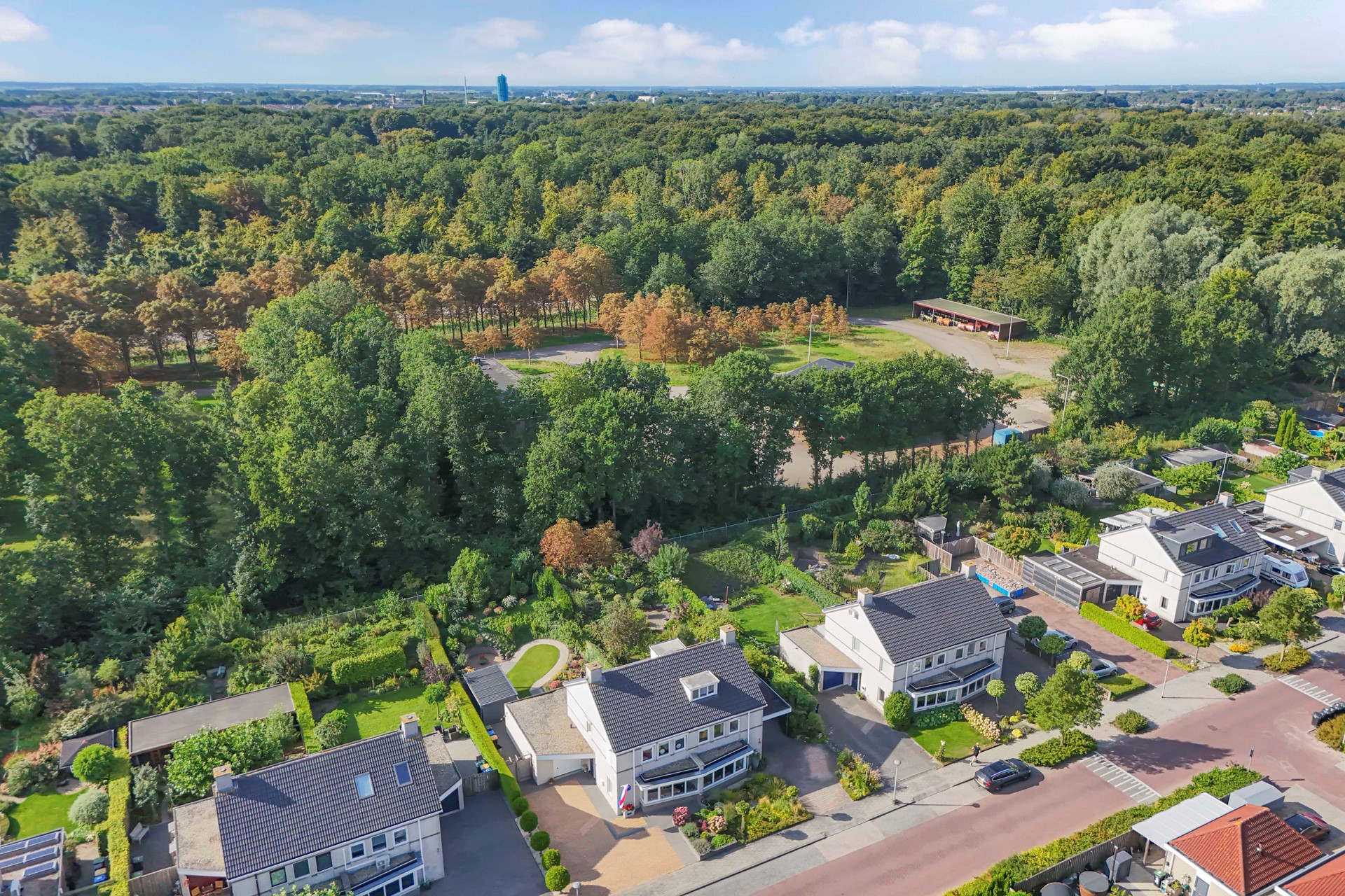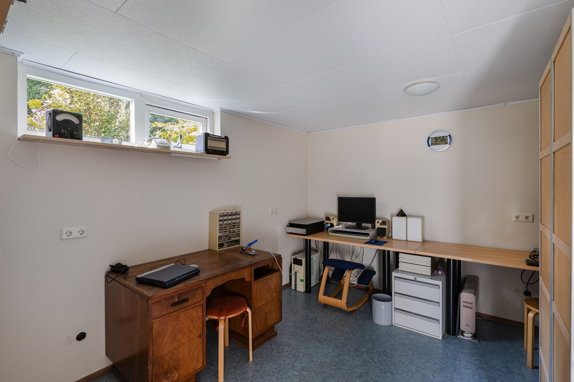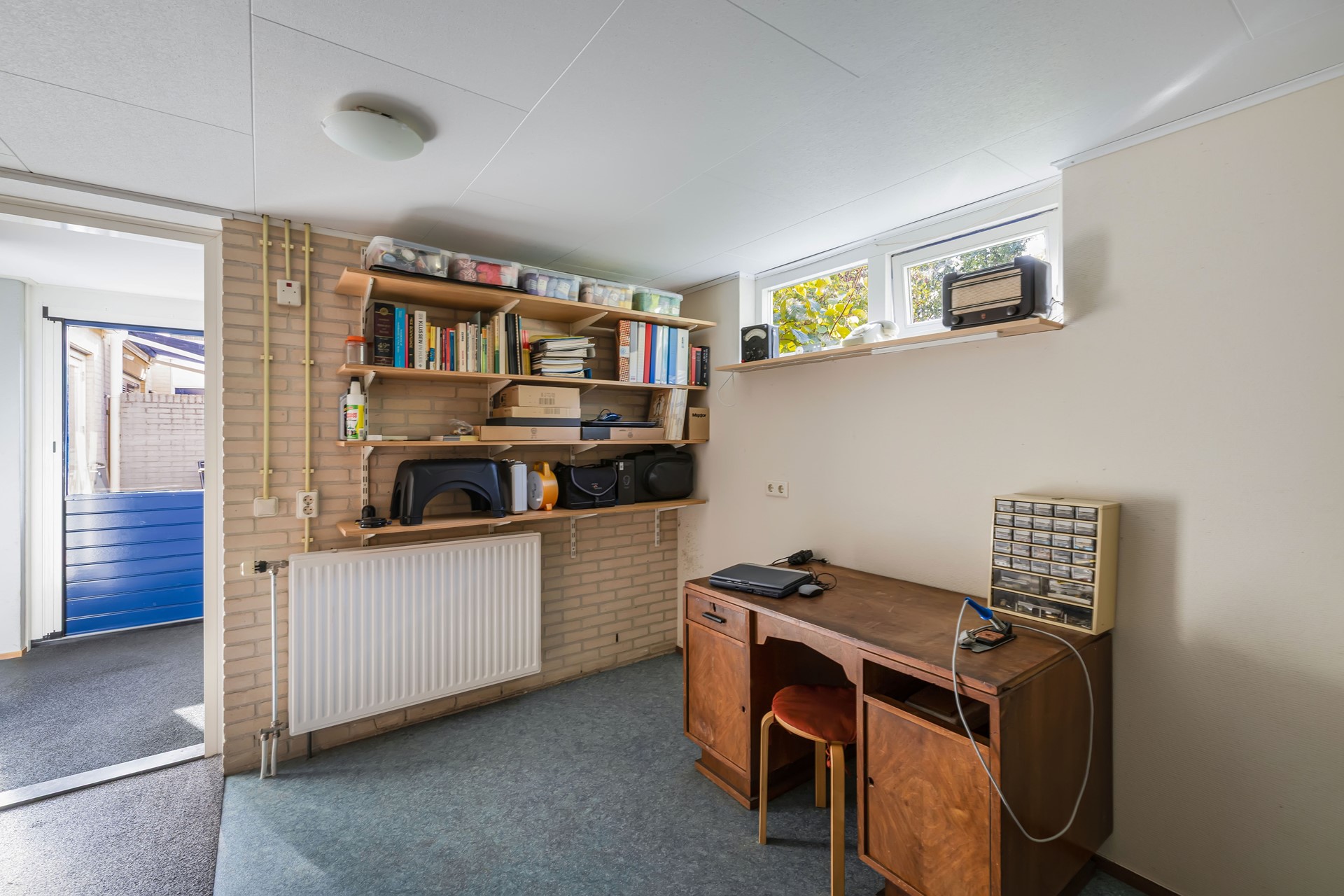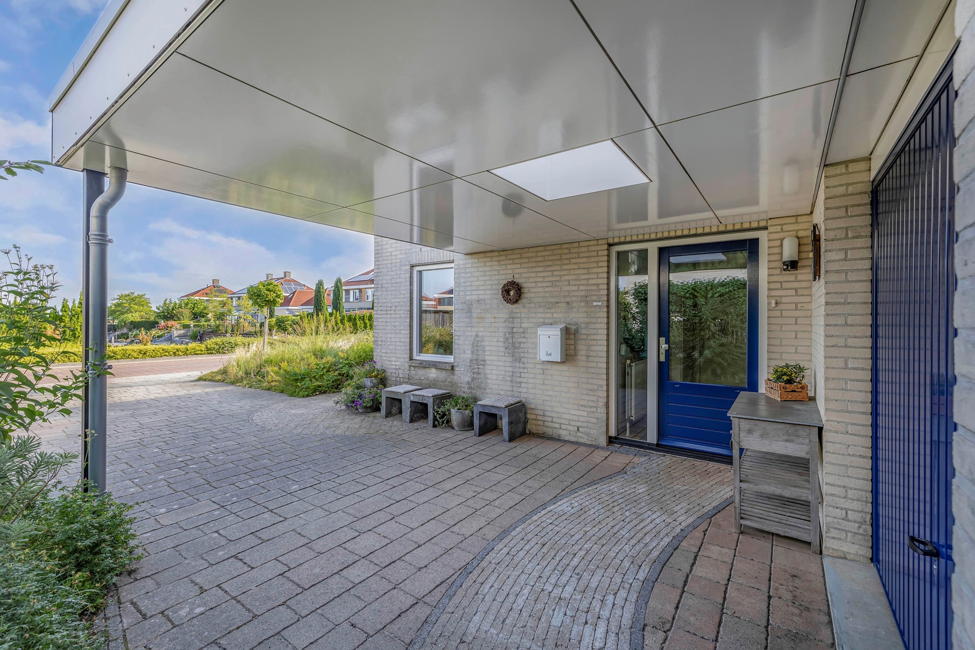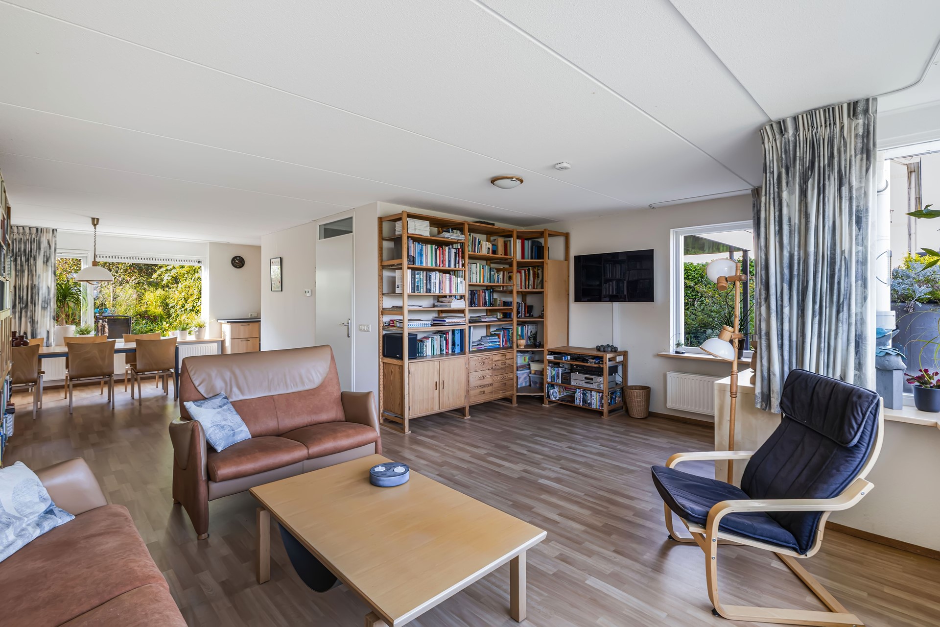 Achter de woning ligt een diepe tuin op het zuiden. Dit groene geheel is rijk aan bloemen en planten en voorzien van meerdere zitjes, zodat er altijd een plek in zon of schaduw te vinden is. Direct achter het huis bevindt zich een terras met zonnescherm. Parkeren kan op de oprit of langs de straat.