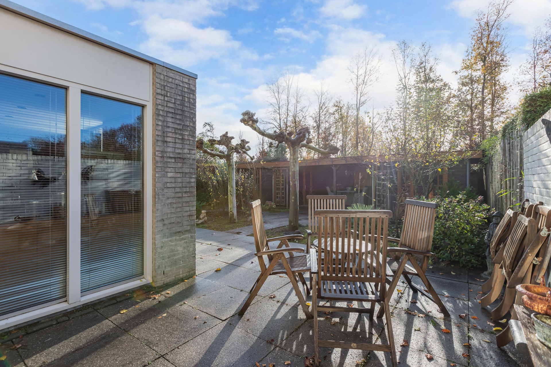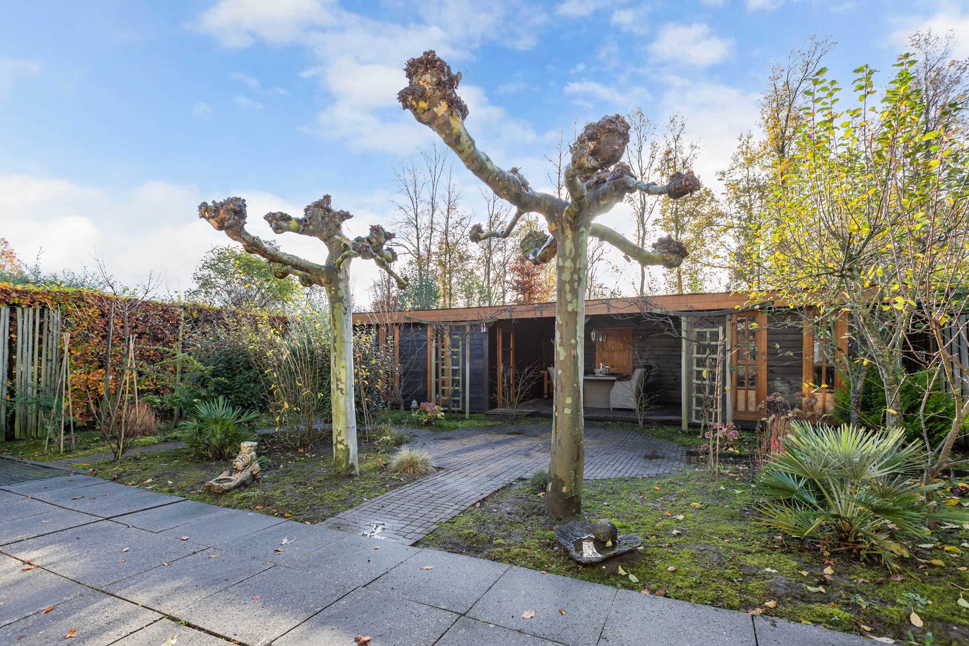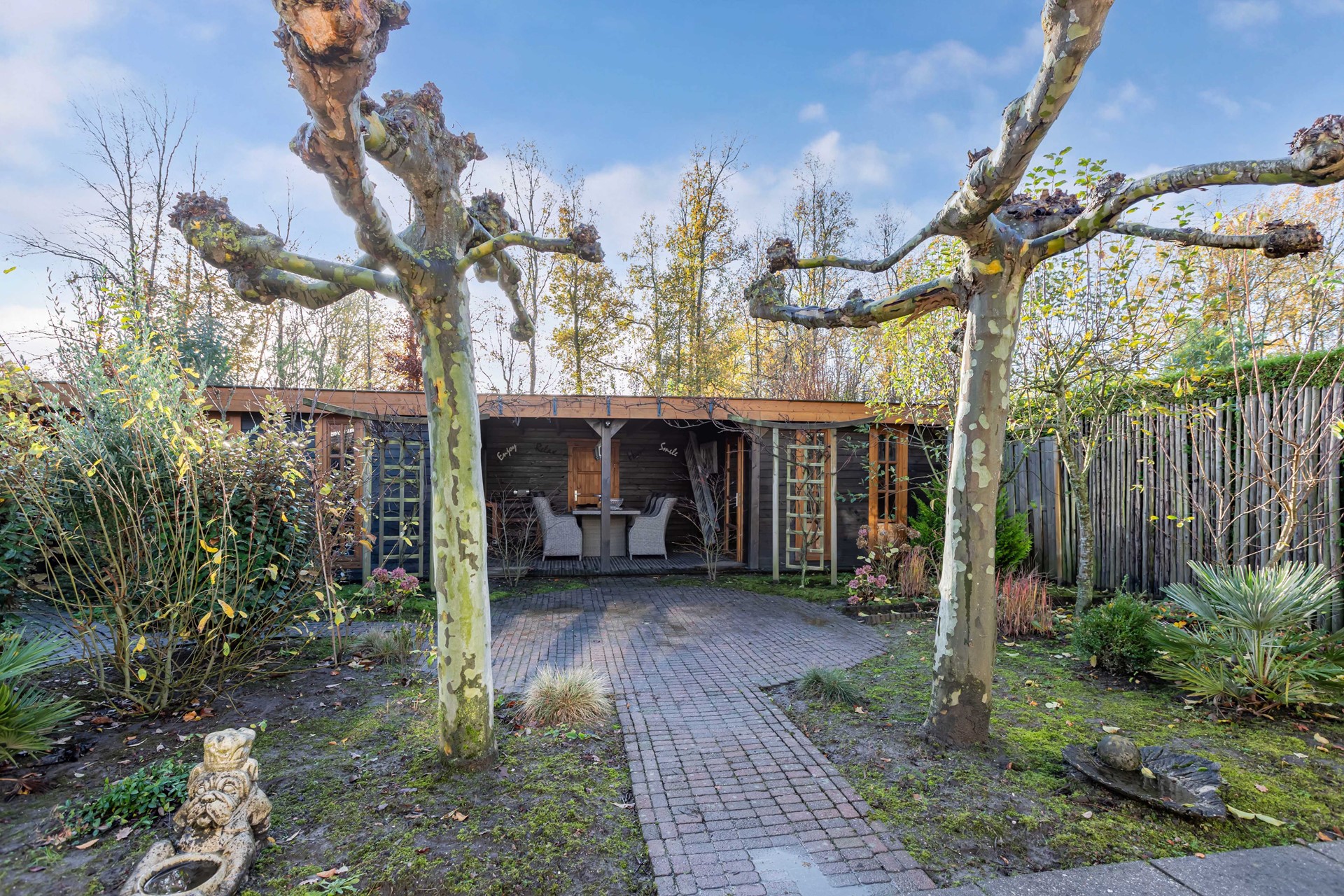 De zonnige, perfect onderhouden tuin op het zuiden biedt volledige privacy dankzij het vrije uitzicht zonder achterburen. Onder de royale overkapping geniet je het hele jaar door van het buitenleven. Aan beide zijden bevinden zich bergingen, waarvan één is uitgerust met een sauna; een heerlijke extra luxe. De diepe oprit aan de voorzijde biedt plaats aan meerdere auto’s.