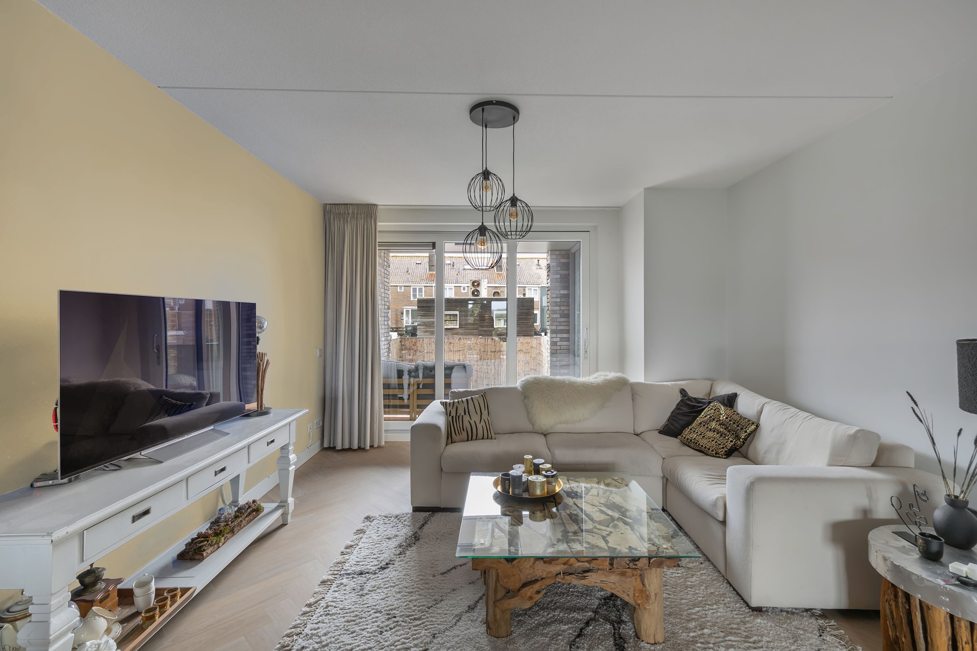 - Lichte woonkamer met grote raampartijen en zonnig balkon op het zuiden