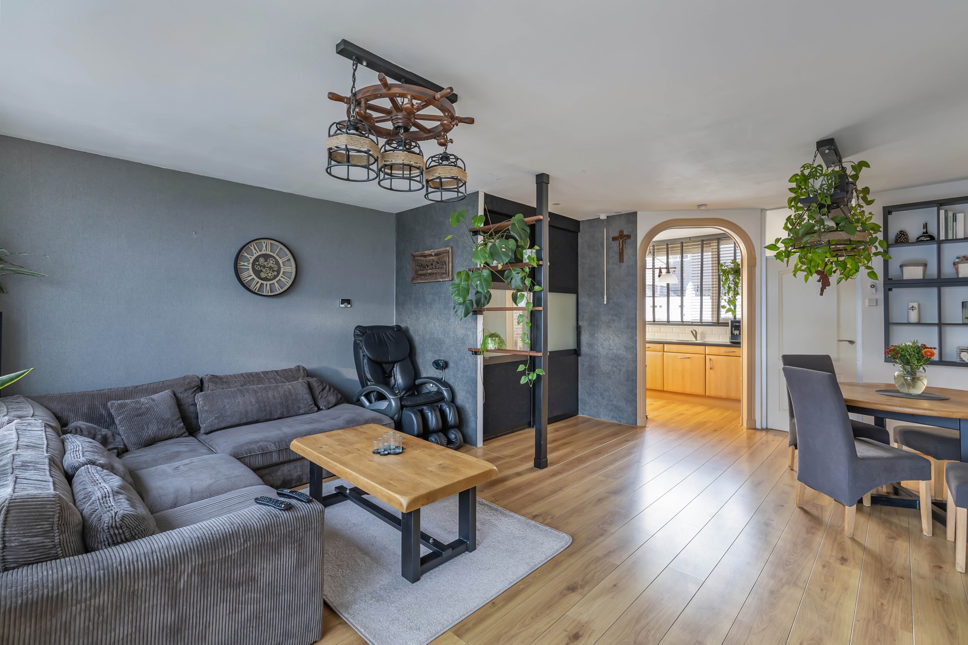 De woonkamer is erg licht door de grote raampartij met schuifpui aan de achterzijde, via welke je zo de ruime tuin op het westen inloopt.