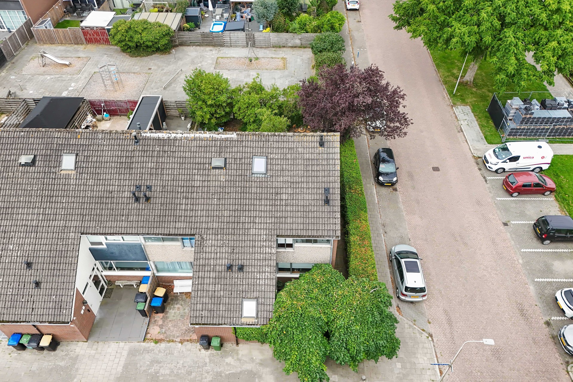 Achter de woning bevindt zich een nette tuin met een speelpleintje aan de achterkant. Aan de voorzijde is een kleine groene tuin met een boom die voor veel privacy zorgt. Voor de tuin is een pleintje met openbare parkeerplaatsen voor algemeen gebruik. Dus genoeg plek om de auto te parkeren.
