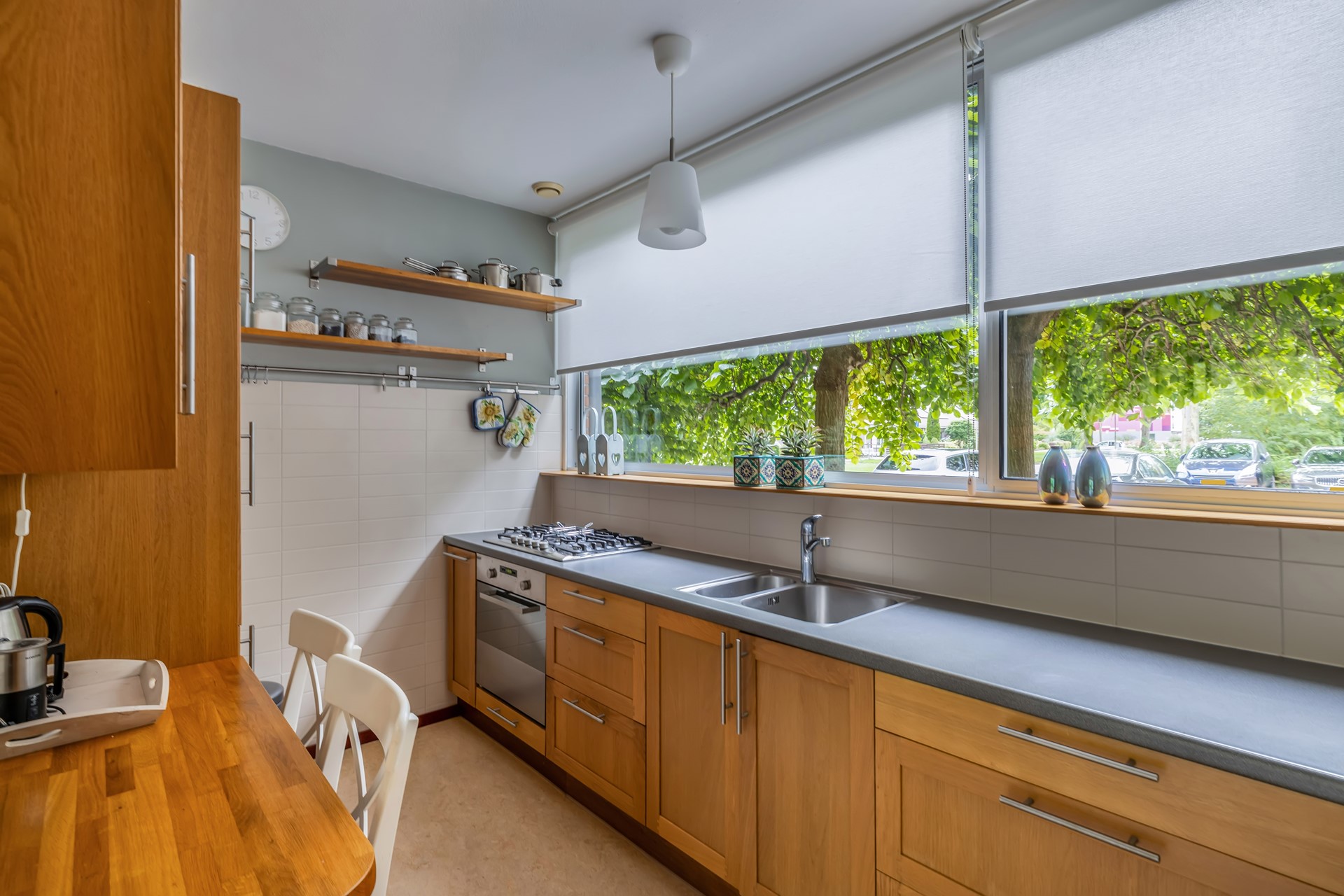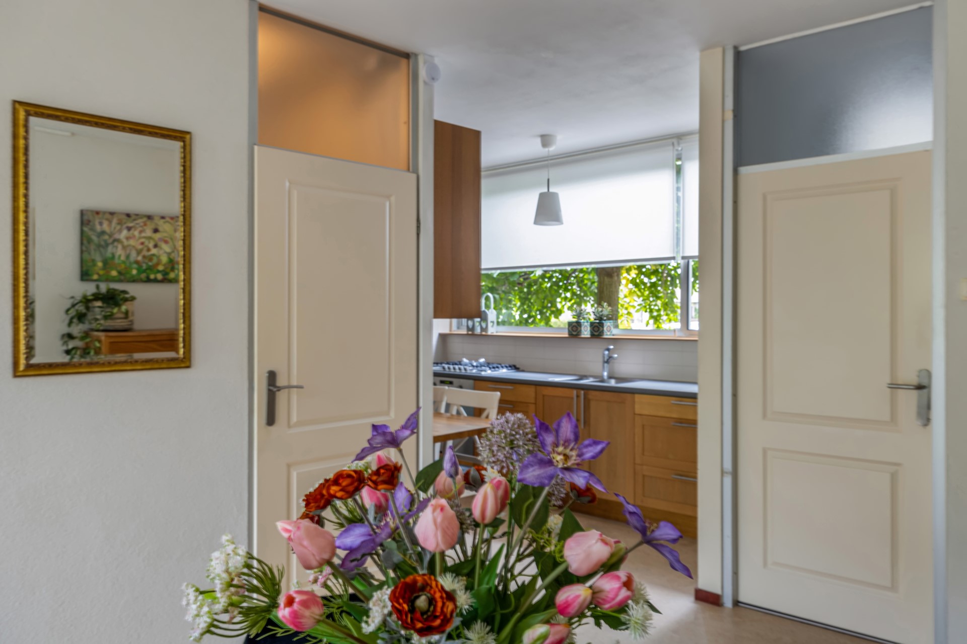 De halfopen keuken ligt aan de voorkant en heeft diverse inbouwapparatuur. Ook is er een grote raampartij, waardoor je veel licht in de keuken hebt. Vanwege de groene voortuin is er nauwelijks inkijk in de keuken.