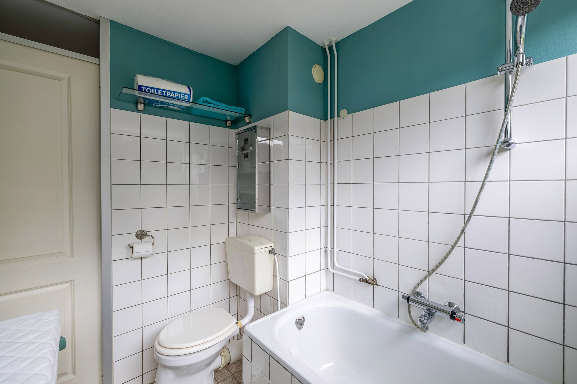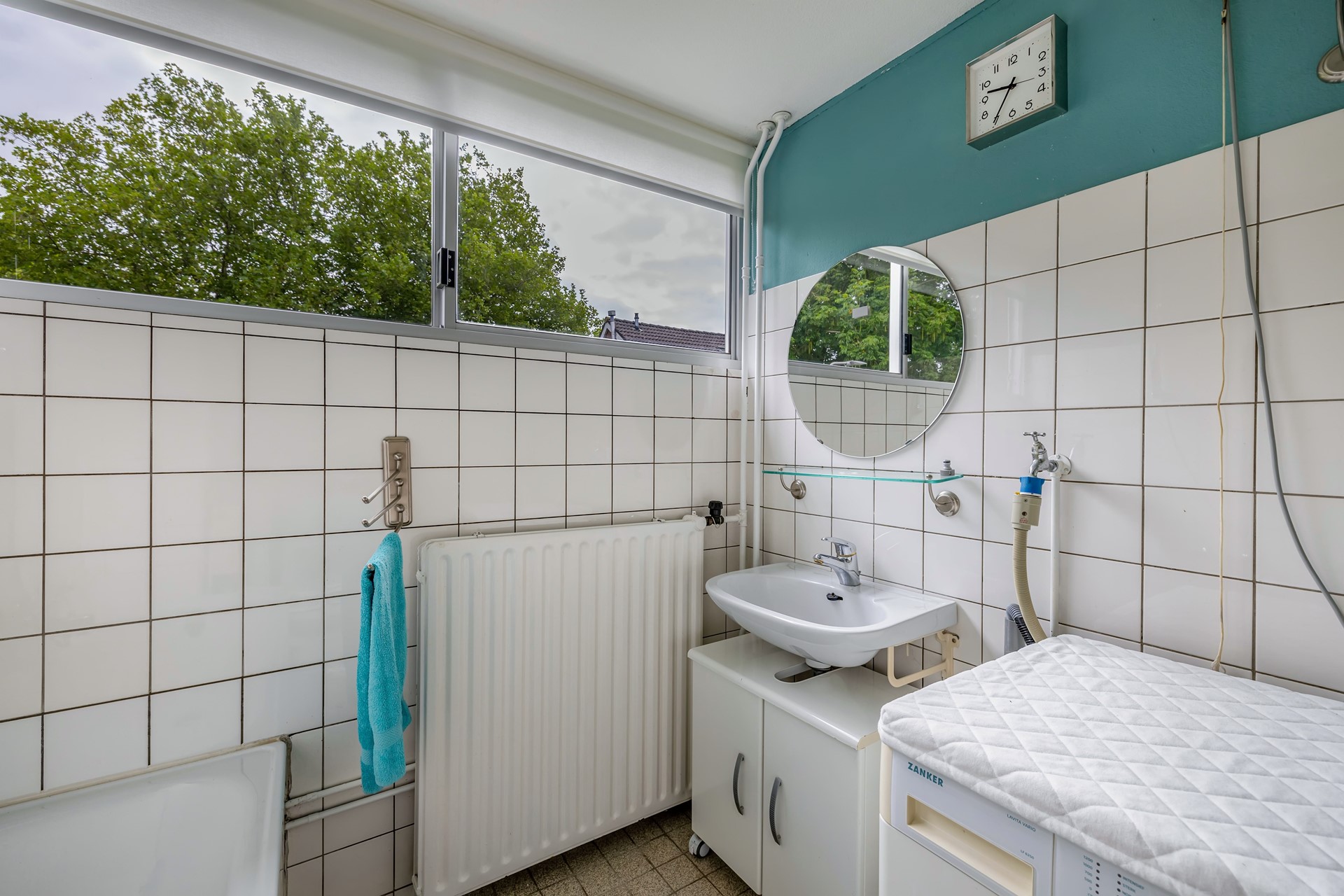 - Badkamer met toilet, wastafel, ligbad en wasmachine-aansluiting