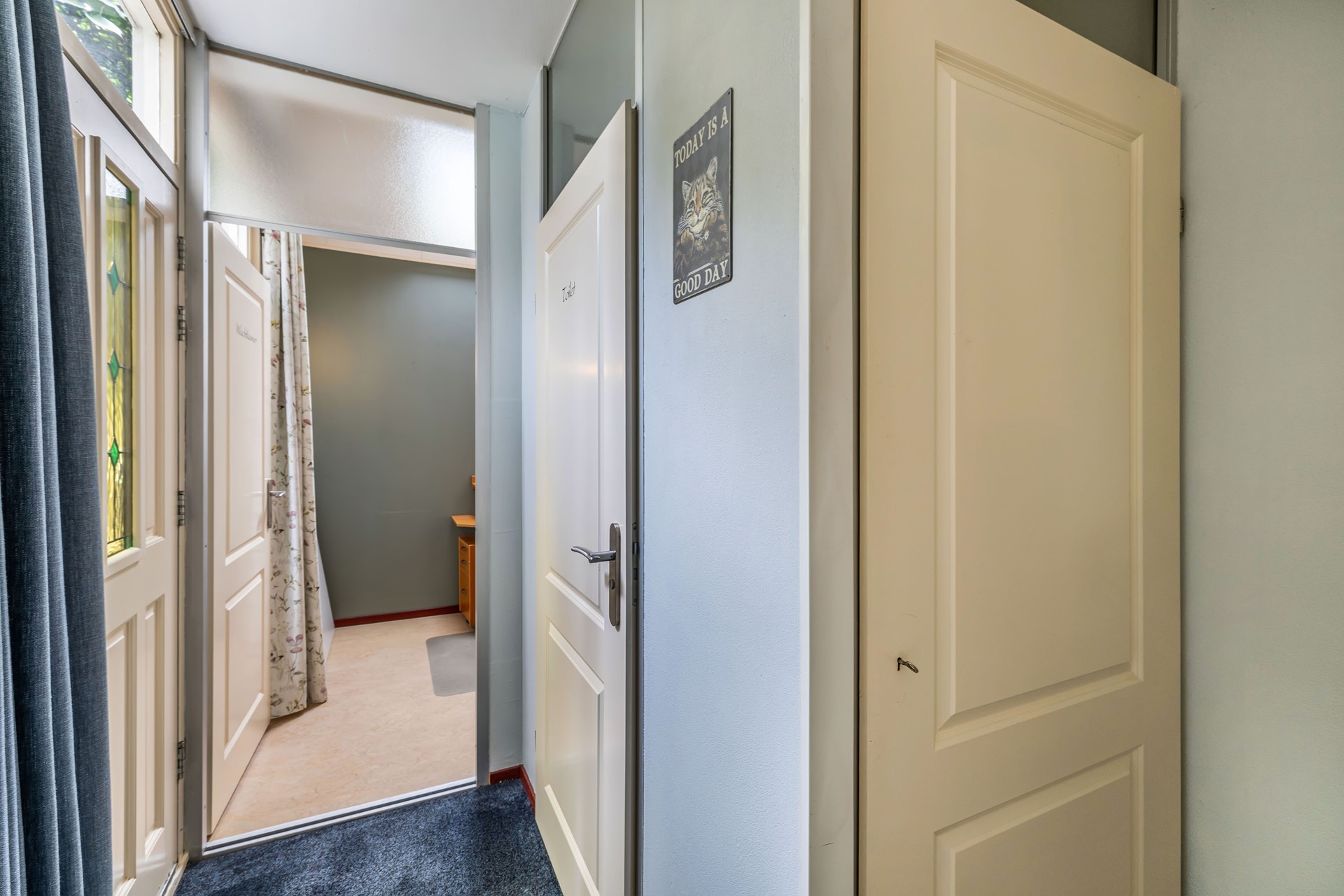 - Hal met toilet, (vernieuwde) meterkast, toegang naar berging/bijkeuken/thuiswerkplek en toegang tot de woonkamer