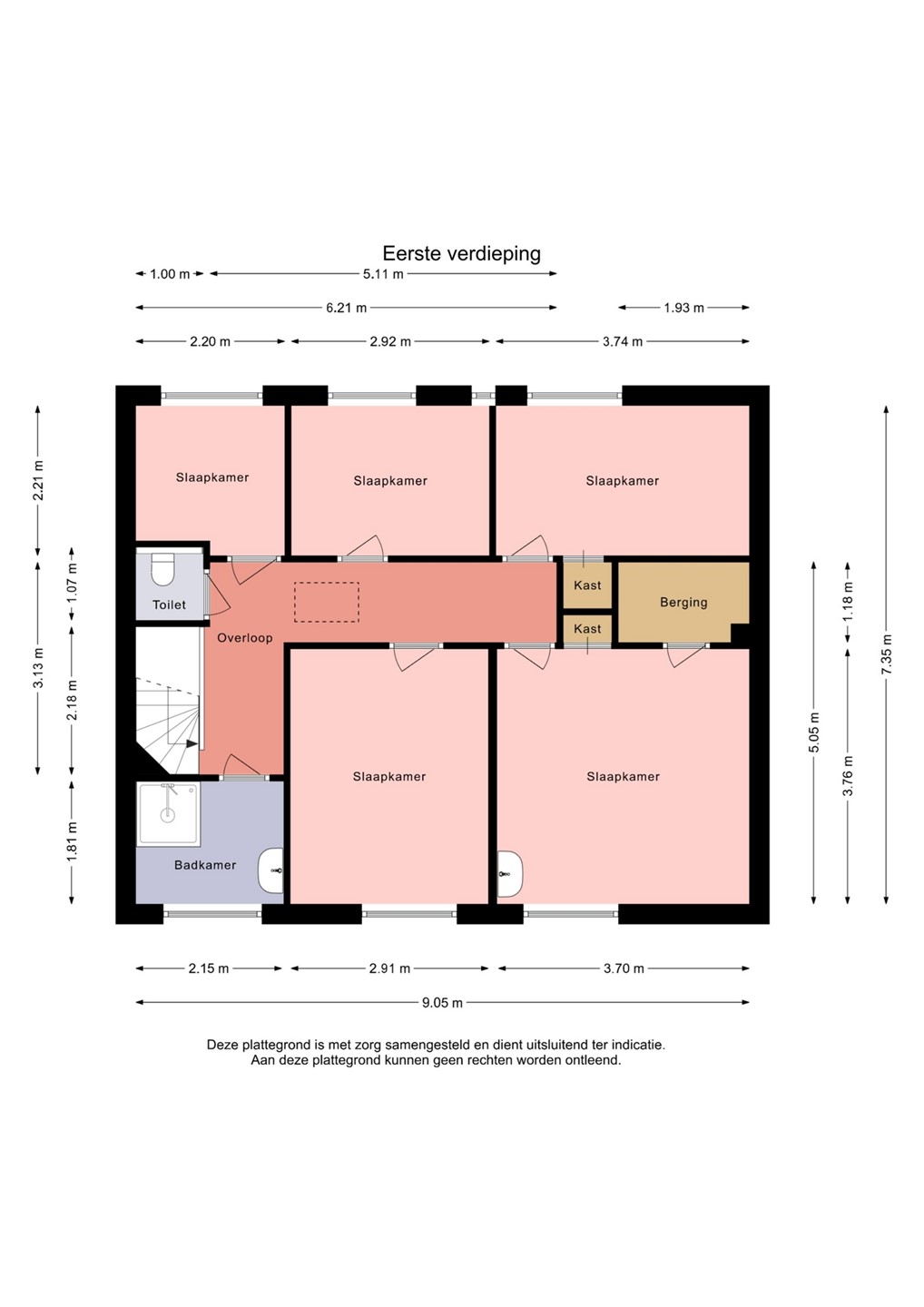 Op de eerste verdieping bevinden zich maar liefst vijf slaapkamers. De kamers variëren in grootte en bieden daardoor veel flexibiliteit voor een gezin, logeerkamer of werkruimte. De badkamer is netjes uitgevoerd en voorzien van een douche, wastafel en elektrische vloerverwarming. Daarnaast is er op deze verdieping een separaat toilet aanwezig.