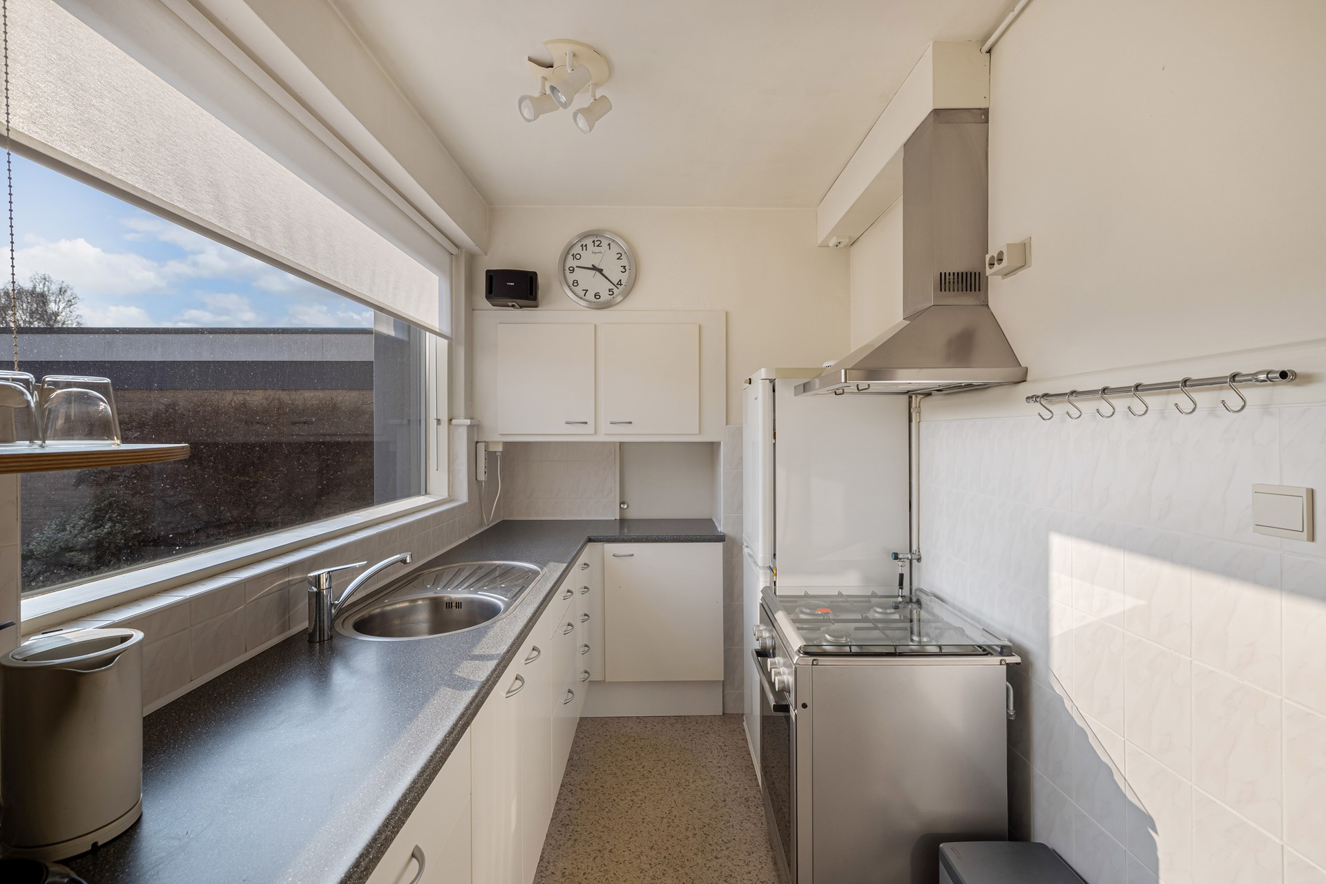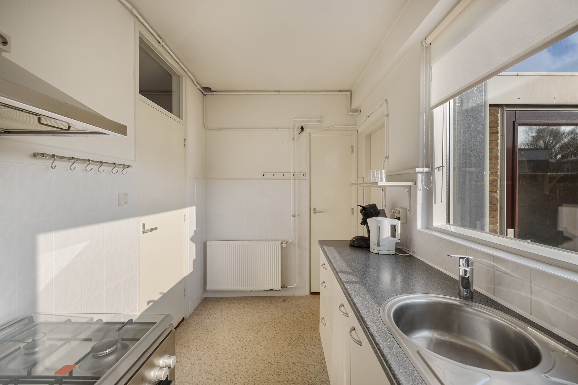 De keuken is eenvoudig uitgevoerd en voorzien van diverse vrijstaande apparatuur, waaronder een koelvriescombinatie, gasfornuis met oven en een afzuigkap. Vanuit hier bereik je de praktische bijkeuken met aansluiting voor de wasmachine en de opstelling van de cv-ketel.