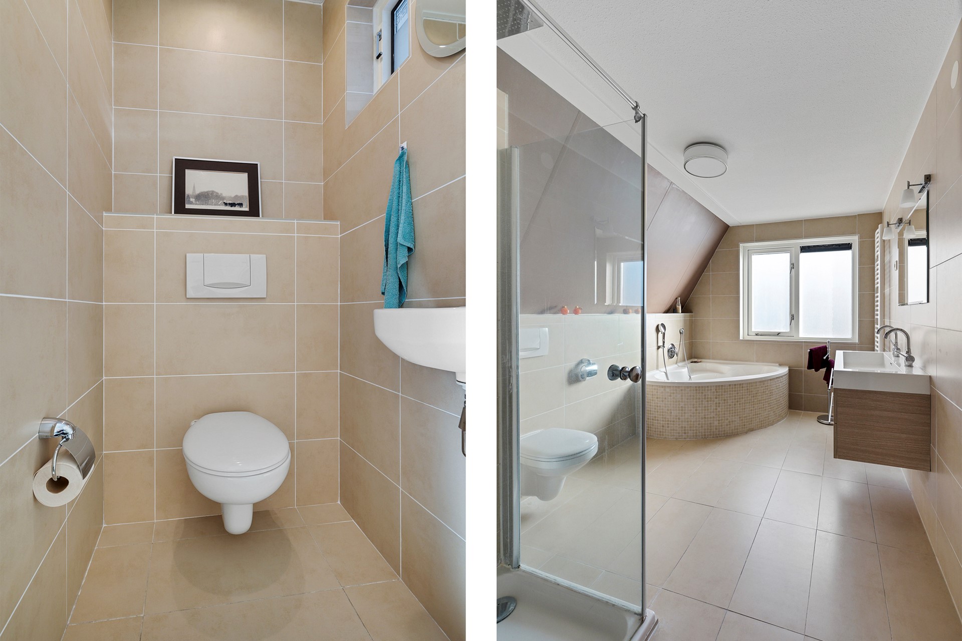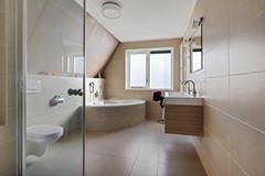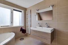 De badkamer is in 2016 gemoderniseerd en is volledig betegeld en voorzien van een zitbad, een douchecabine met een glazen deur, een dubbele wastafel en een toilet.