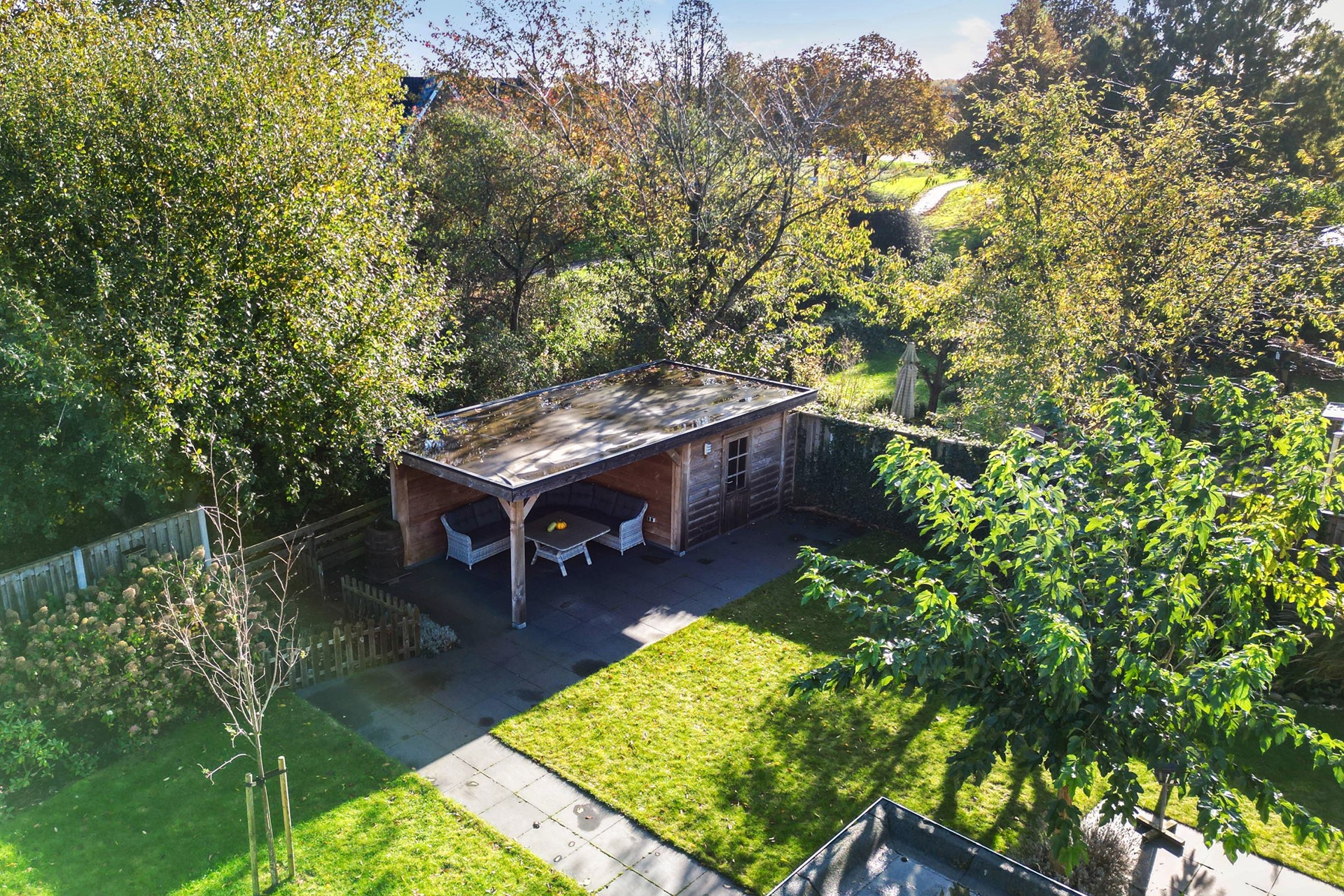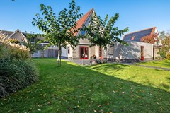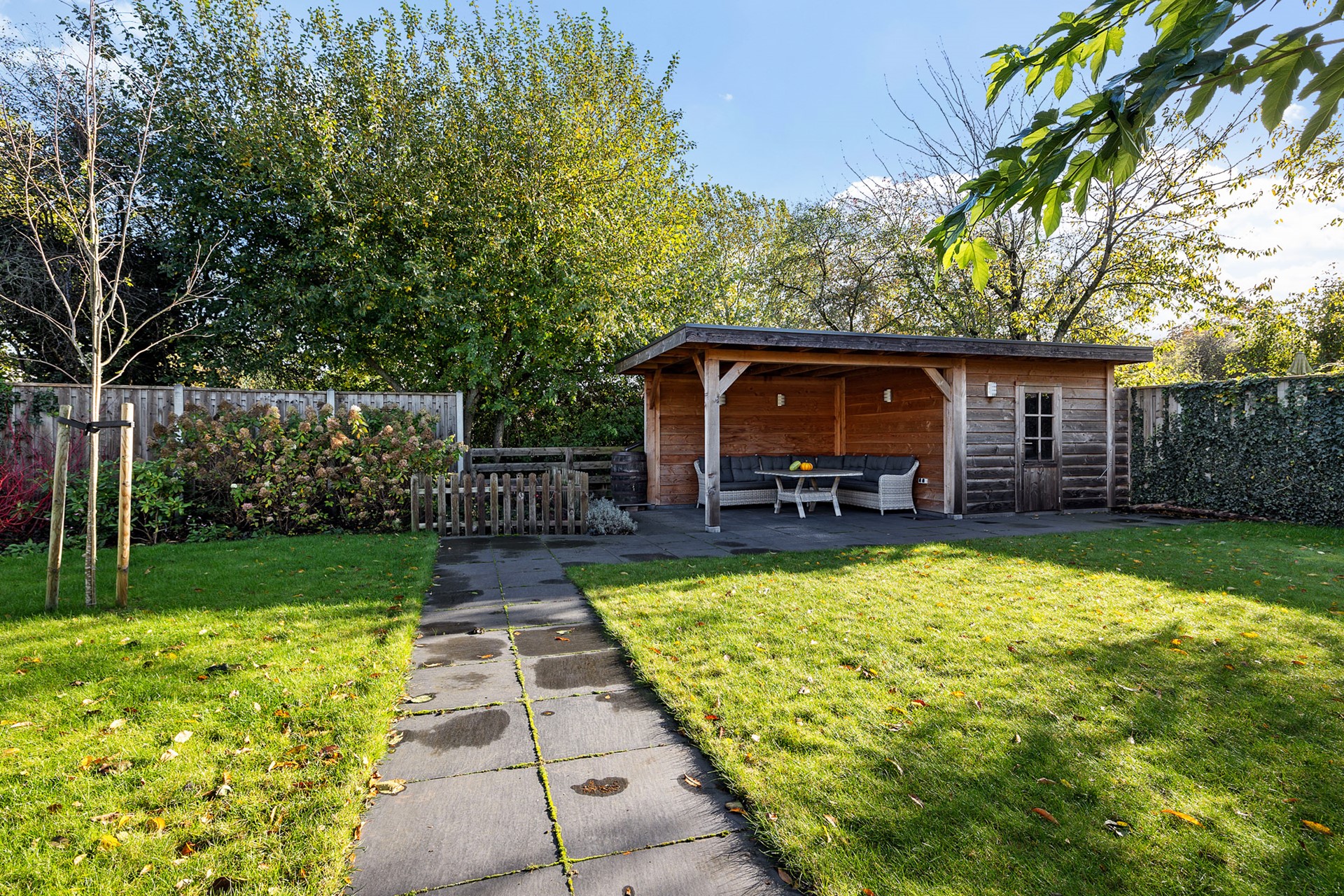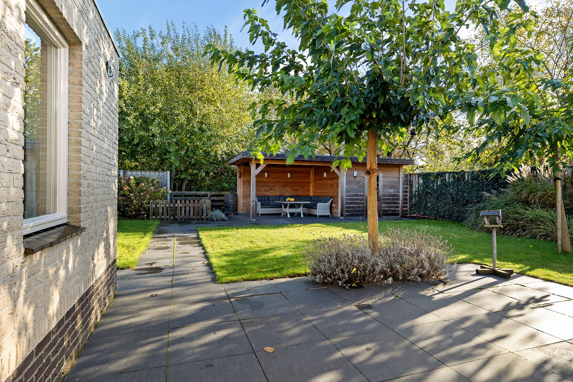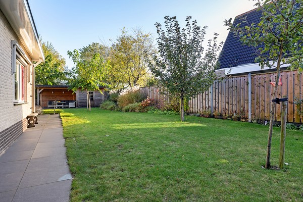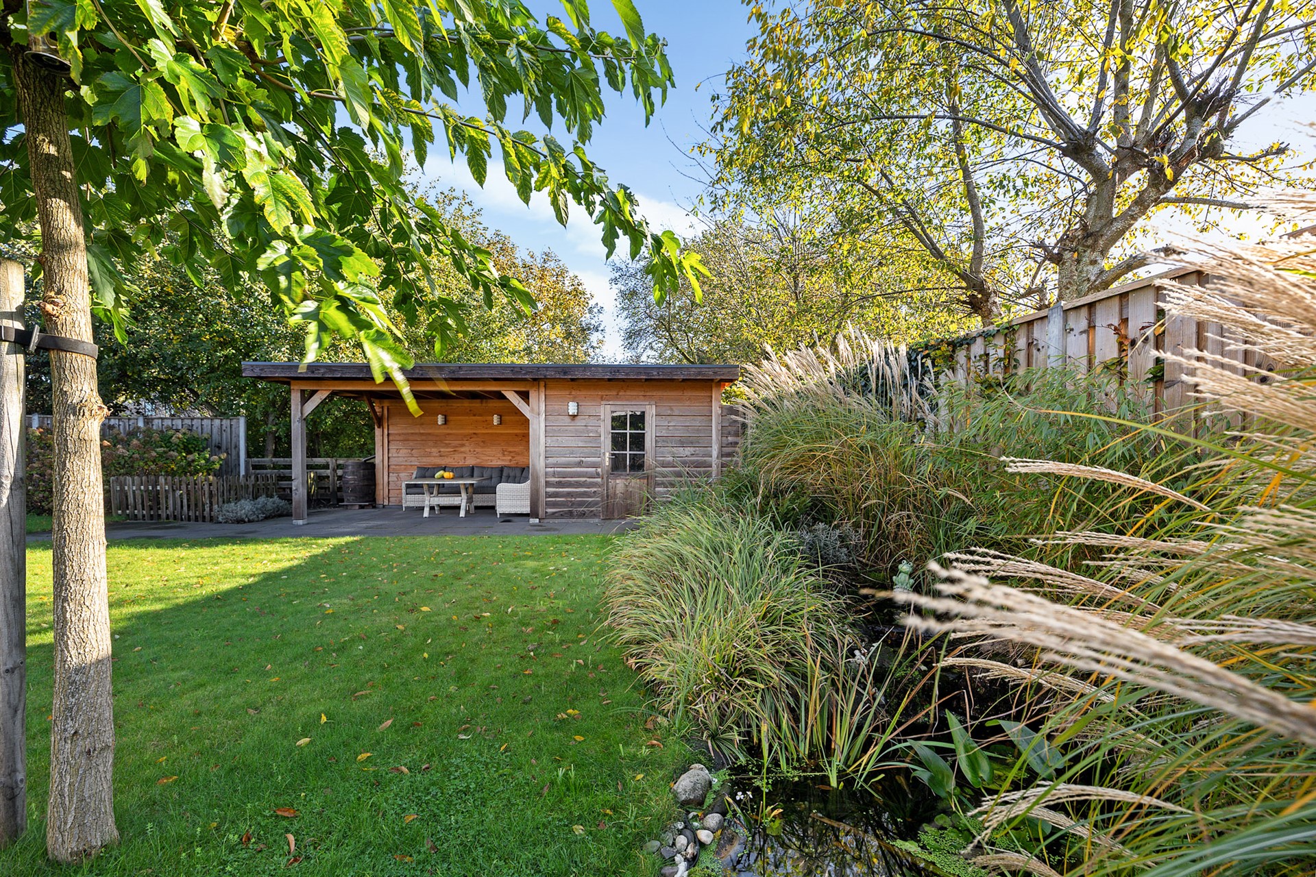 De tuin is ingericht met een vijver, gras, beplanting en terrastegels. Je kunt volop genieten in de zonnige tuin of onder de vrijstaande houten overkapping achter in de tuin.