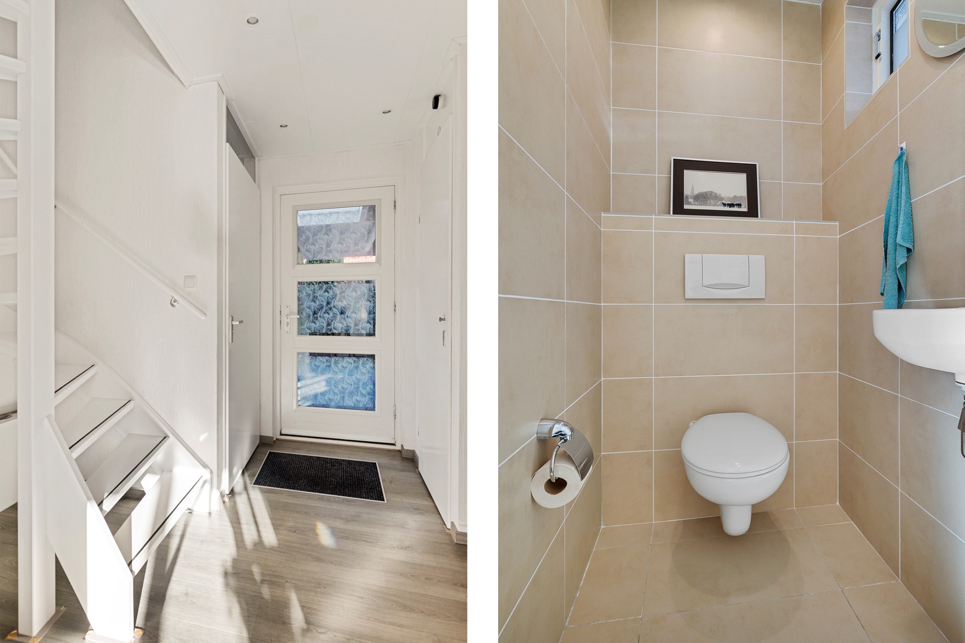 De carport is tevens een overkapping bij de voordeur waardoor je altijd droog je auto uitstapt. Via de voordeur stap je de hal binnen met de trapopgang en een (gasten)toilet.