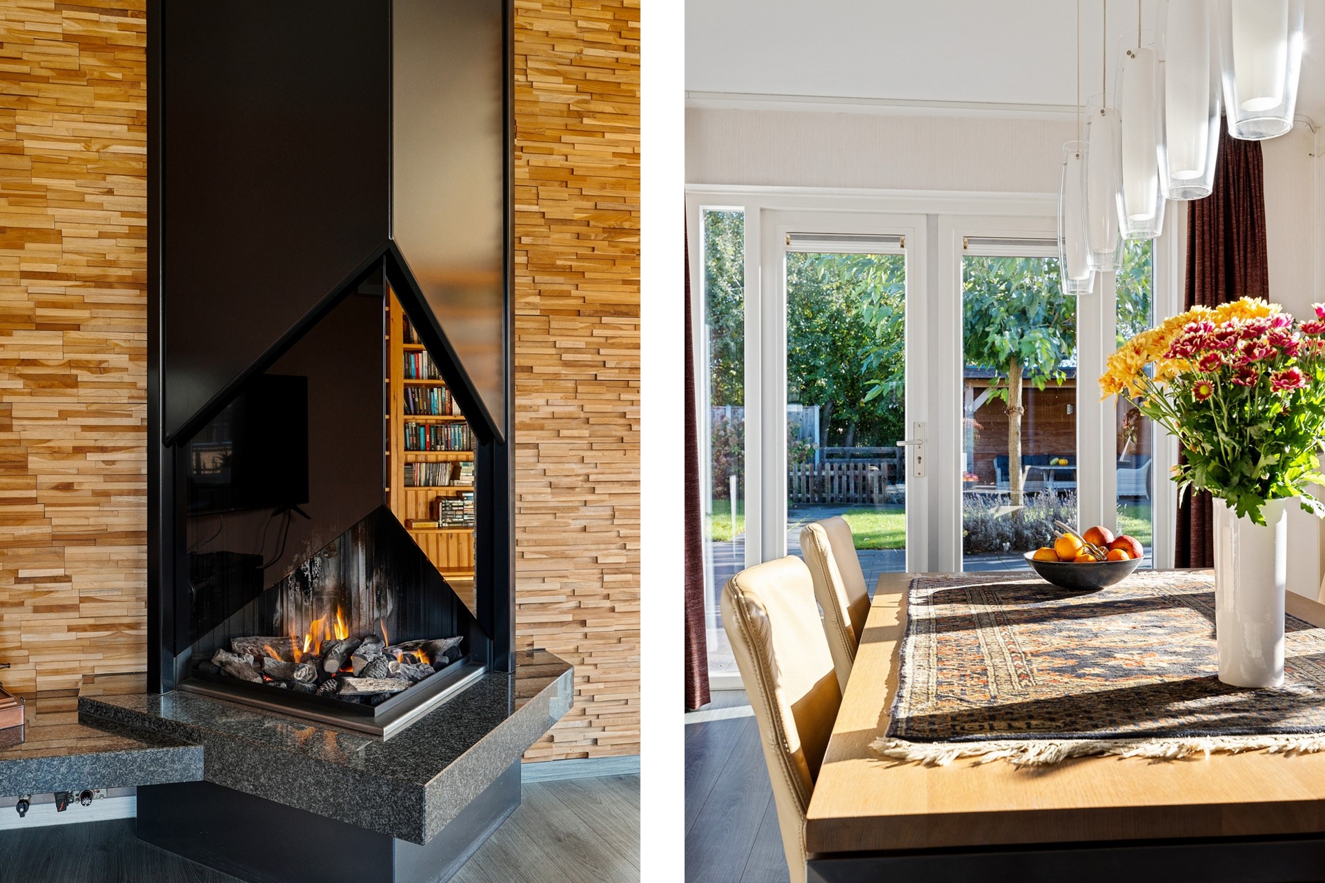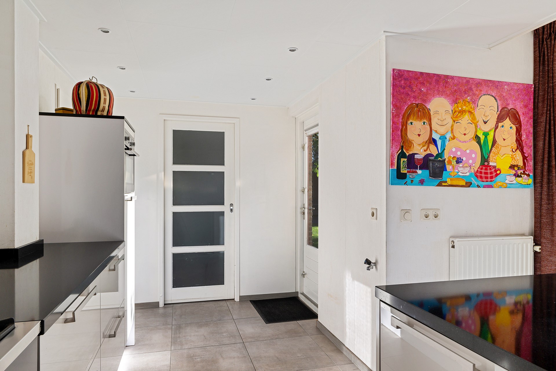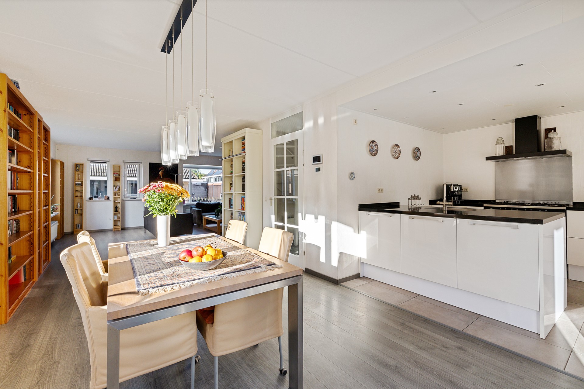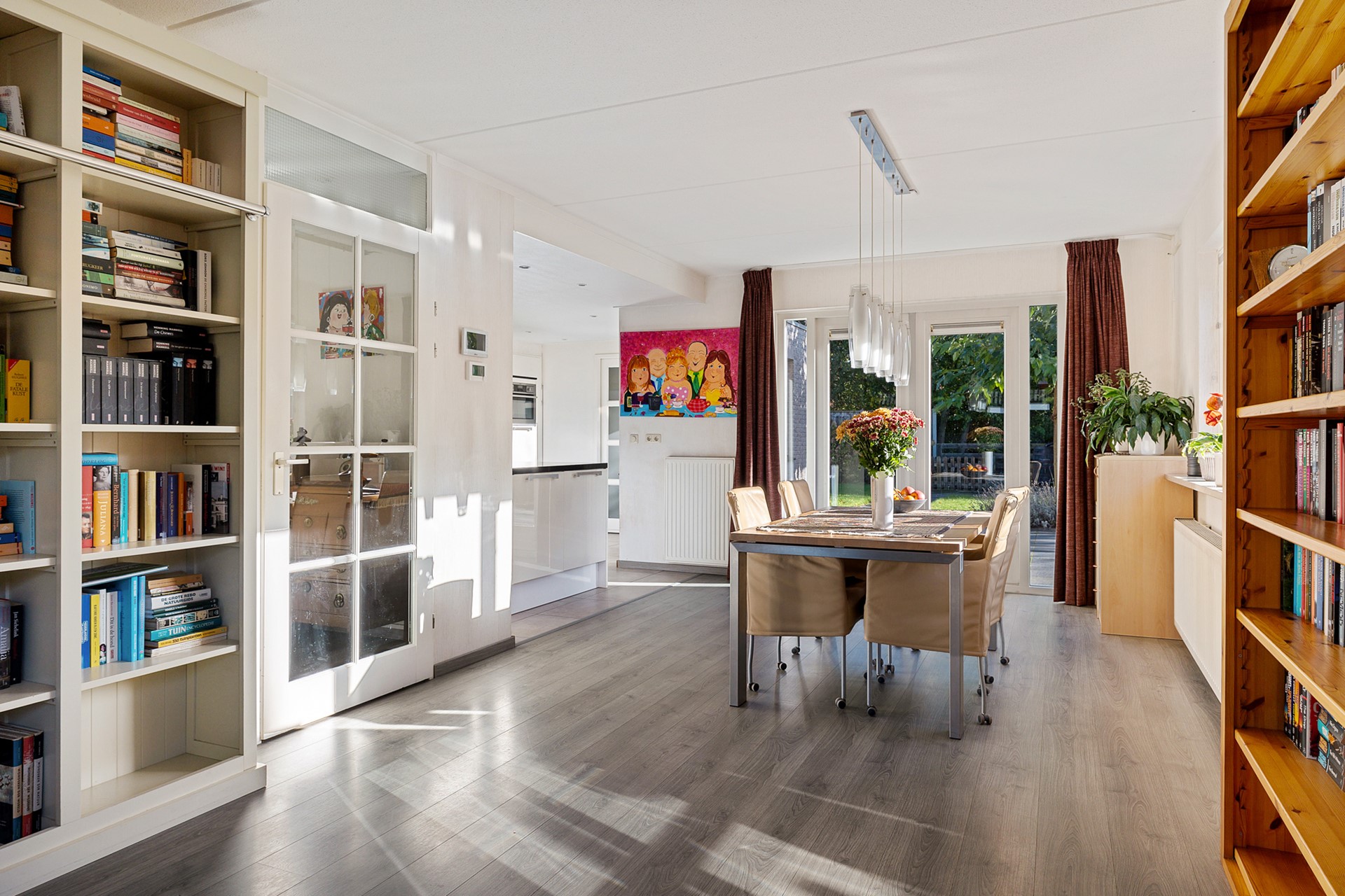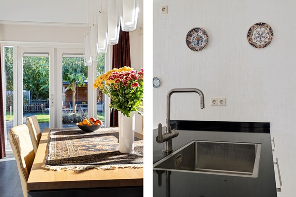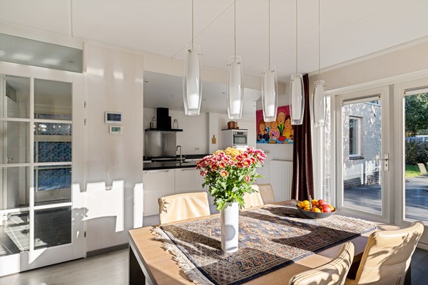 Er is ruimte voor een grote eettafel en de openslaande deuren naar de tuin nodigen je in de zomer uit om buiten te gaan eten.