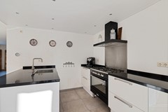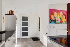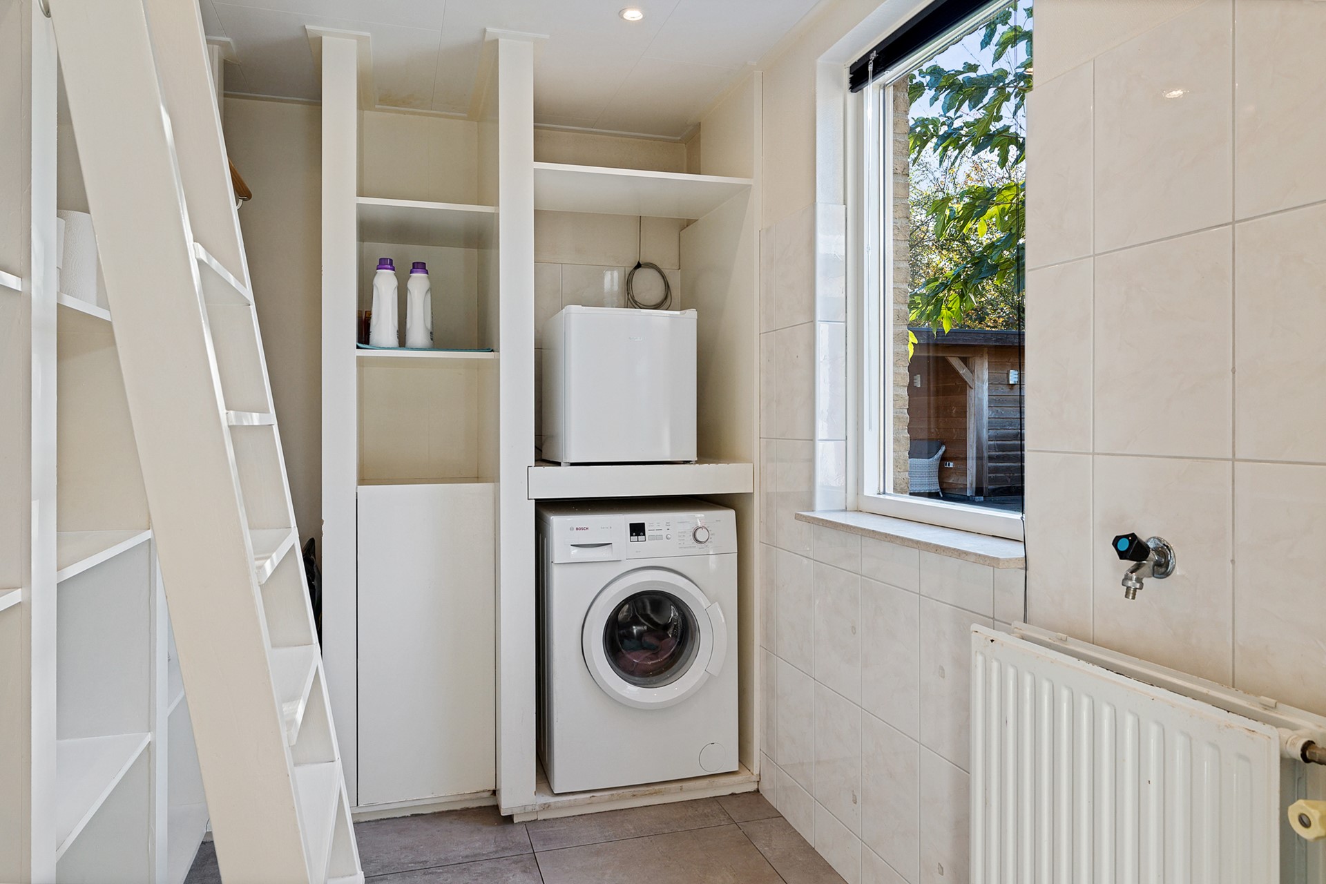 De bijkeuken is bereikbaar met een schuifdeur en voorzien van veel bergruimte. Handig is dat de lamp automatisch aangaat en dat er een verrijdbare ladder is om spullen hoger op te bergen. De ruimte is op maat gemaakt voor de wasmachine en droger.