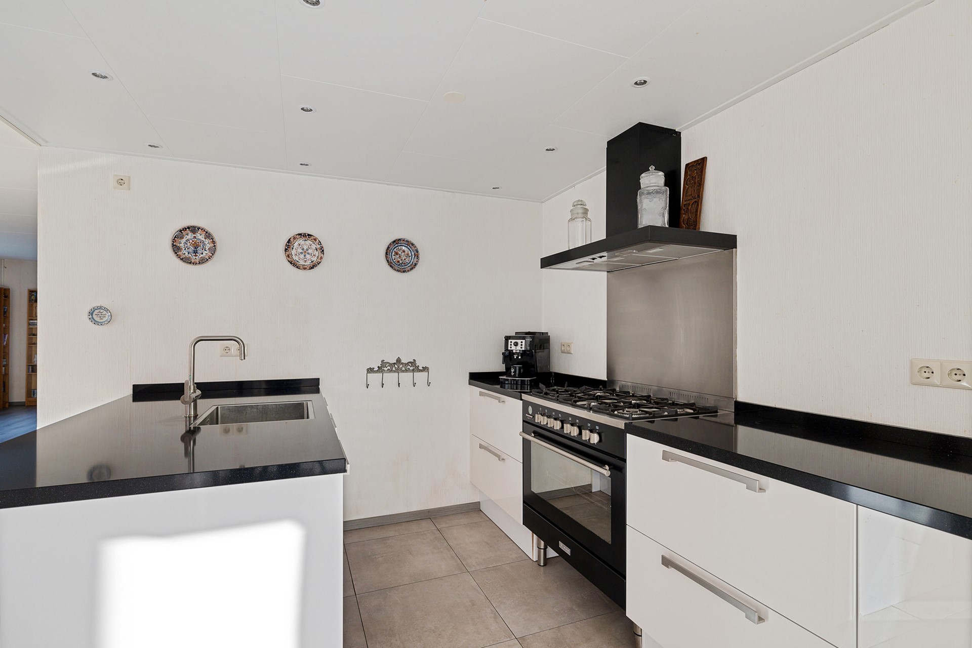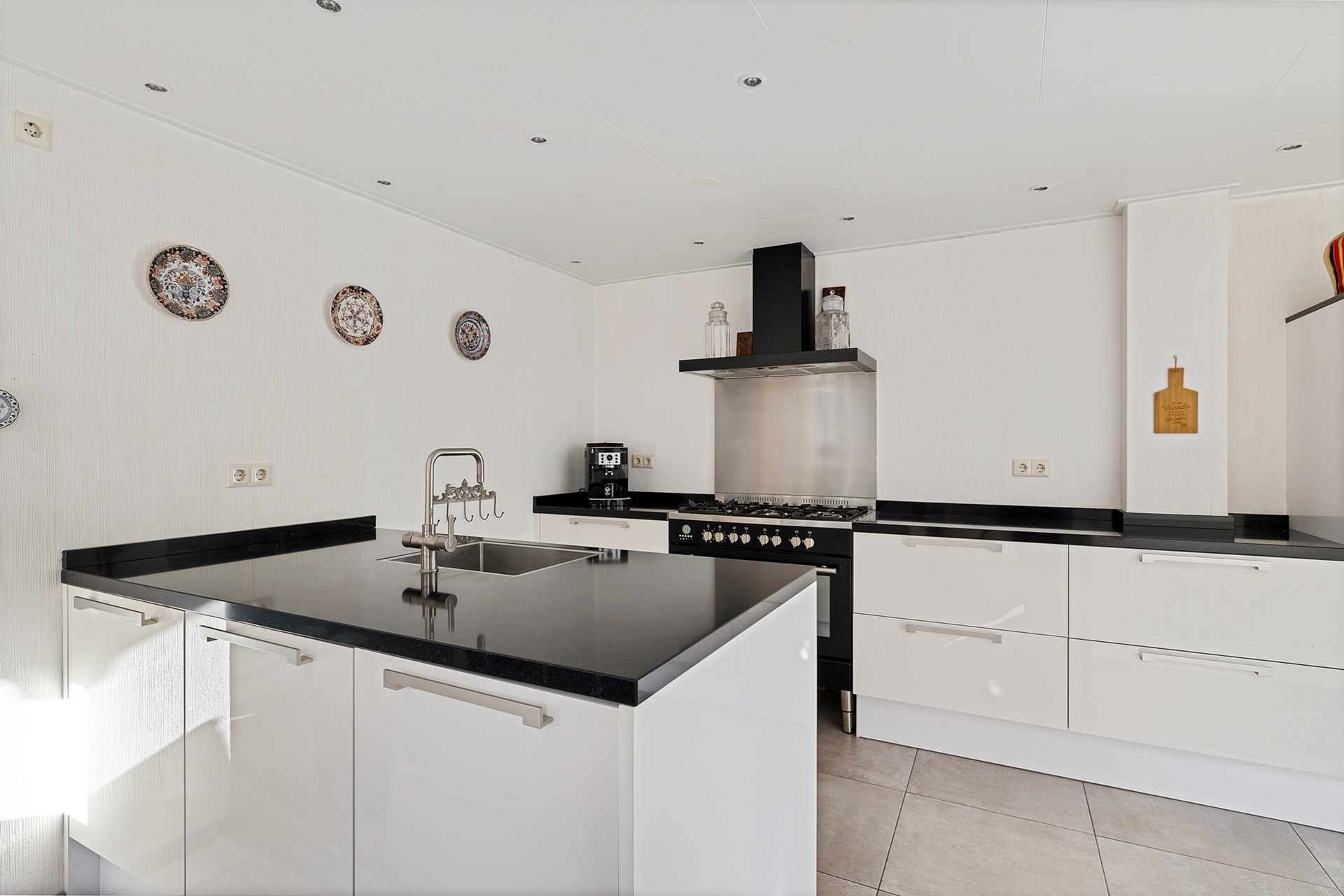 De royale inbouwkeuken uit met spoeleiland is een leefkeuken te noemen. De keuken is geplaatst in 2016 en is compleet uitgerust met een Quooker kraan, een luxe Boretti gasfornuis inclusief een oven, een heteluchtoven/magnetron, een marmeren blad en dimbare ledverlichting.