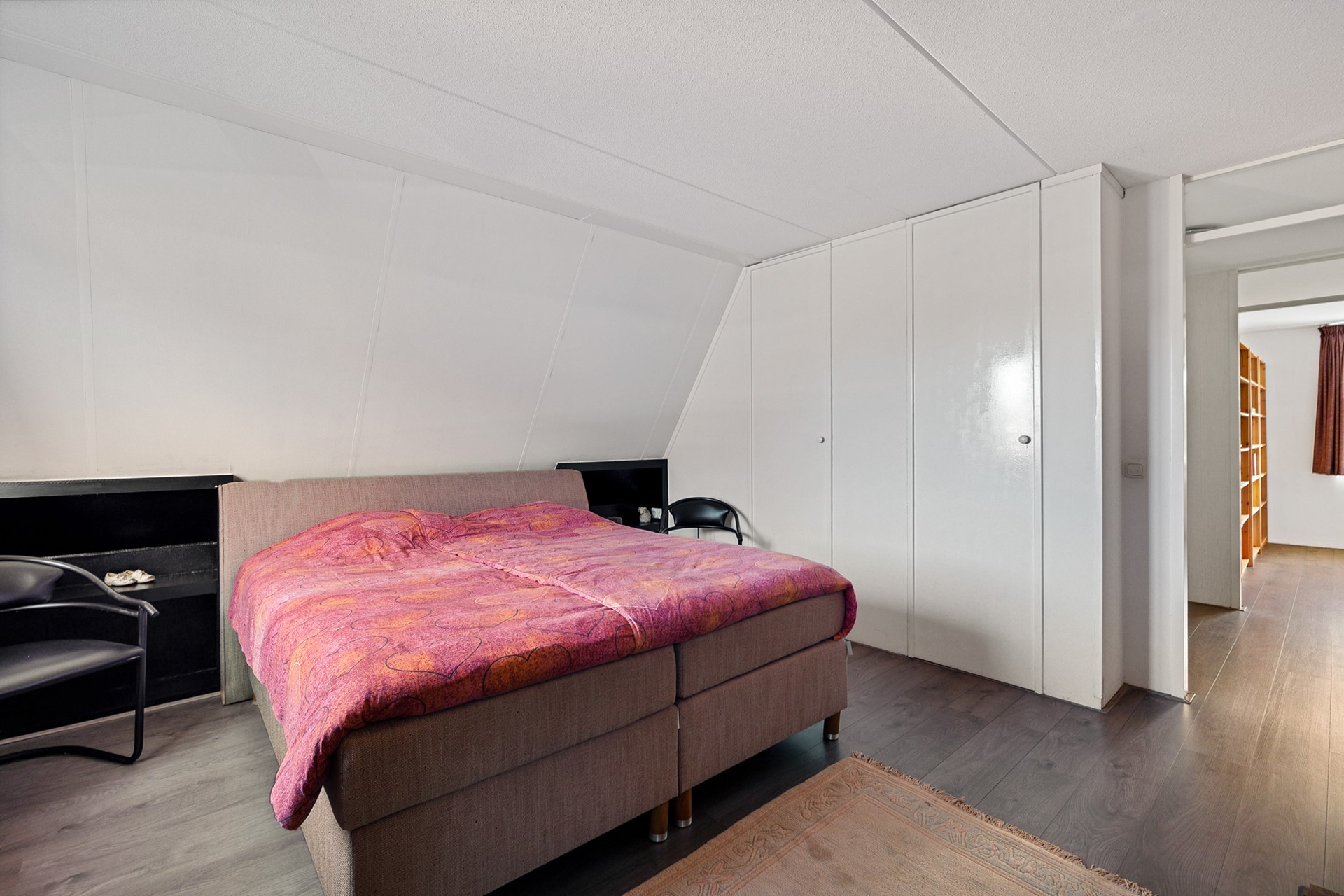 Vanuit de hal bereik je twee slaapkamers, allebei groot genoeg om een tweepersoonsbed te plaatsen. Daarnaast is er extra bergruimte aanwezig.