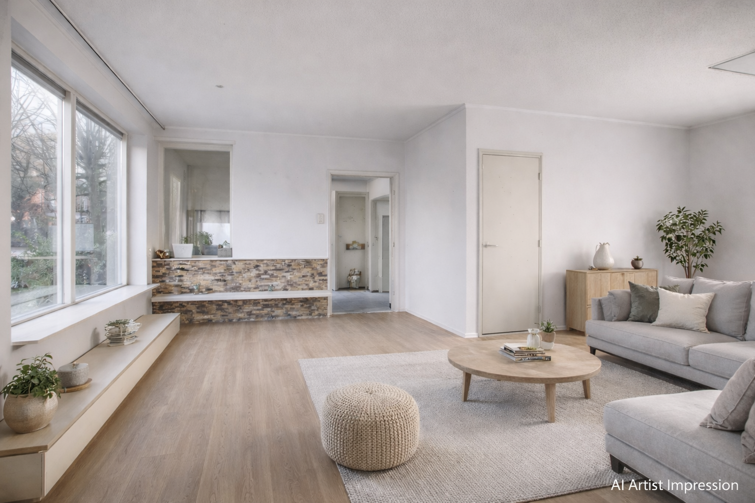 Om een indruk te geven van de mogelijkheden zijn AI-gegenereerde artist impressions toegevoegd. Deze beelden dienen ter inspiratie en laten zien hoe de woning er na renovatie uit zou kunnen zien.