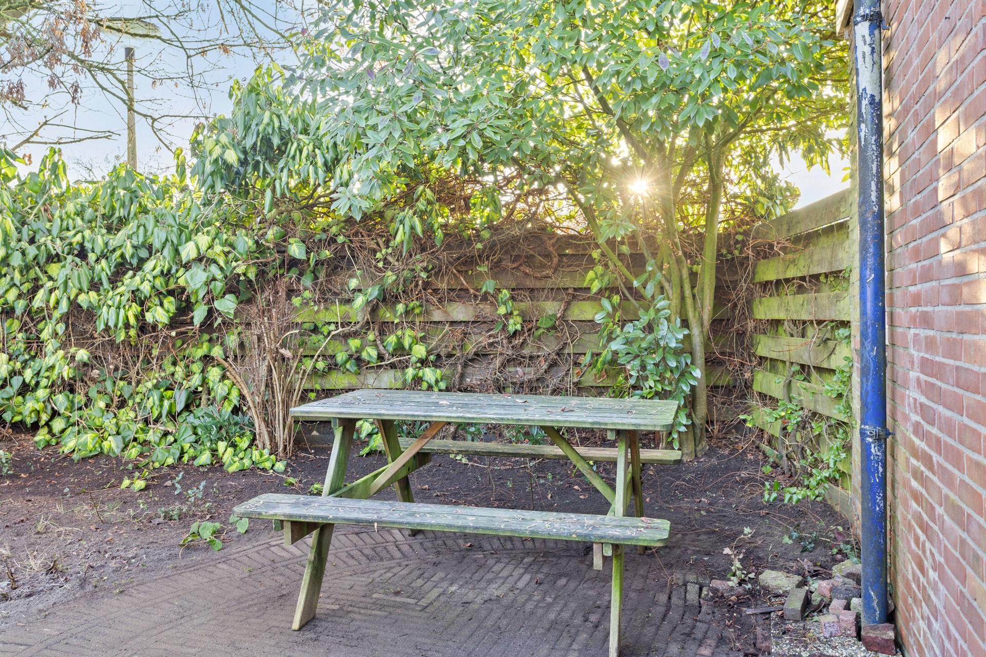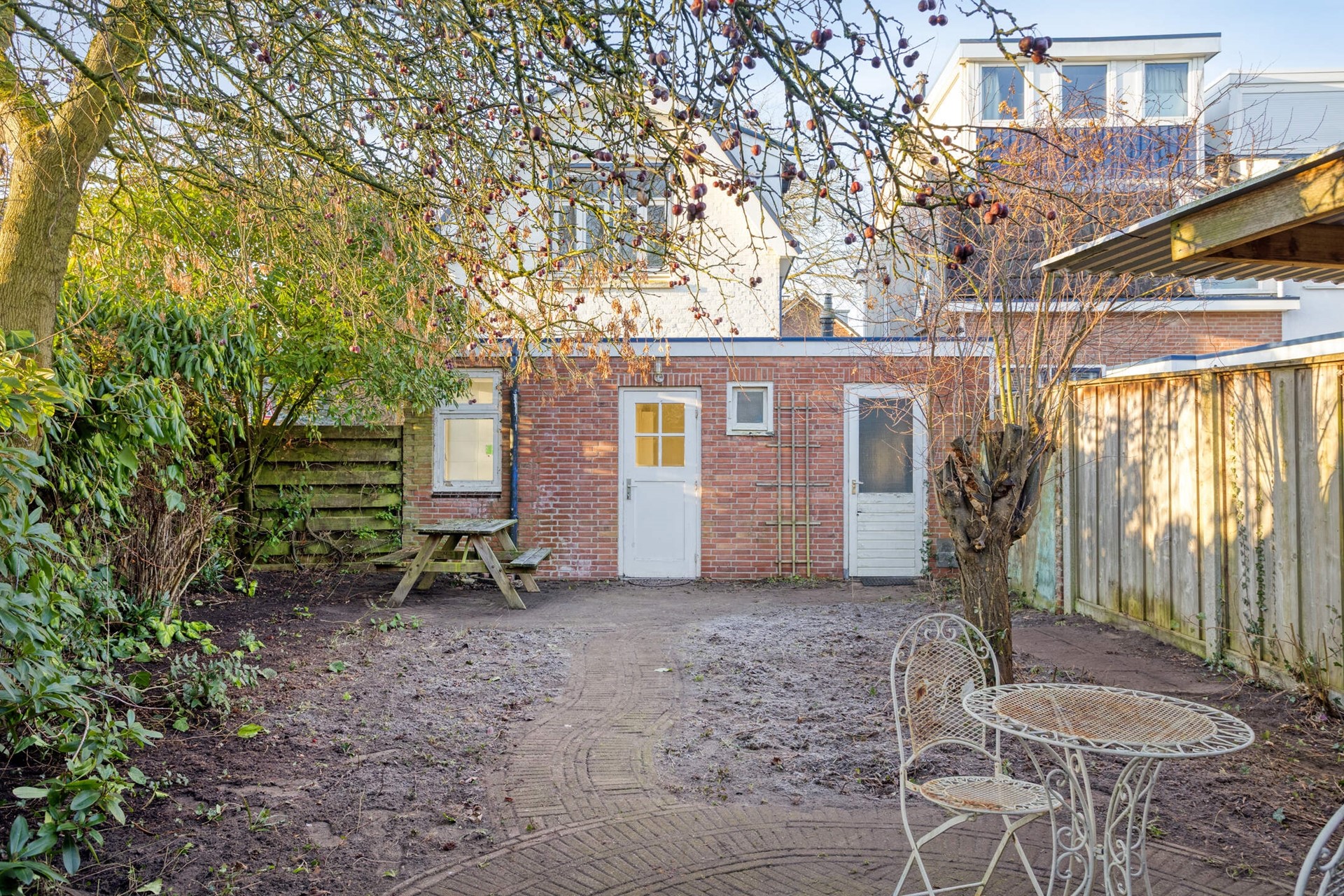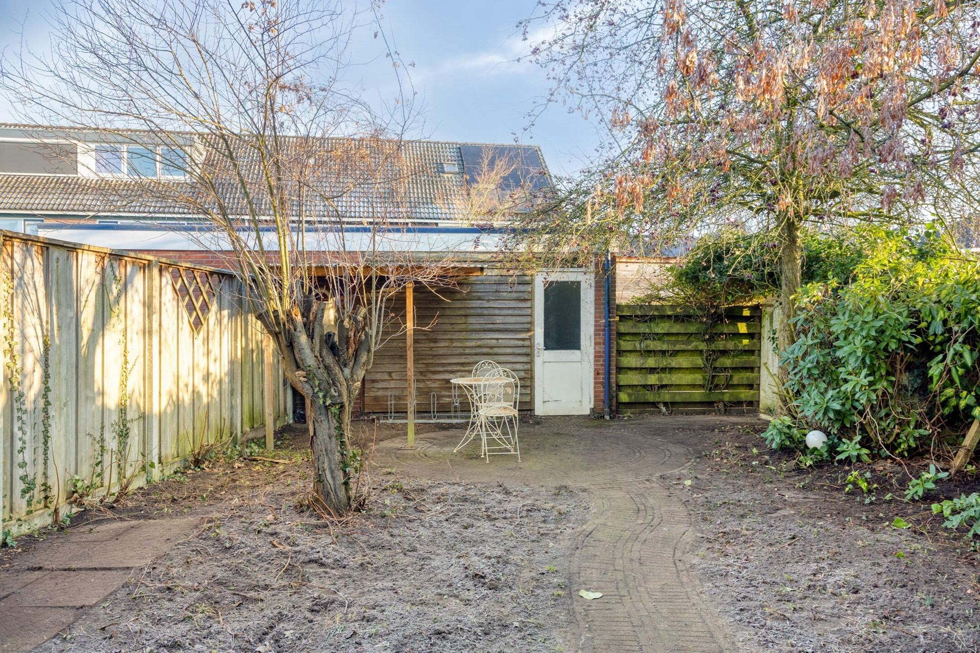 De tuin is bereikbaar via de achterzijde van de woning en beschikt over een achterom. In de tuin bevinden zich een aangebouwde stenen berging met opstelplaats voor de HR combi-ketel (niet werkend) en een vrijstaande stenen enkele garage.