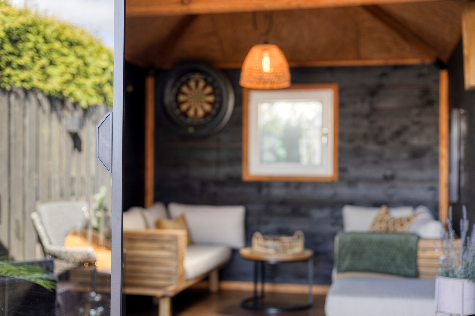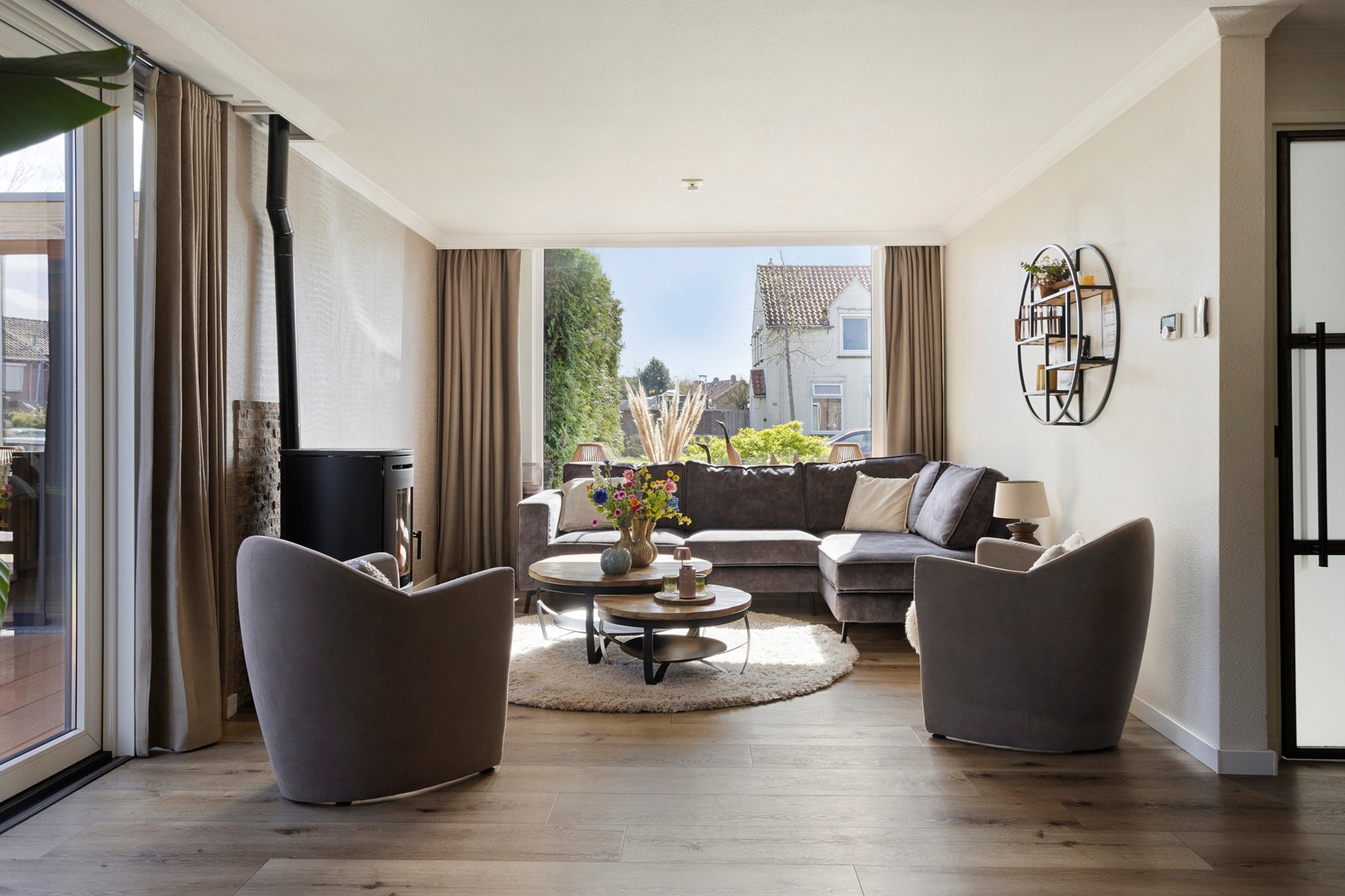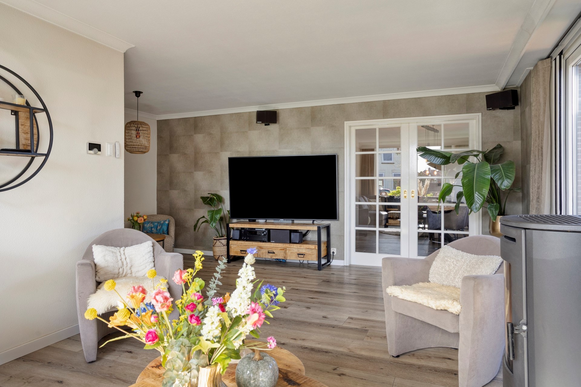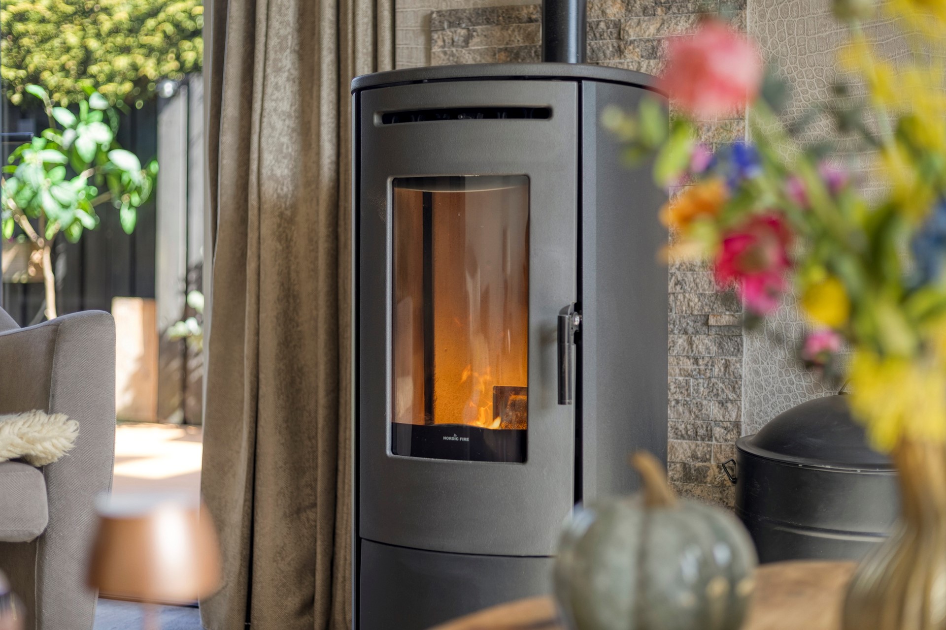 In de lichte woonkamer staat een sfeervolle Nordic pelletkachel en er zijn openslaande tuindeuren naar de zijkant van de tuin.