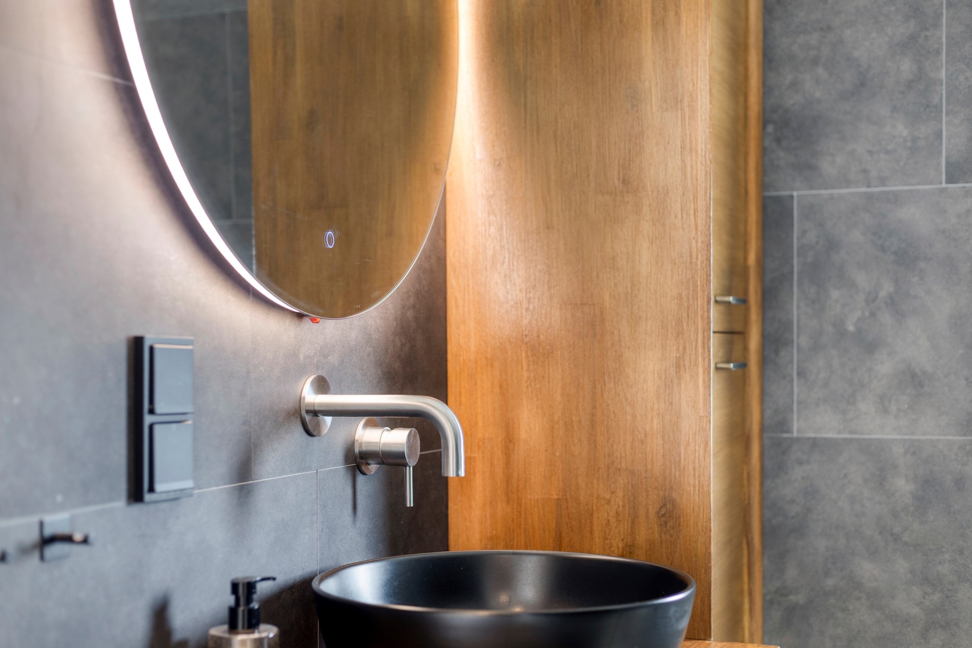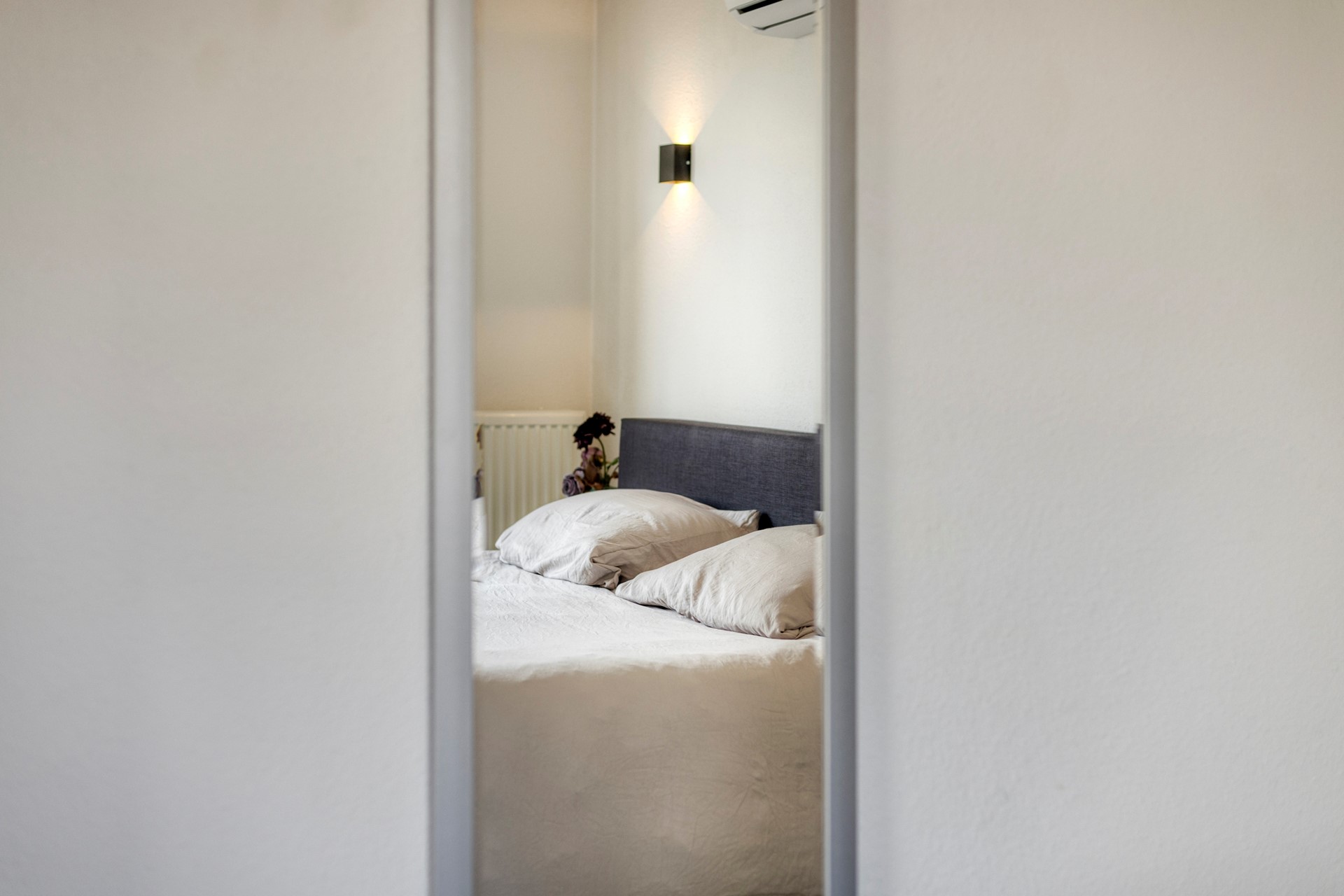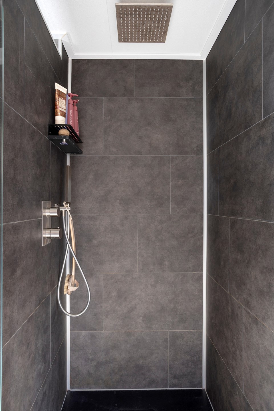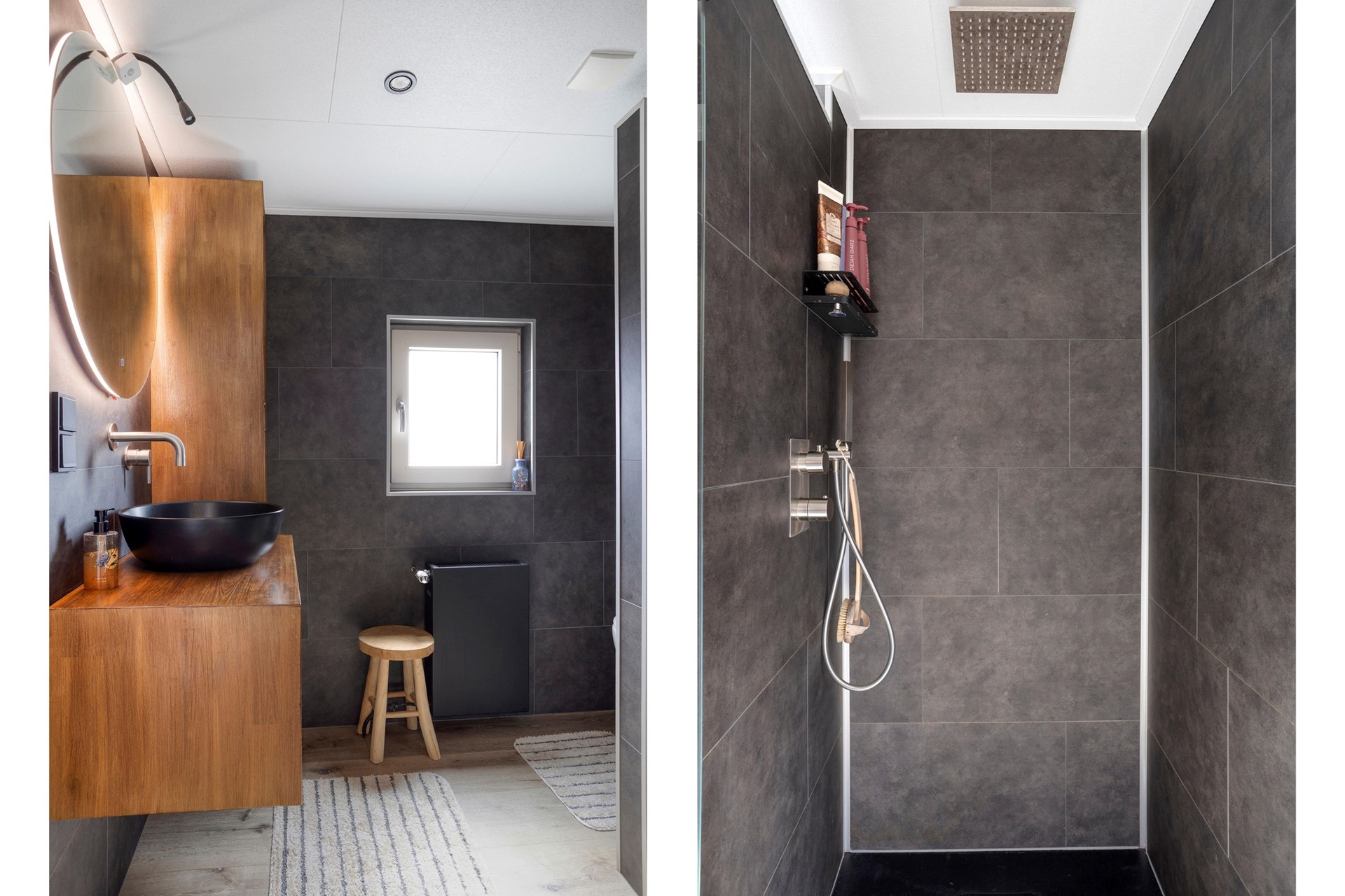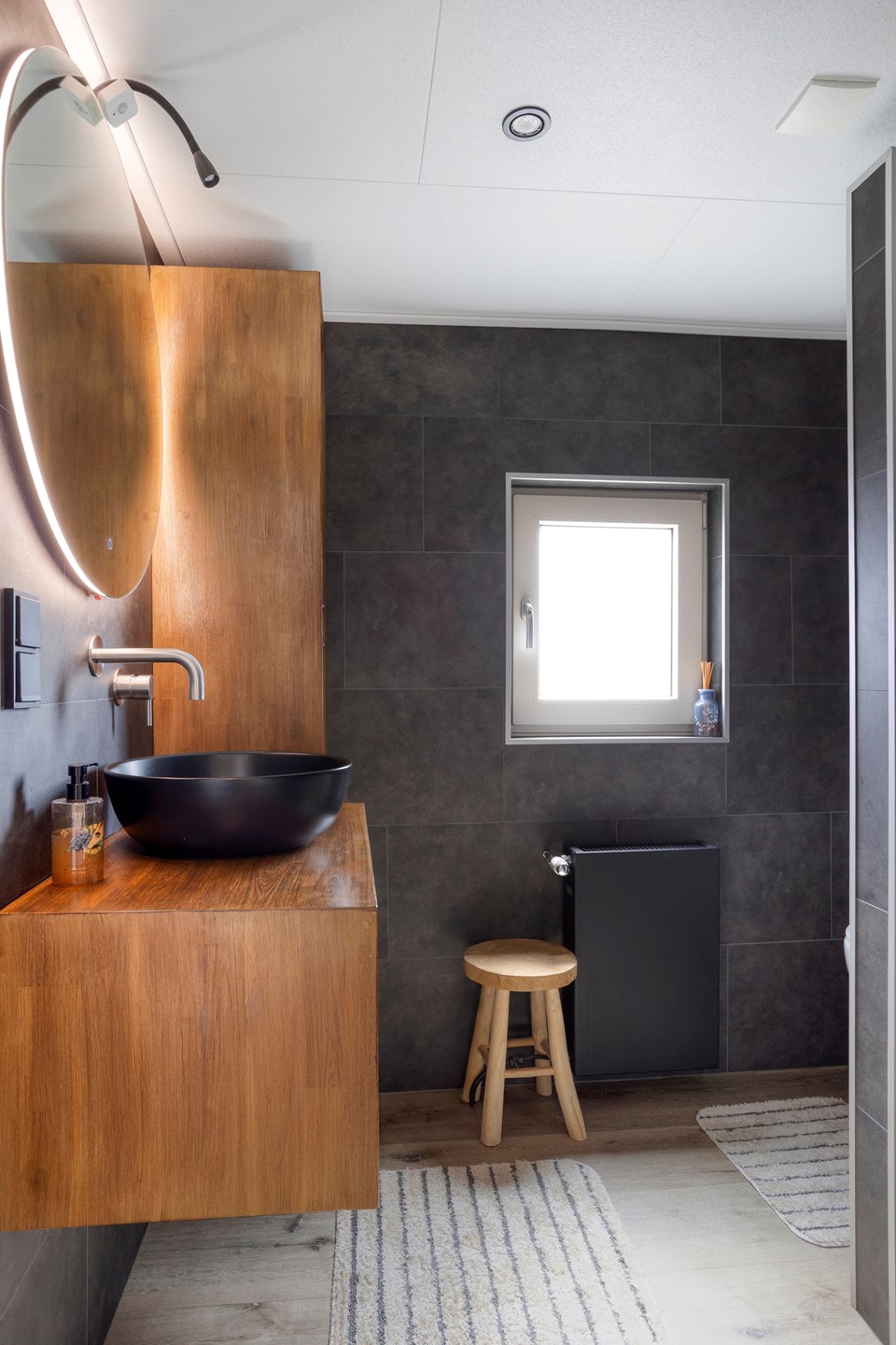 Boven zijn drie slaapkamers en een moderne badkamer (2023) met inloopdouche, wastafelmeubel, toilet en vloerverwarming.