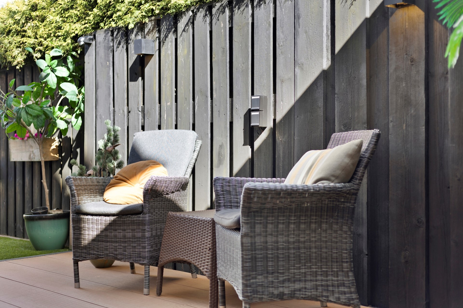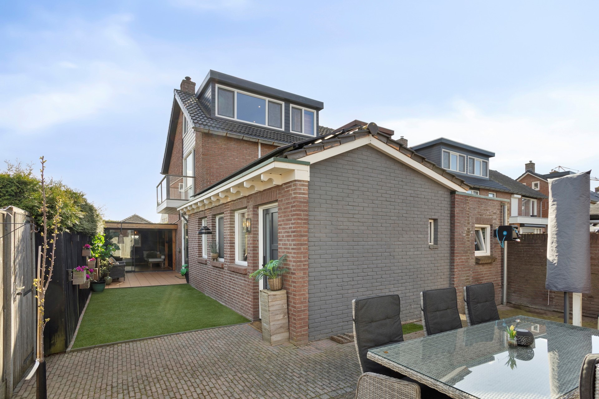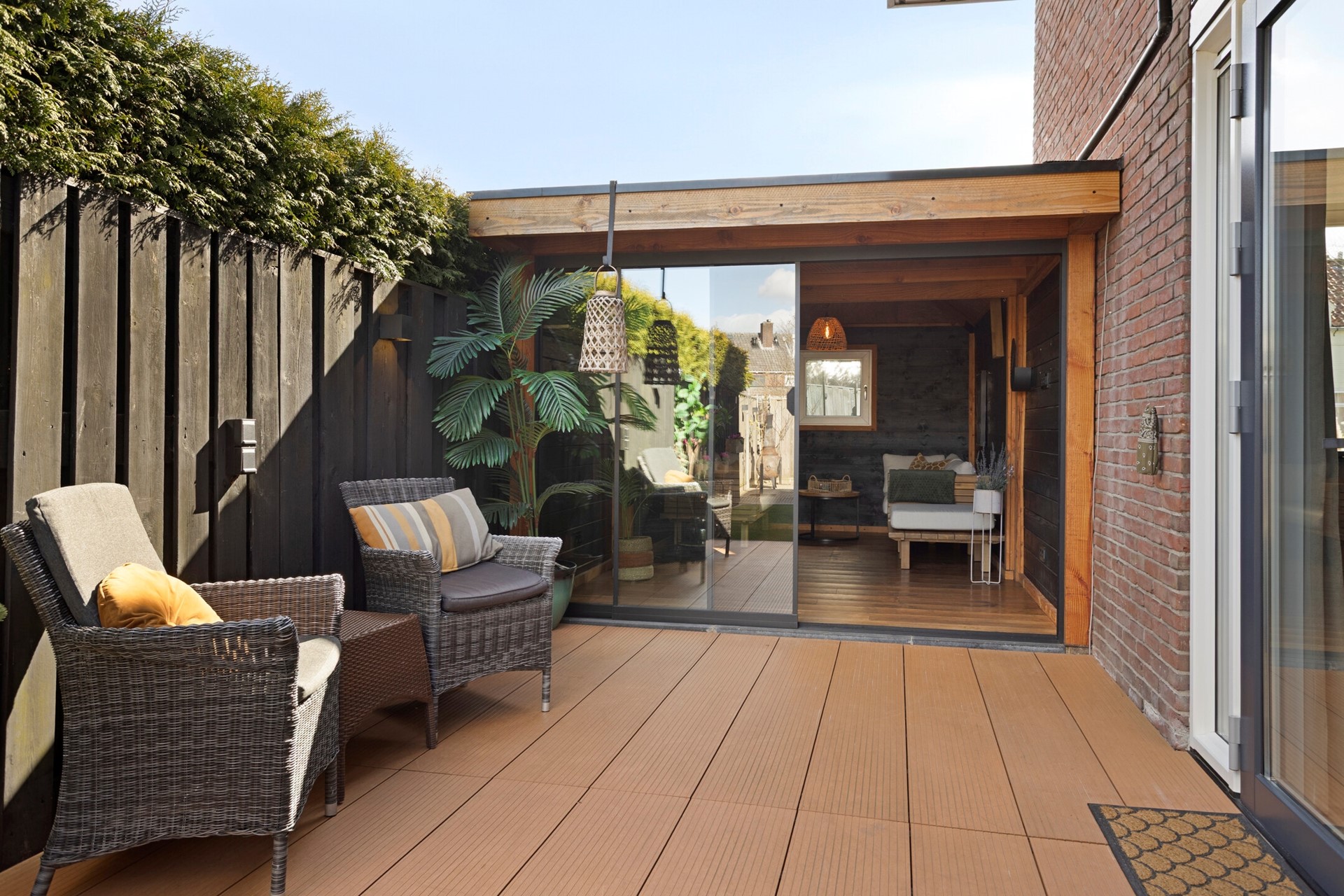 Achter de keuken is een kleine hal met het toilet en de uitgang naar de ruime, zonnige en onderhoudsvrije tuin met schuur, garage en een supergezellig tuinhuis, ideaal voor feestjes en fijne avonden.