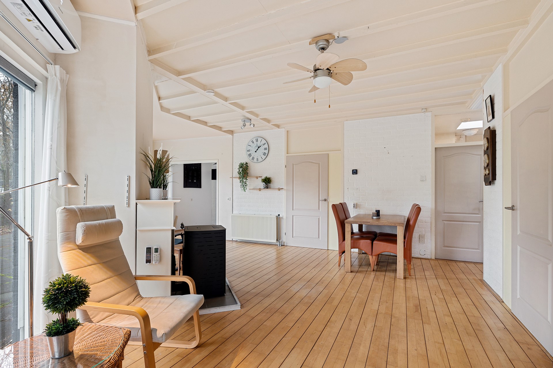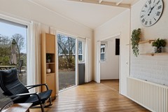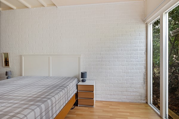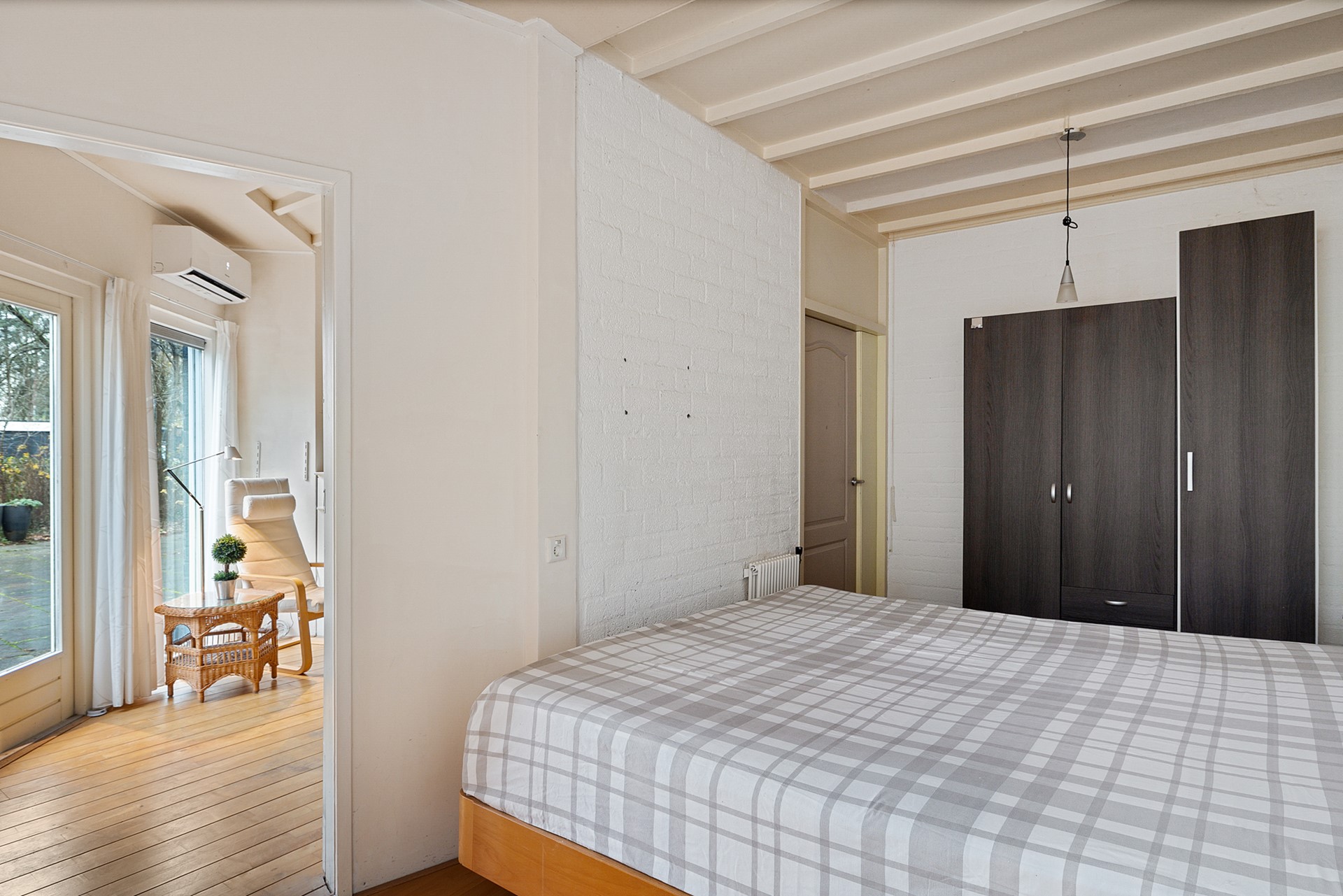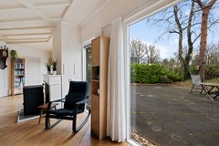 De woonkamer heeft rondom ramen tot aan de grond waardoor er veel lichtinval in de kamer is en vanuit hier heb je een mooi uitzicht op de tuin. Via de tuindeur tussen de woonkamer en slaapkamer stap je zo het terras op waar je heerlijk kunt genieten.