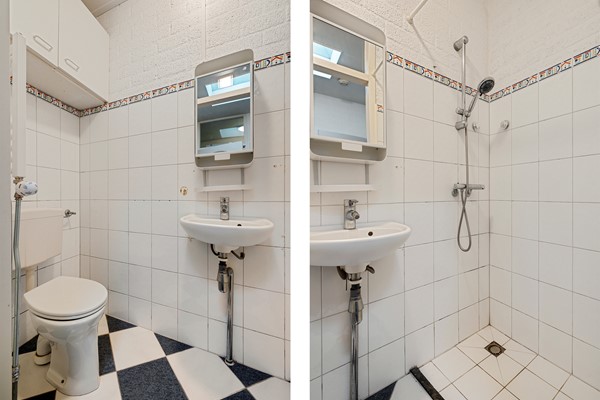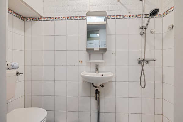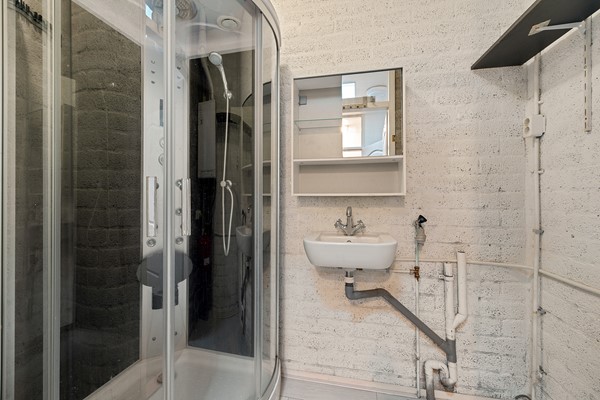 De compacte badkamer is voorzien van een toilet, wastafel en een douche. Daarnaast is er een ruimte wat eerder de berging was, hier is een begin gemaakt voor het realiseren van een modernere badkamer, met een luxe massage douchecabine. Ook zit hier de aansluiting voor de wasmachine en/of droger.