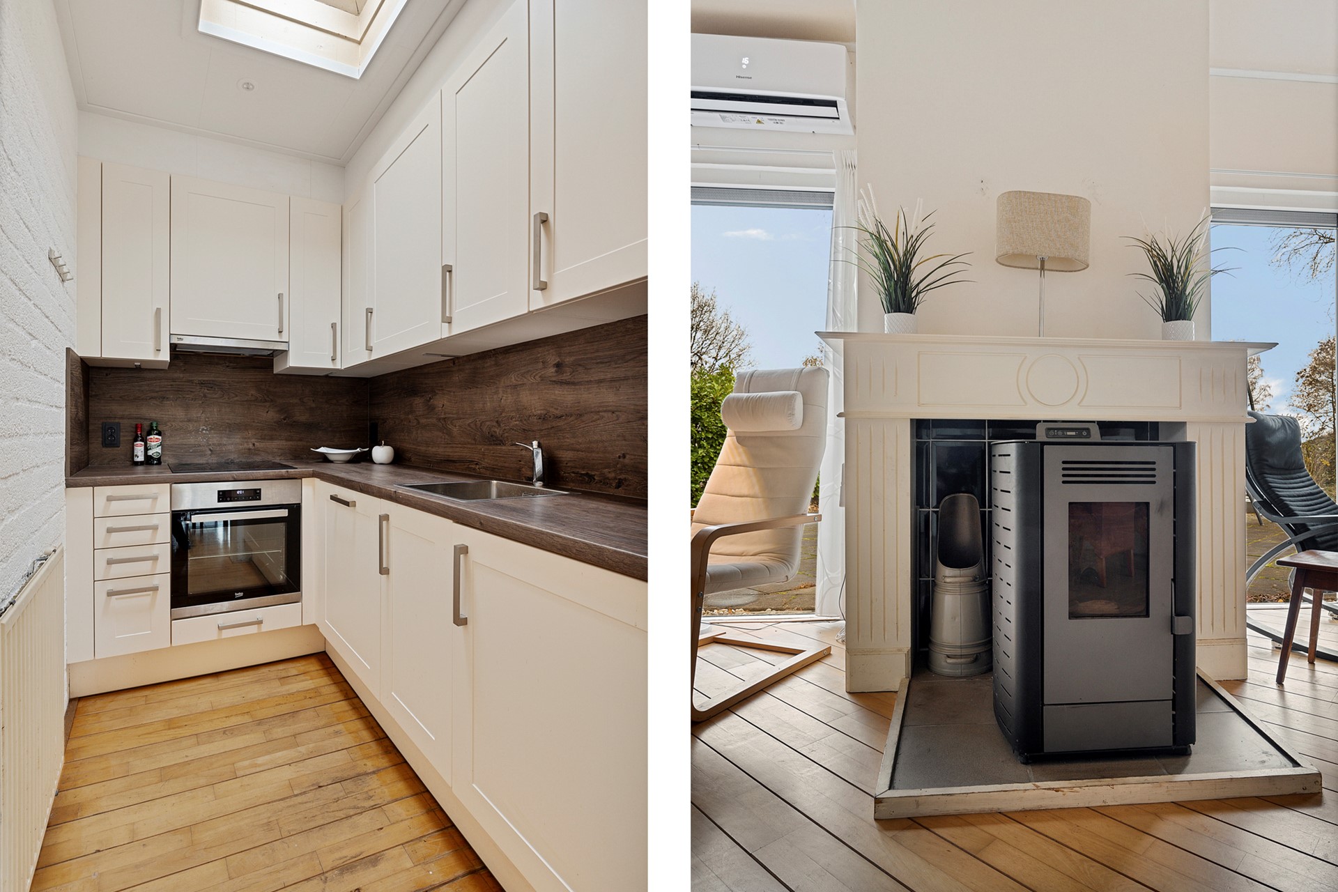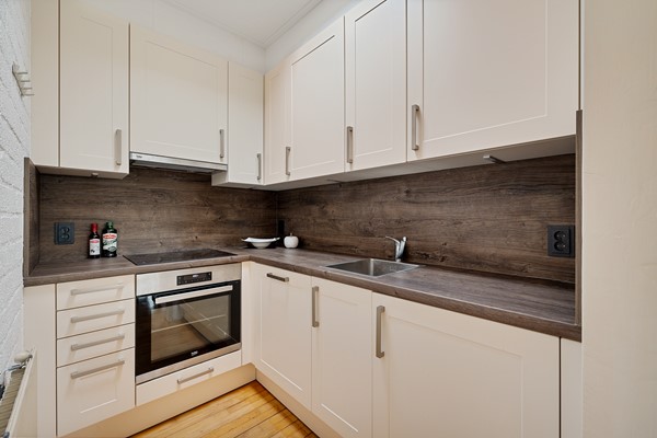 De halfopen nette keuken is van 2021/2022 en kent een L-vormige opstelling en een lichte kleurstelling. De keuken is voorzien van een inbouw 4-pits inductiekookplaat, een afzuigkap, een spoelbak en een koelkast. De keuken is ook voorzien van een lichtkoepel voor extra lichtinval.