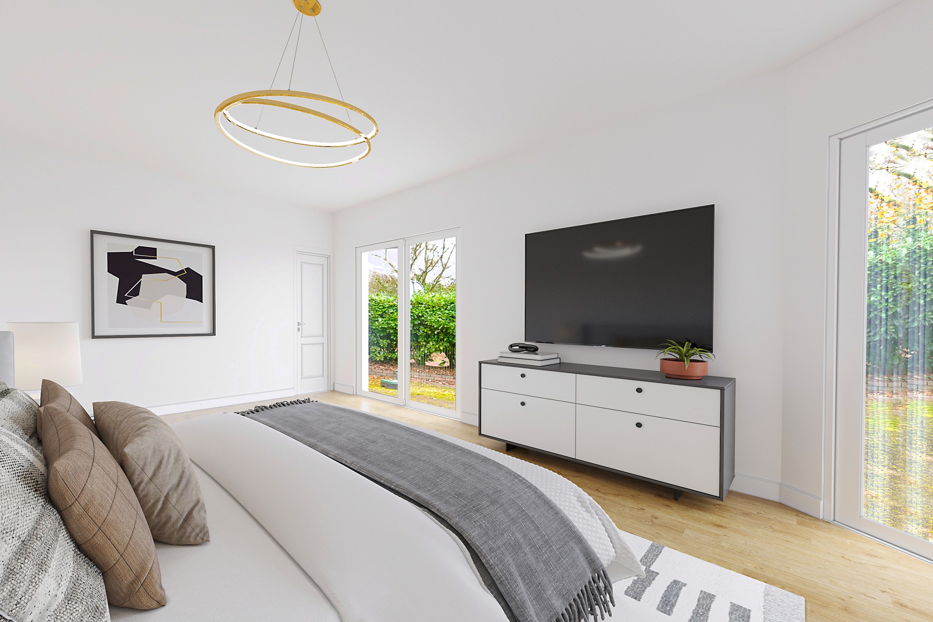 Je betreedt de bungalow via de rechtervleugel huisnummer 170. Vanuit de hal bereik je twee slaapkamers, waaronder een ruime masterbedroom met directe toegang tot de grote badkamer. Deze badkamer is uitgerust met een ligbad, inloopdouche, hangtoilet en wastafelmeubel.