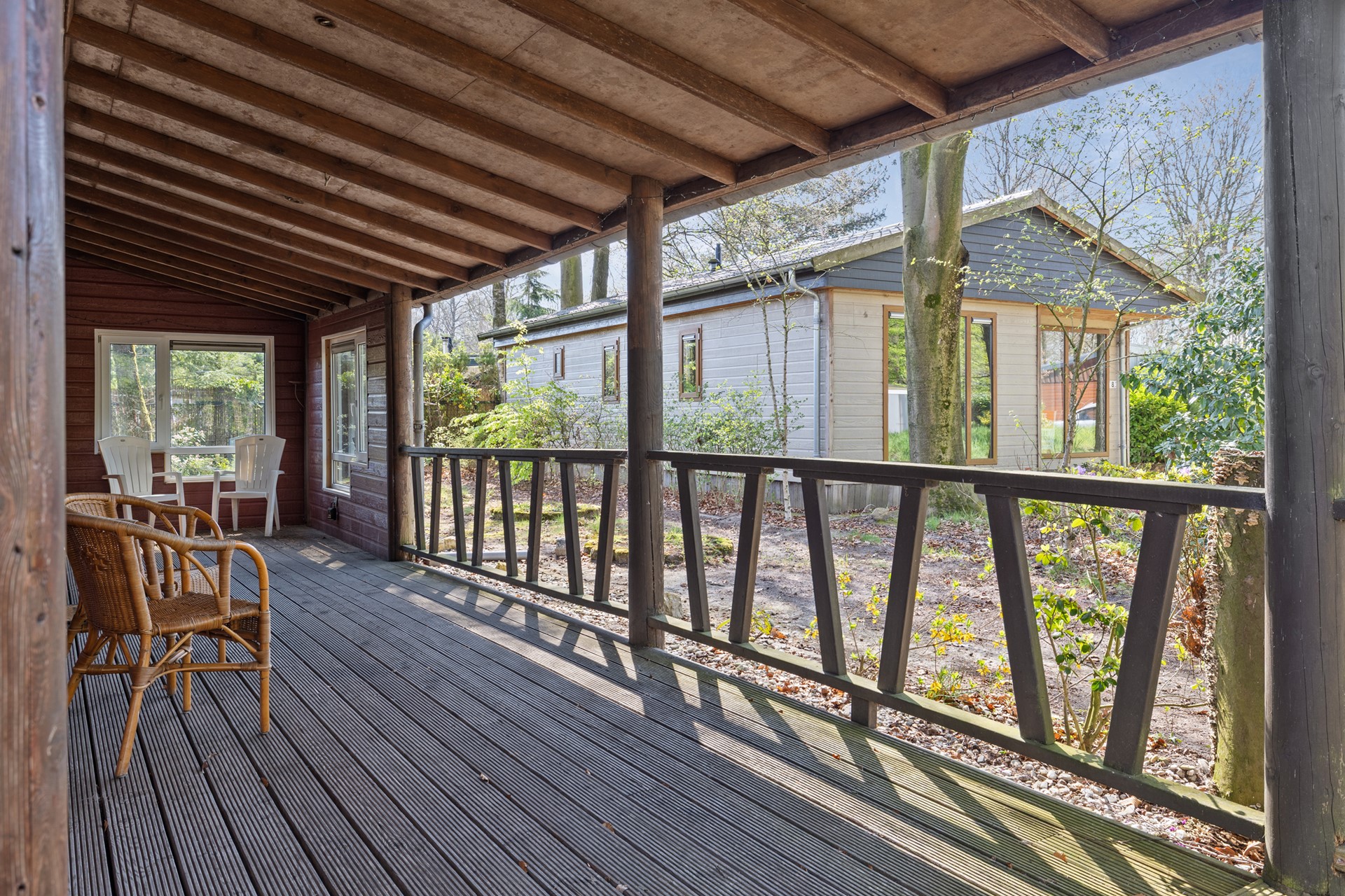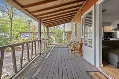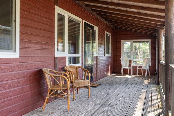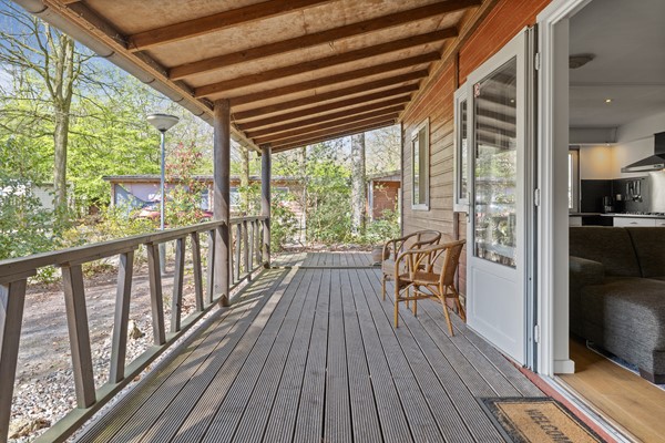 De chalet, geplaatst in 2010, is praktisch ingedeeld en onderhoudsarm uitgevoerd met canexel gevelbekleding en kunststof kozijnen. De royale veranda van Siberisch larikshout zorgt ervoor dat je vrijwel het hele jaar comfortabel buiten kunt zitten.