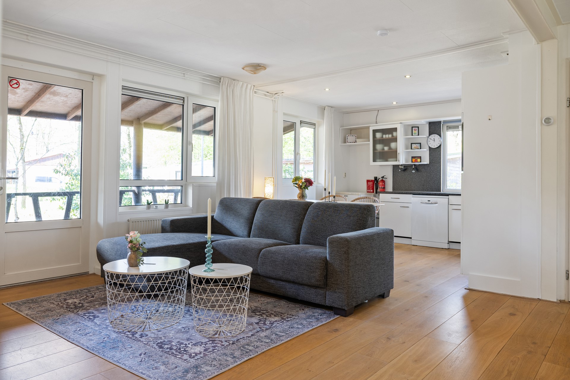 De chalet beschikt over een lichte woon-/eetkamer met directe toegang tot de veranda en een open keuken. De nette inbouwkeuken is geplaatst in een hoekopstelling en compleet ingericht met een kookplaat met afzuigkap, een oven, een koel-vrieskast en een vaatwasser.