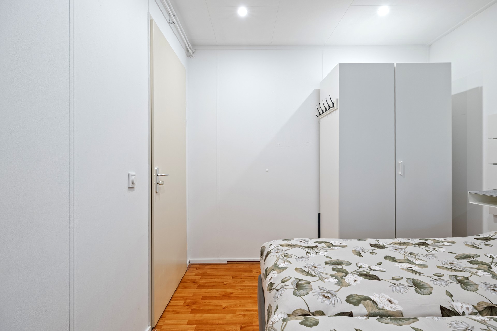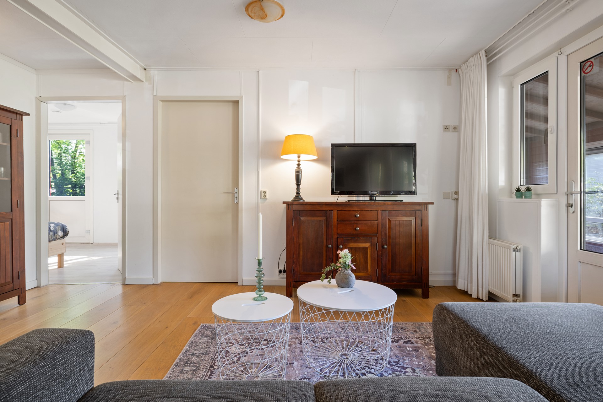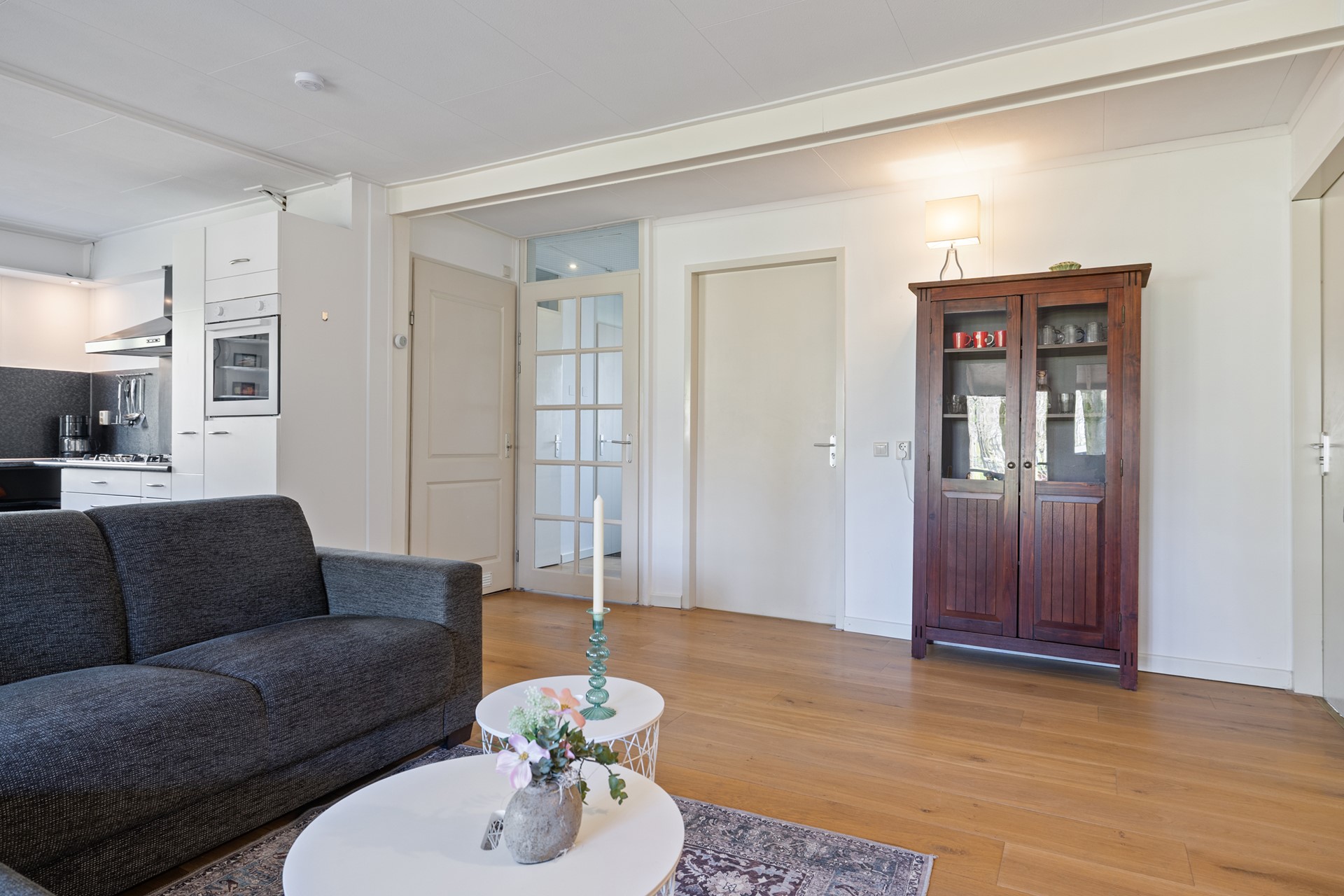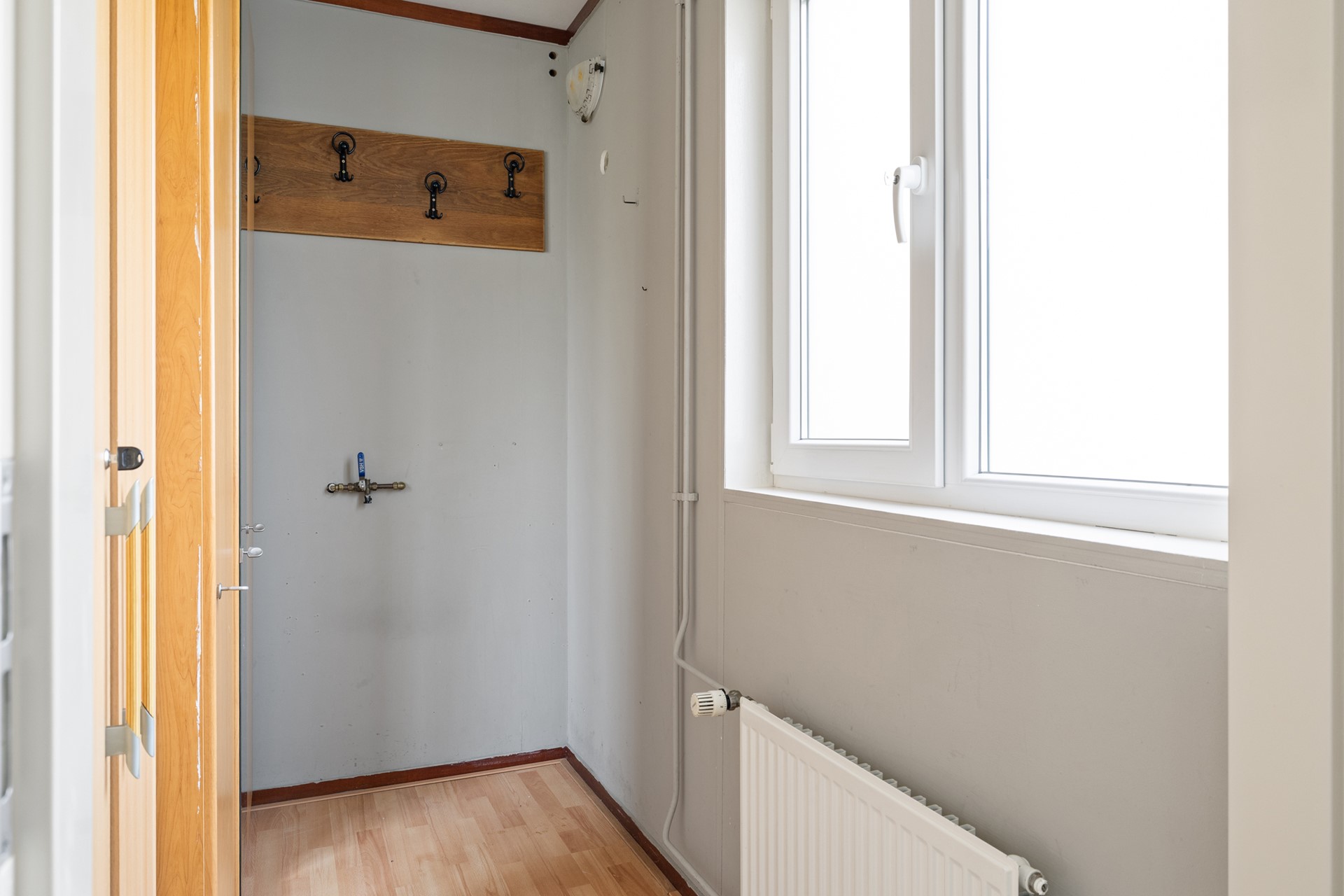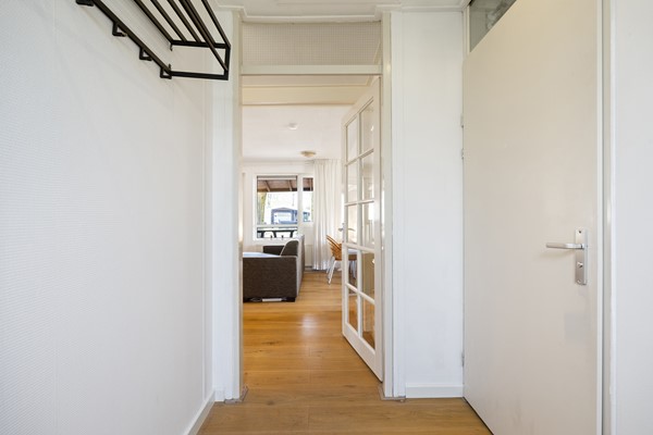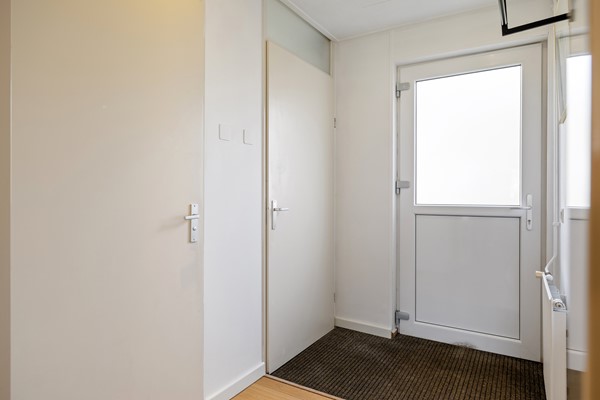 Als je door de voordeur naar binnen gaat, kom je binnen in de hal. De hal biedt toegang tot de berging en de badkamer. Vanuit de tussendeur bereik je de woonkamer.