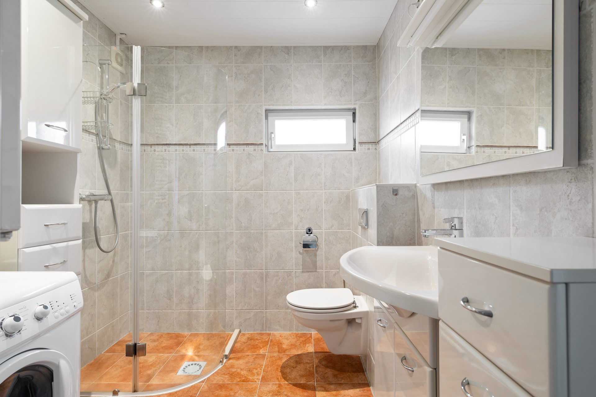 De badkamer is volledig betegeld en voorzien van een douche, een toilet, een wastafelmeubel, een designradiator en een aansluiting voor de wasmachine en/of droger.