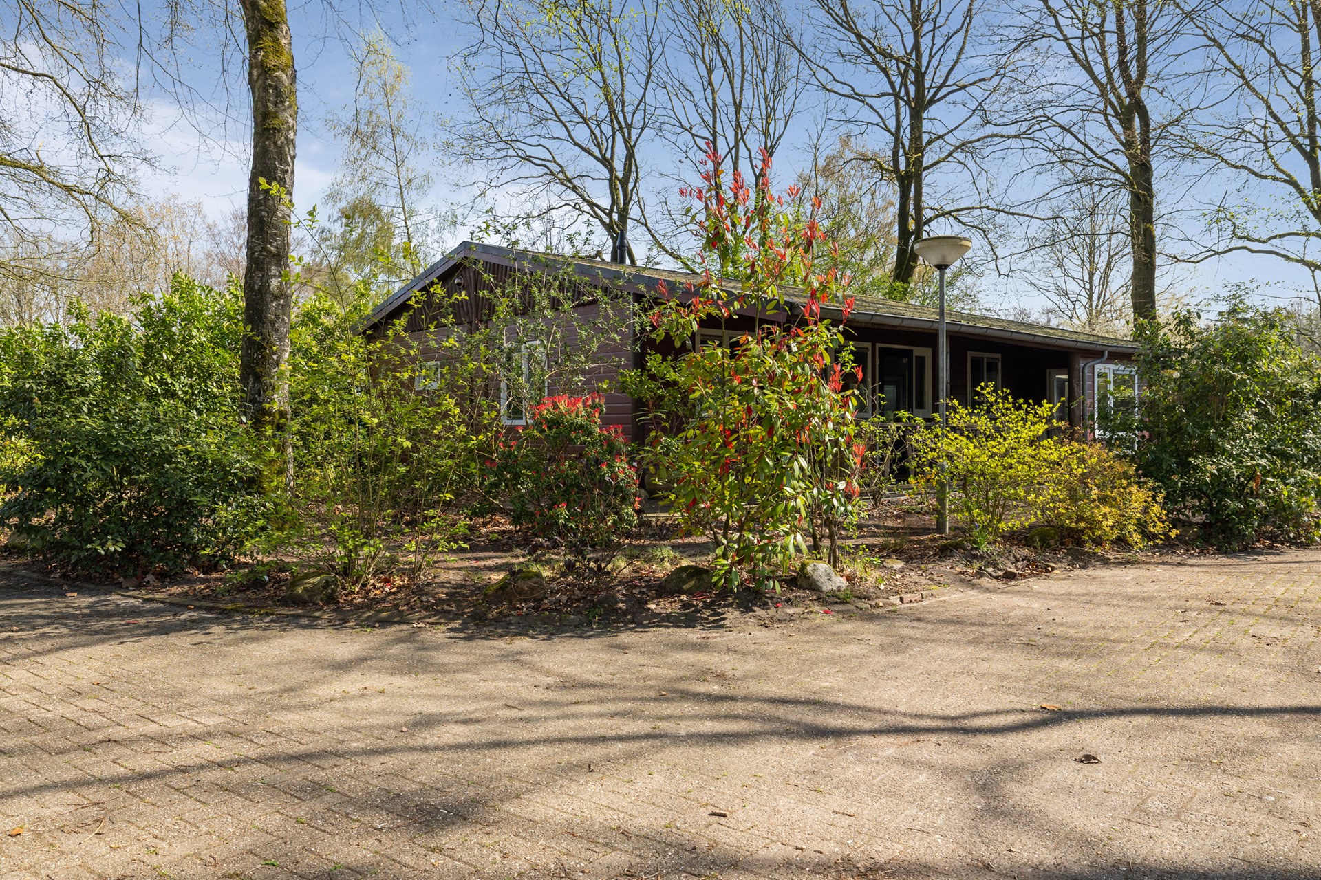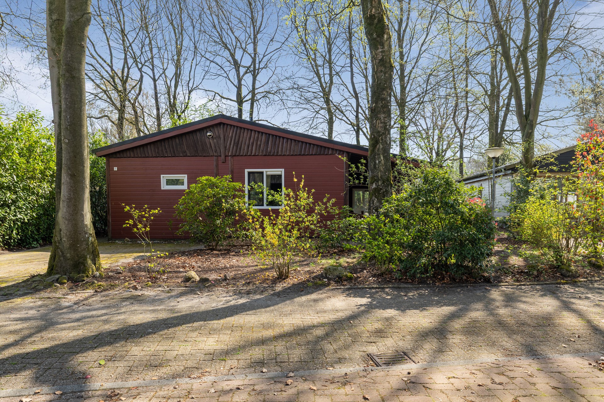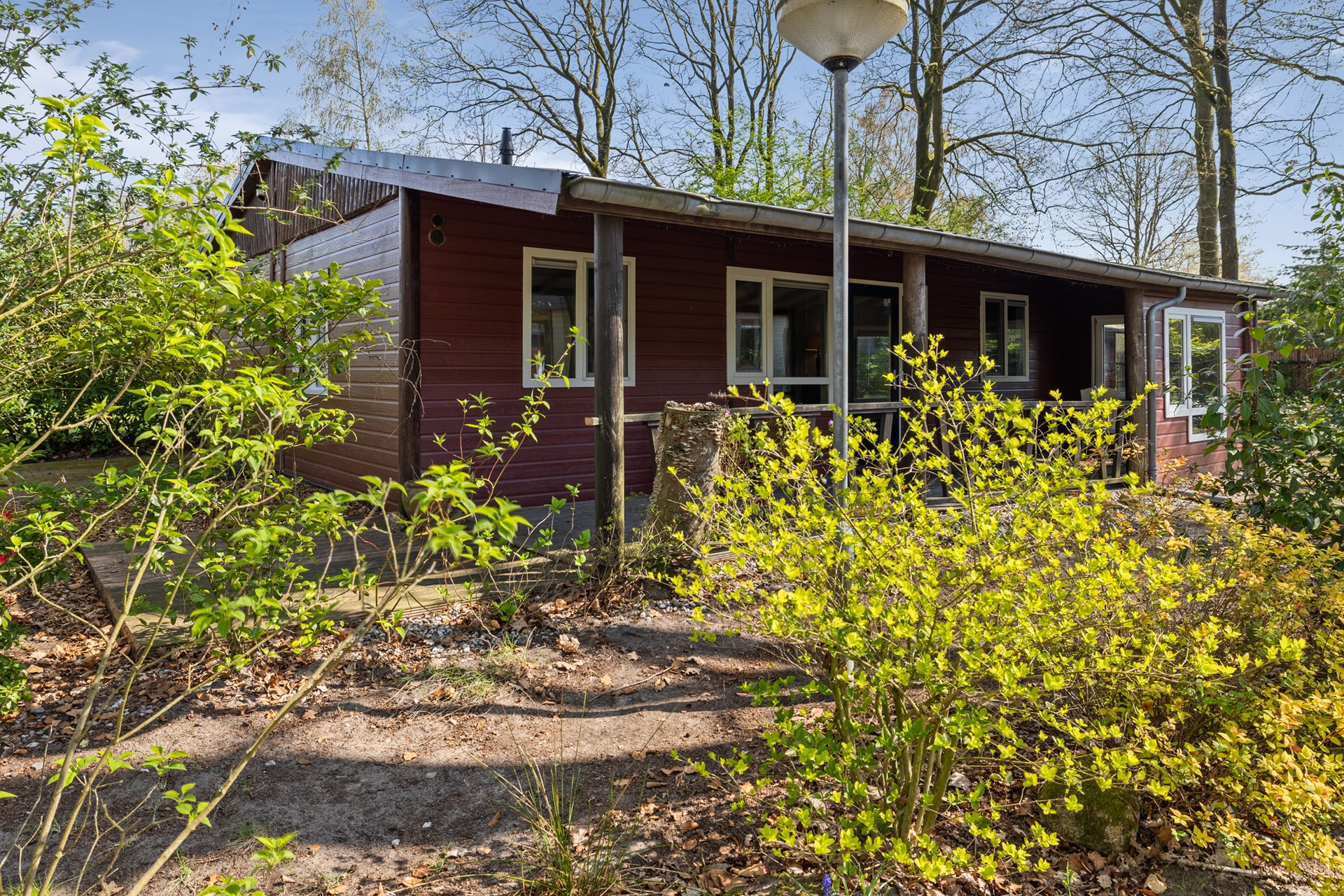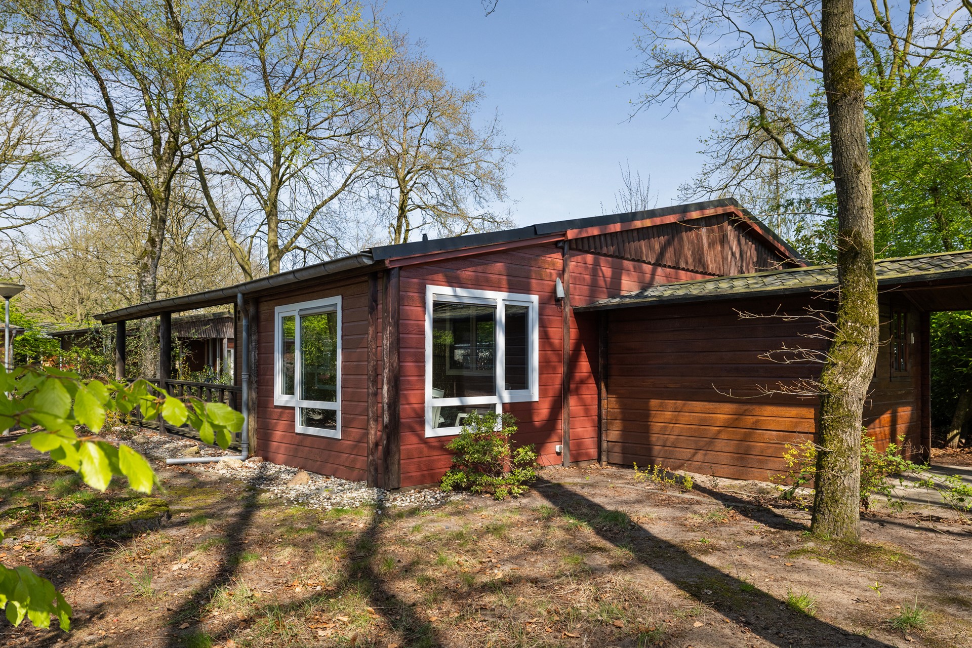 De chalet is vanaf de parkeergelegenheid op eigen terrein bereikbaar en zowel via de voordeur als via de overdekte entree onder de veranda toegankelijk.