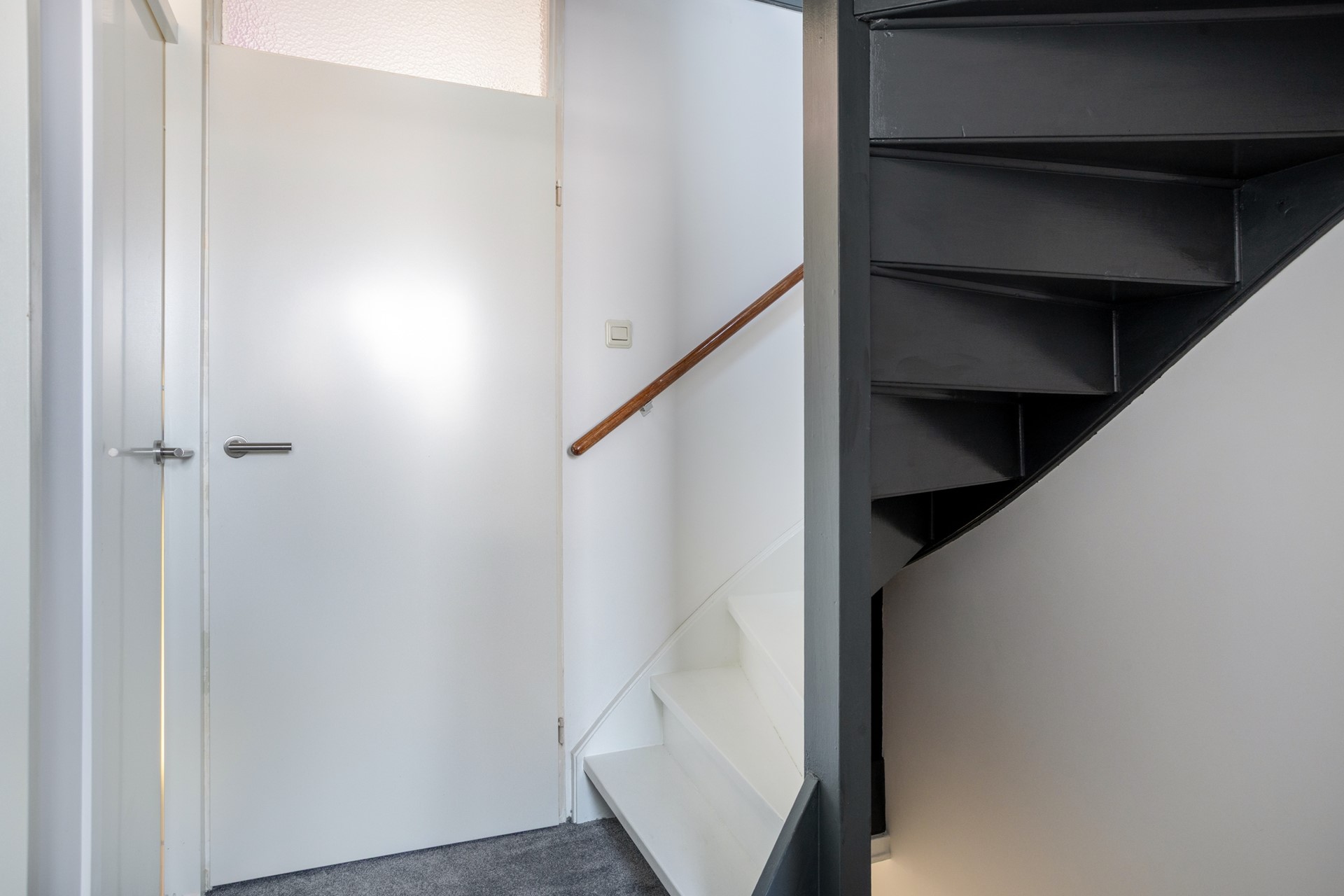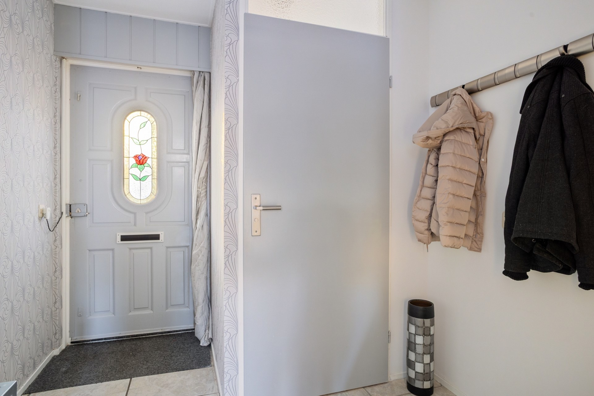 Gezellige binnenkomst van de woning in deze praktische hal. Er is plaats genoeg om de jassen op te hangen zonder dat de doorgang wordt geblokkeerd. De hal geeft toegang tot de woonkamer, meterkast, het toilet, en de trapopgang.