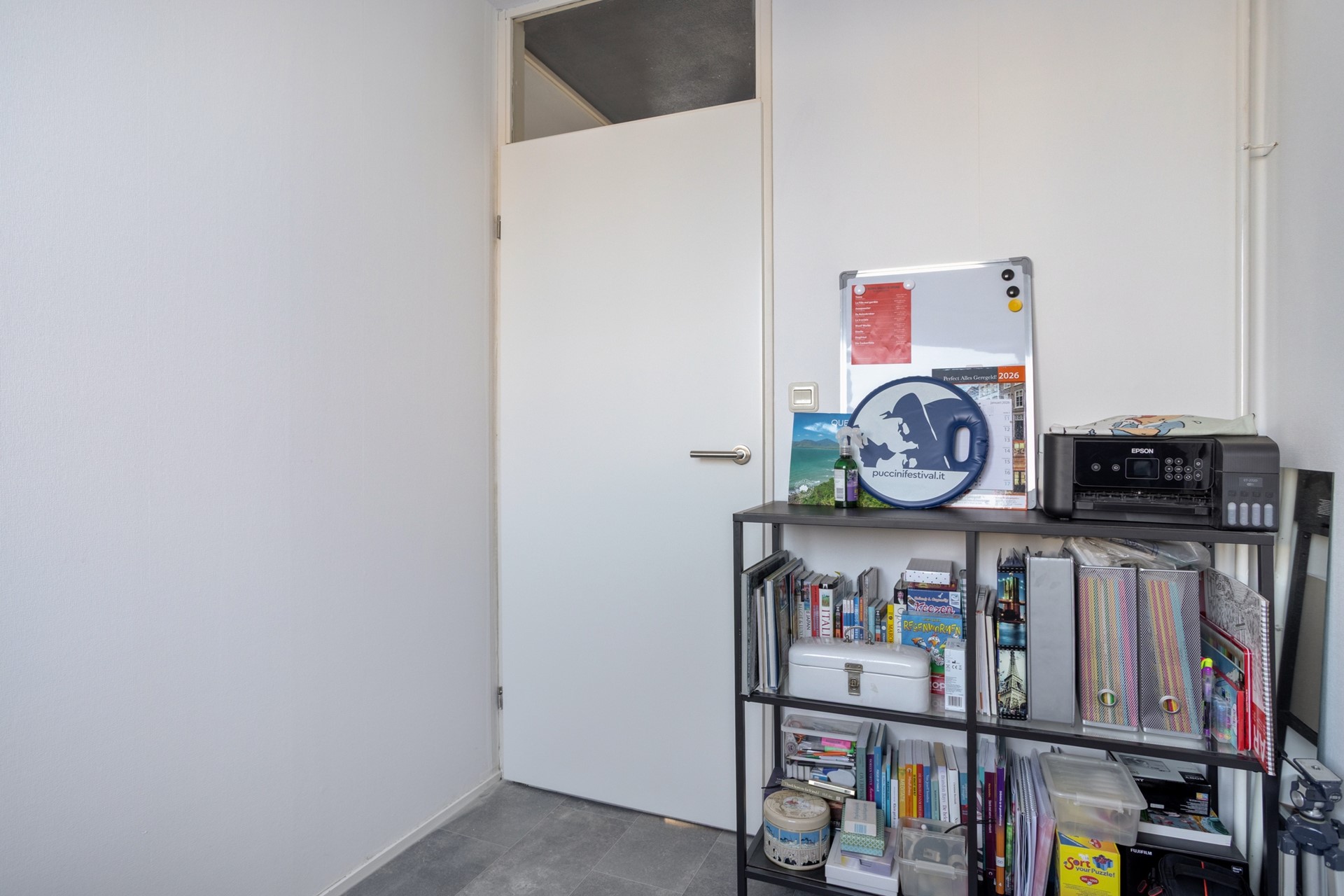 De ruimte is afgewerkt met een tegelvloer, behangen wanden en plafondplaten (Agnes).