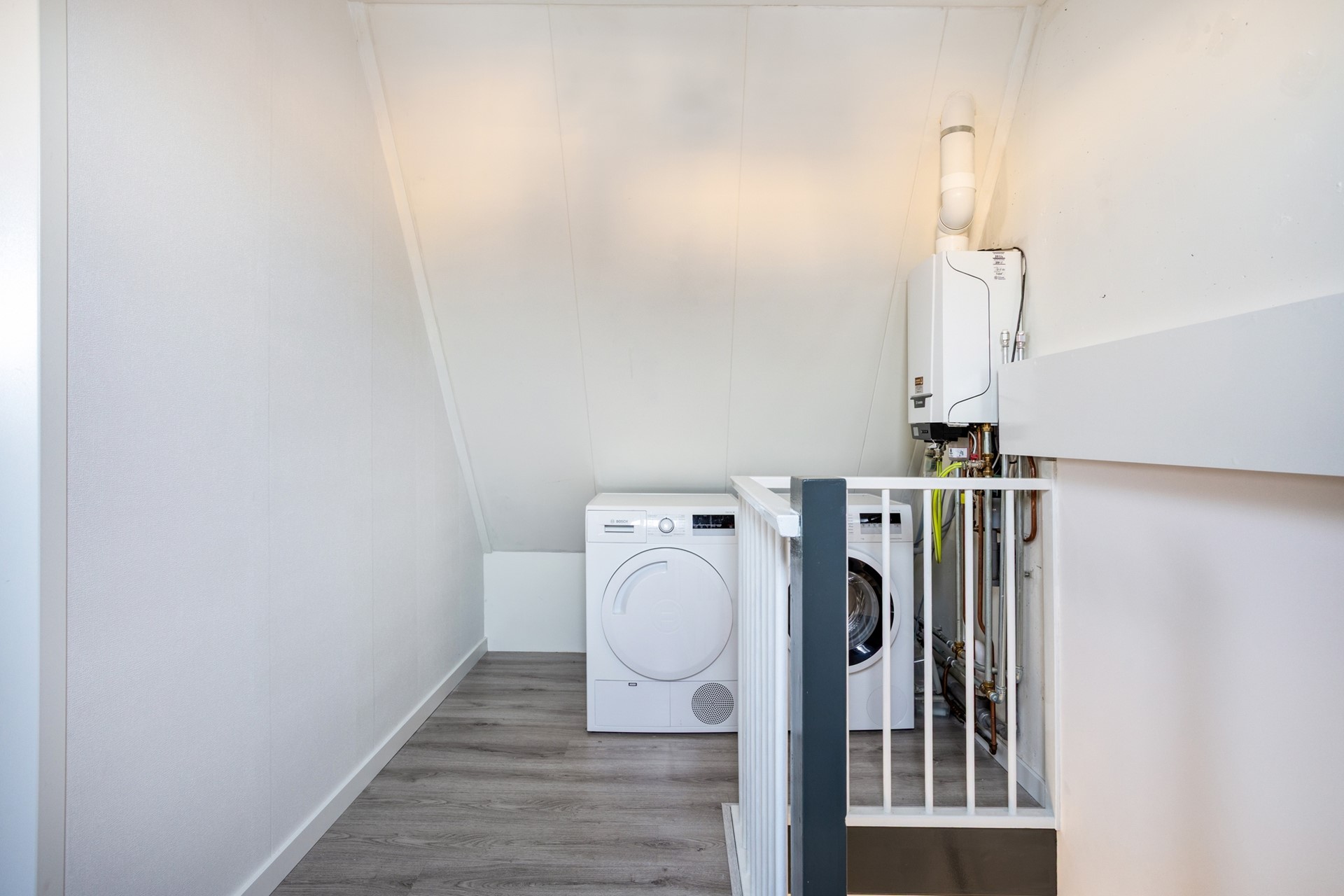 De ruime voorzolder is voorzien van een dakraam aan de achterzijde. Hier bevinden zich de opstelplaats voor de cv-ketel, de aansluitingen voor wasmachine en droger en de omvormer voor de zonnepanelen. Je hebt hier alle ruimte om je spullen en verzamelingen op te bergen.