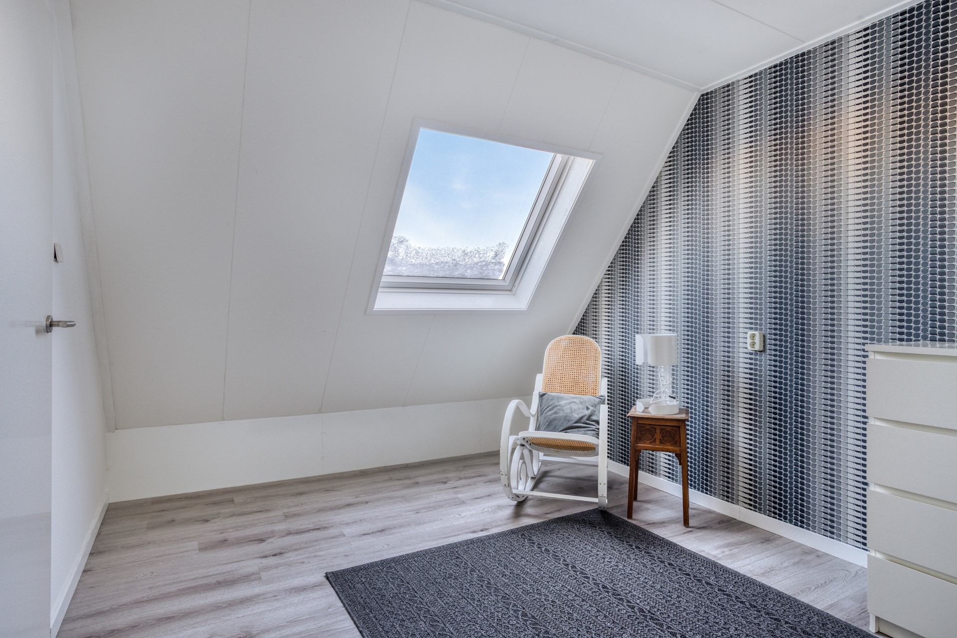 De ruimte is afgewerkt met een grenenhoutenvloer, behangen wanden en een spuitwerk plafond.